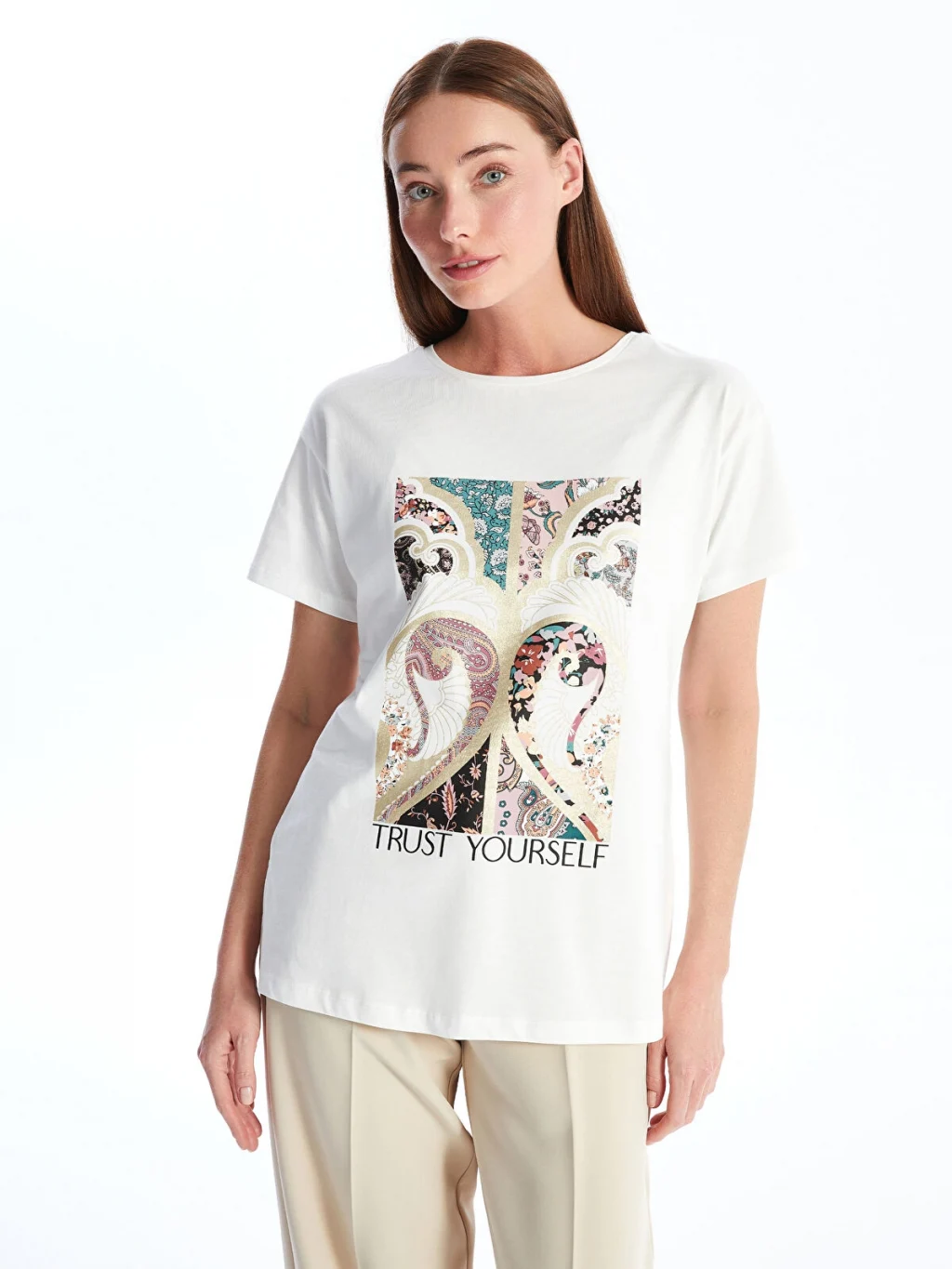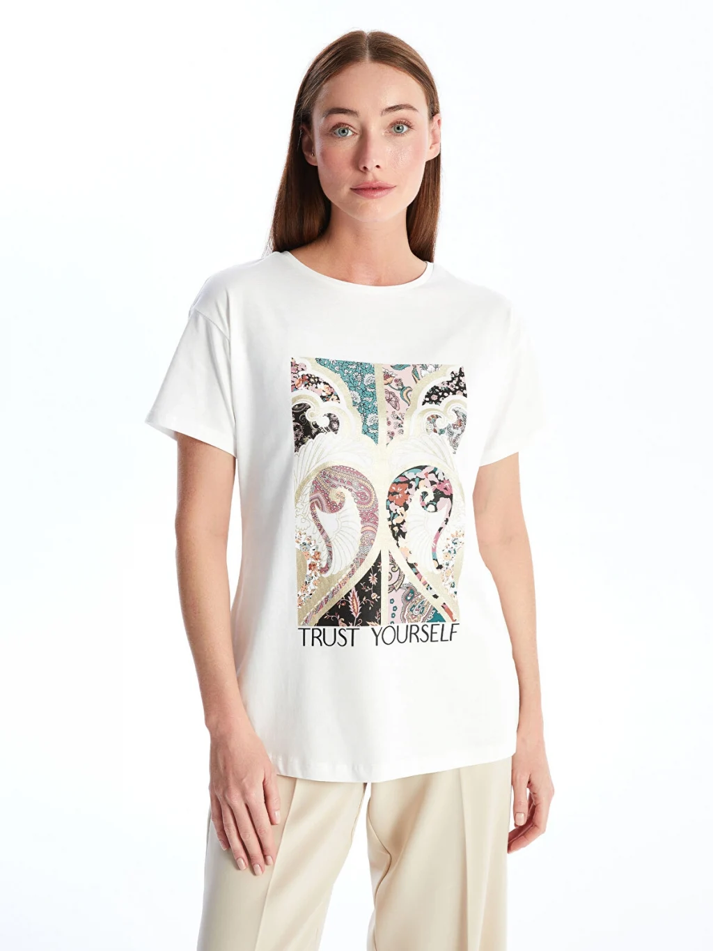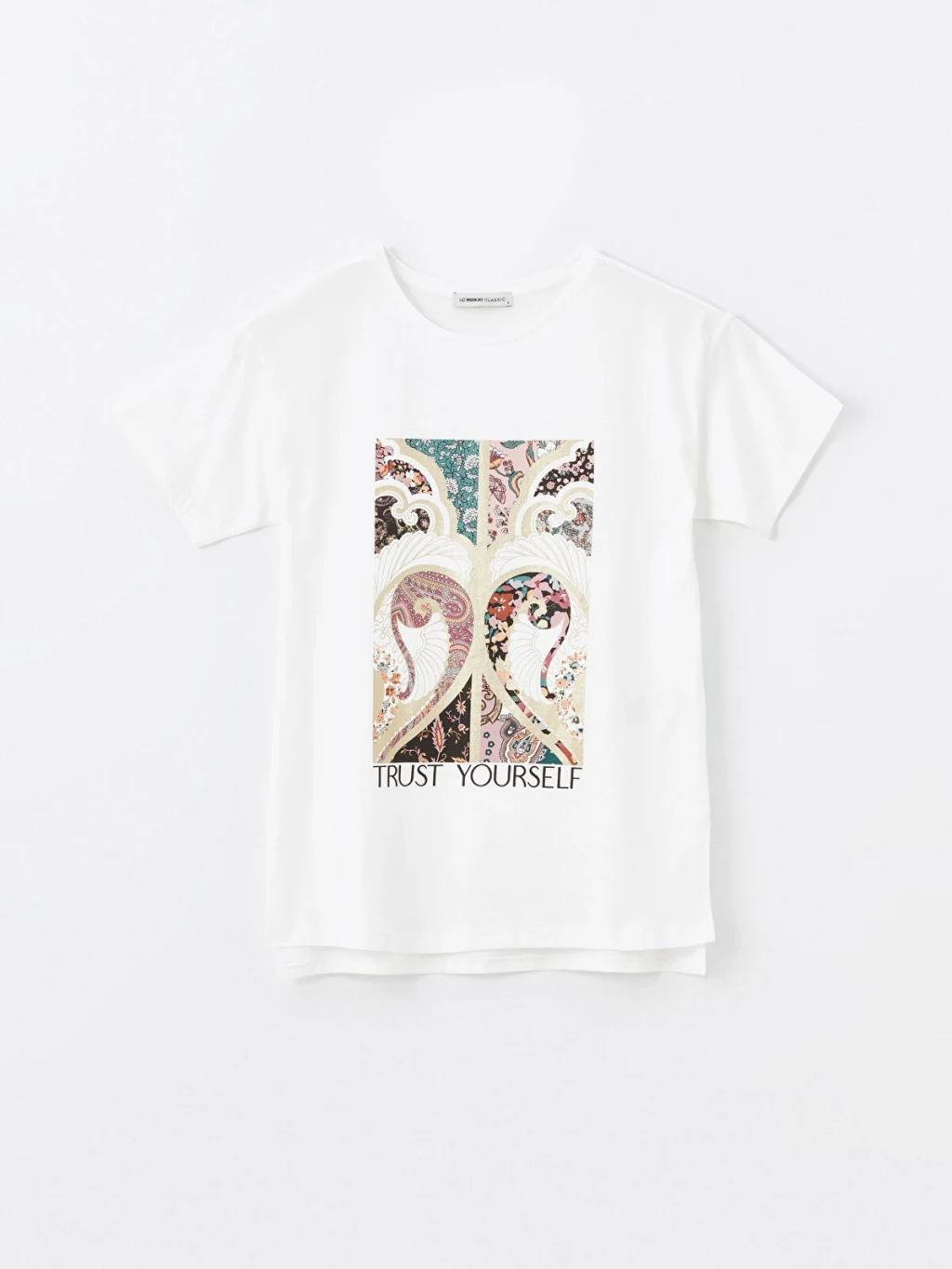 Bisiklet yaka, kısa kollu kadın tişört, %100 pamuklu penye kumaştan üretilmiştir. Önü slogan ve desen baskılı, etek ucu çift katlıdır.