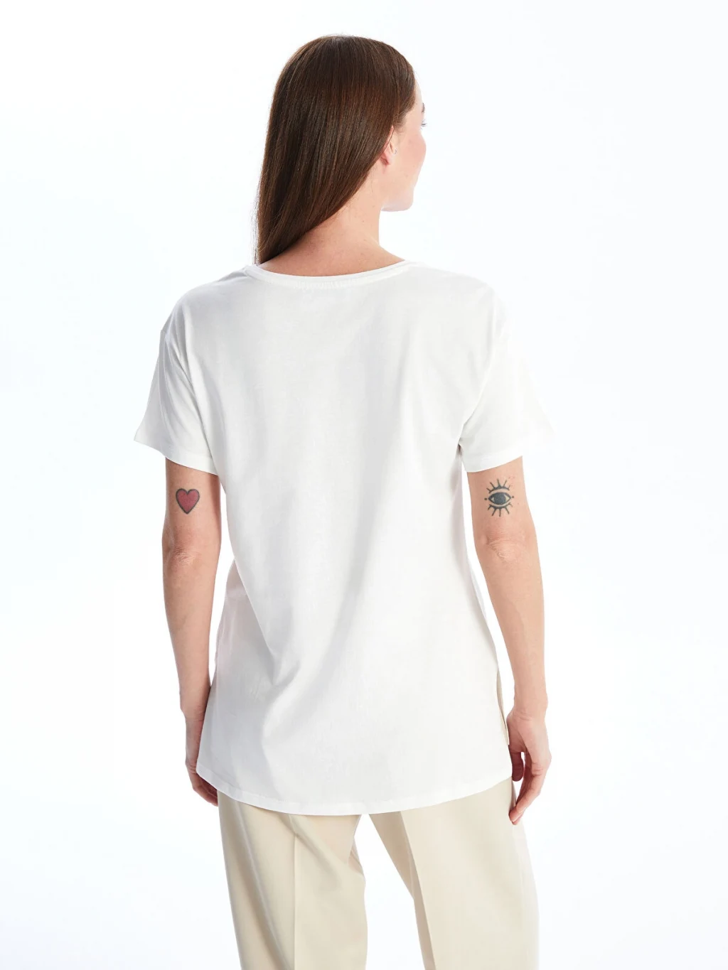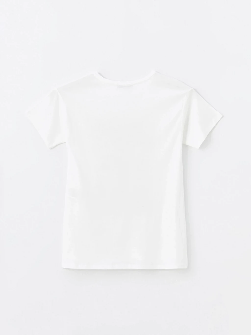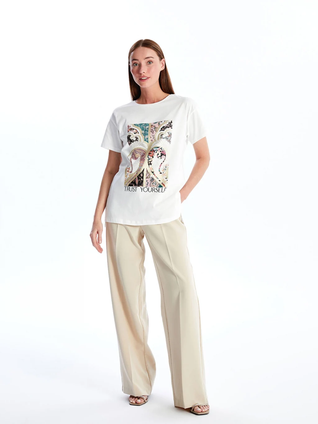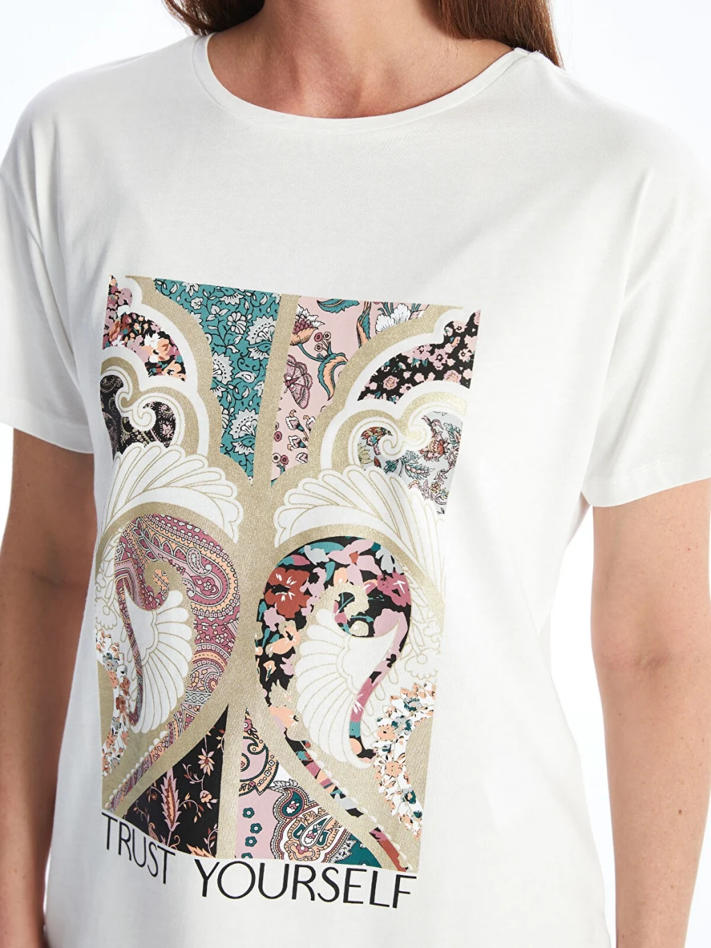 Bisiklet yaka, kısa kollu kadın tişört, %100 pamuklu penye kumaştan üretilmiştir. Önü slogan ve desen baskılı, etek ucu çift katlıdır.