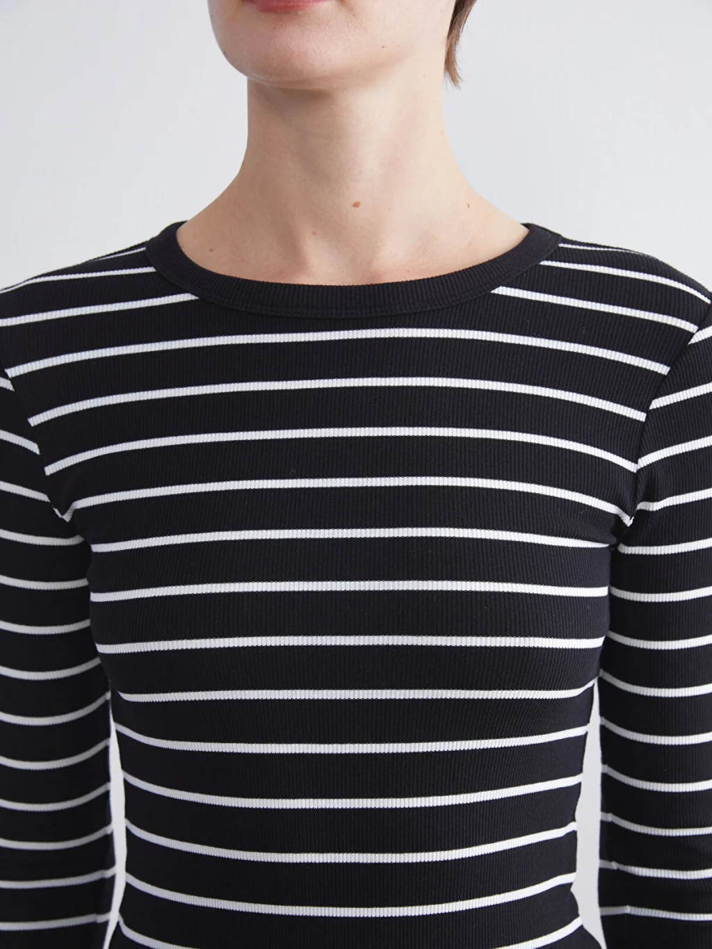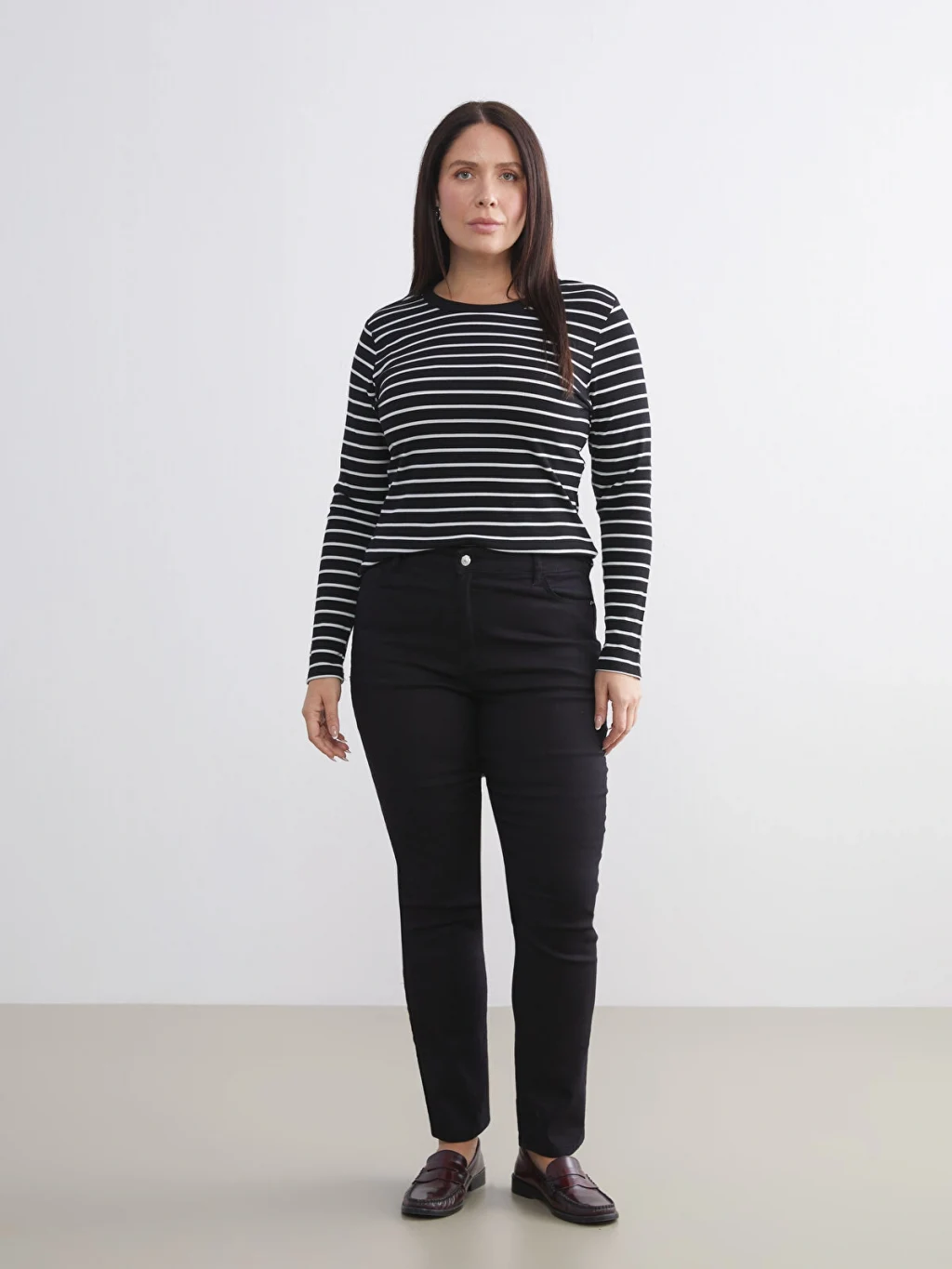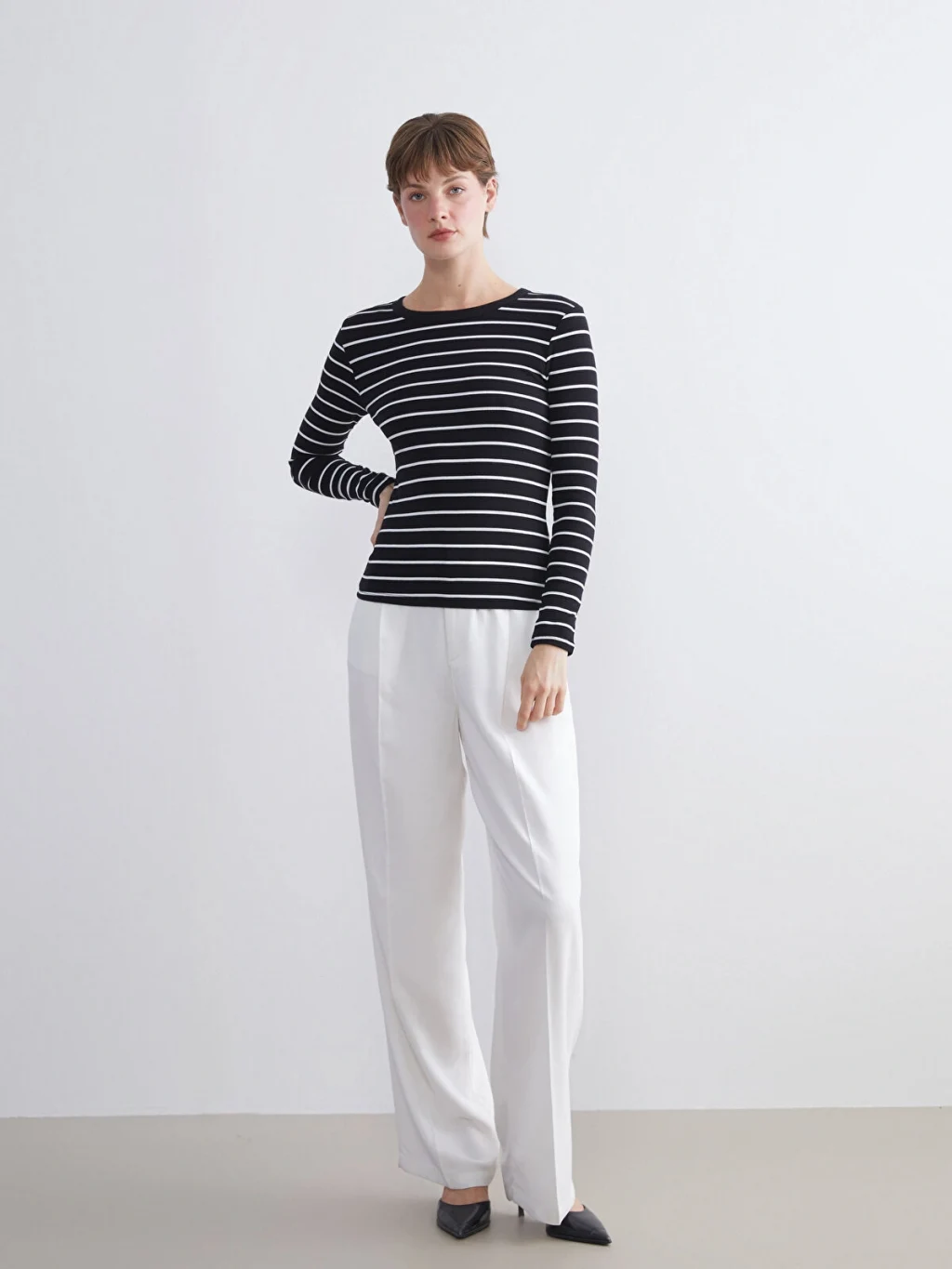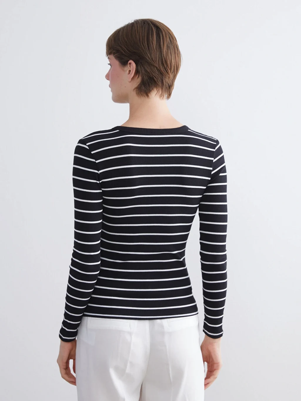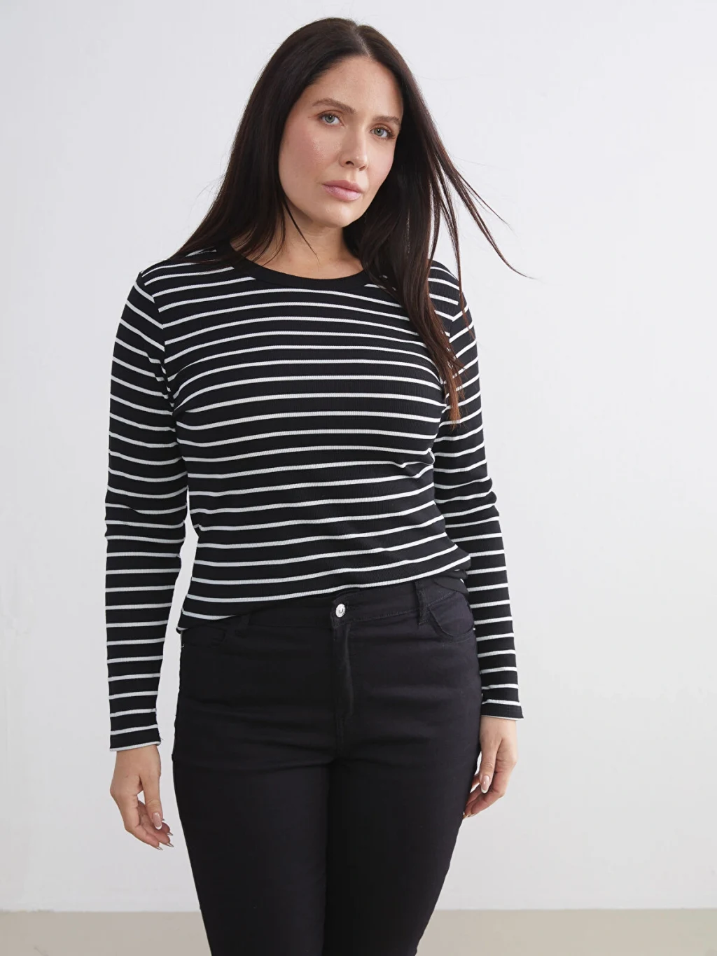 Ekstra dar kalıplı, çizgili, bisiklet yaka ve uzun kollu kadın tişört, yüksek pamuk içerikli penye kumaştan üretilmiştir.