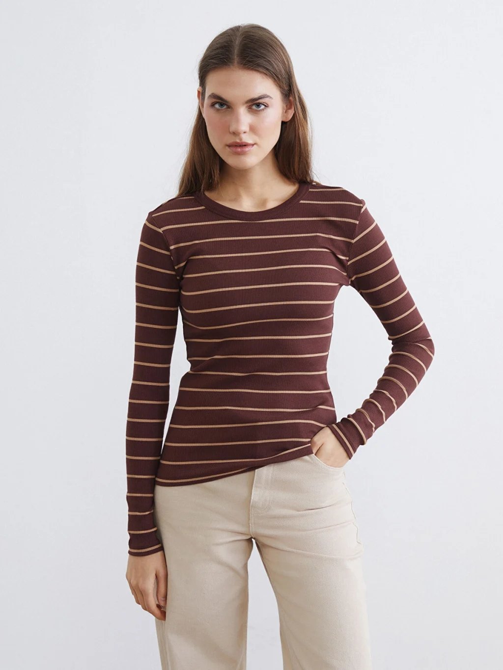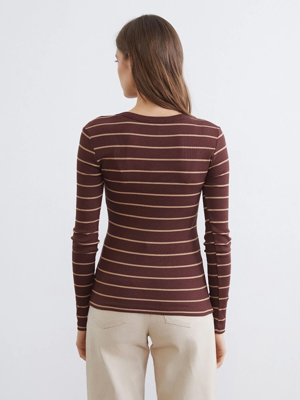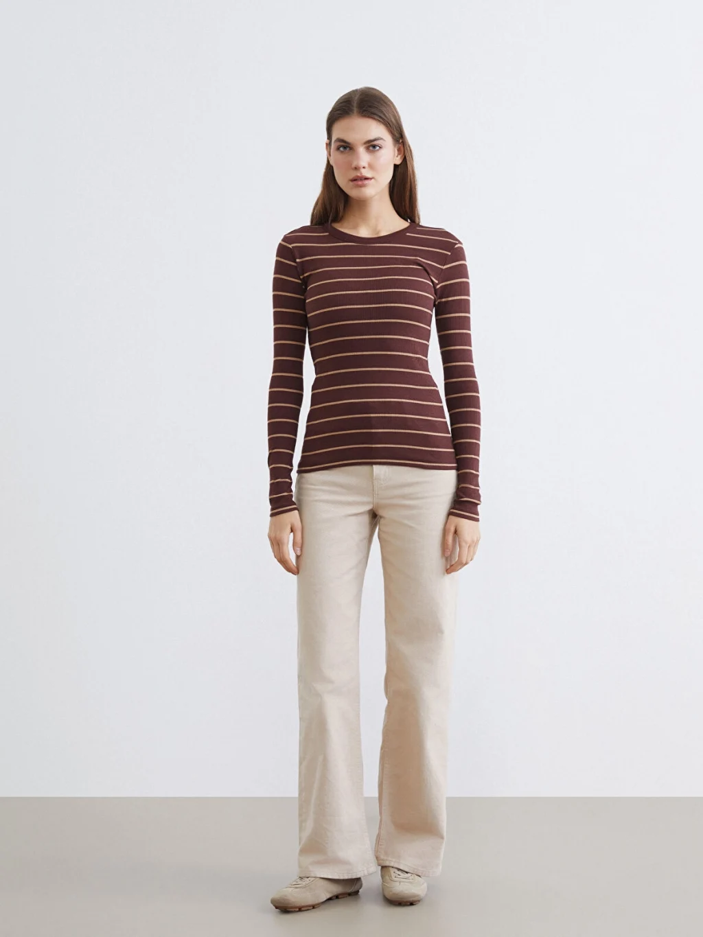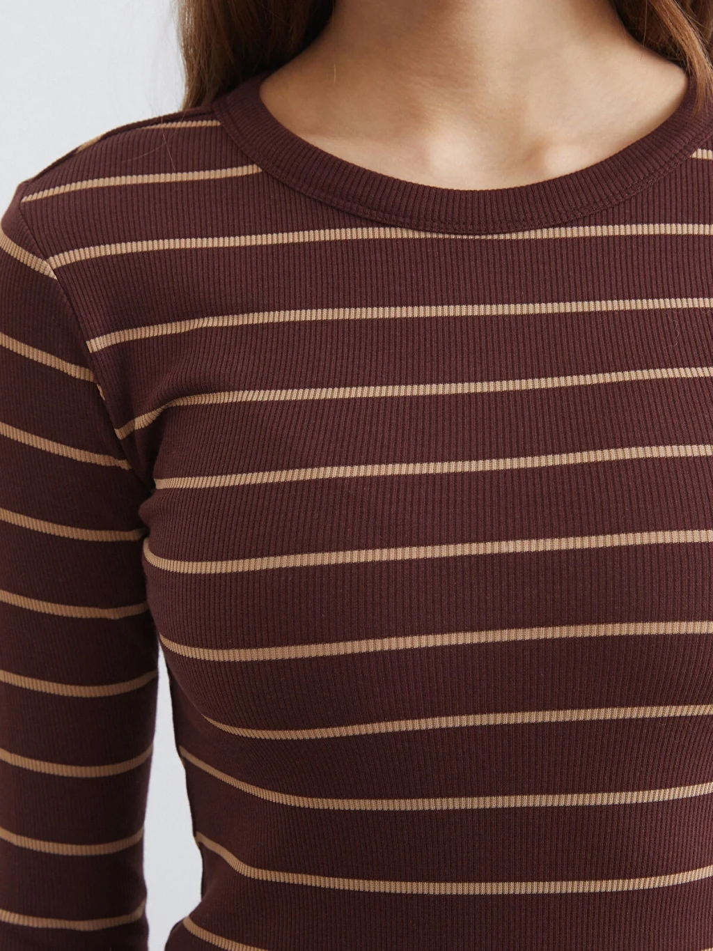 Bisiklet yaka ve uzun kollu kadın body, çizgili desenlidir. Yüksek pamuk içerikli kumaştan üretilmiş olup, ekstra dar kalıplıdır.