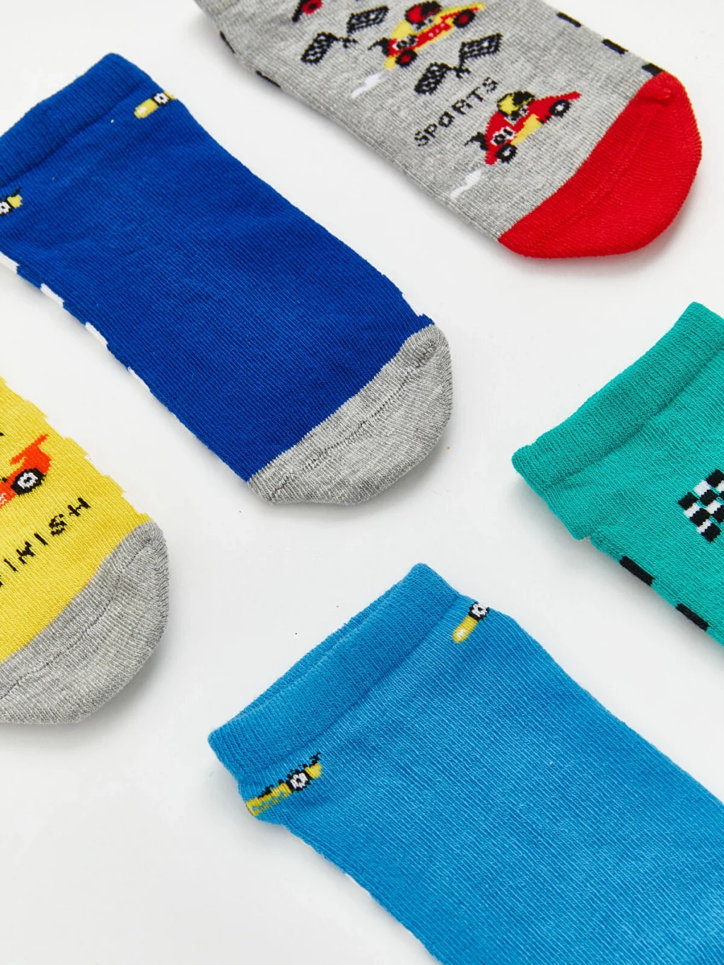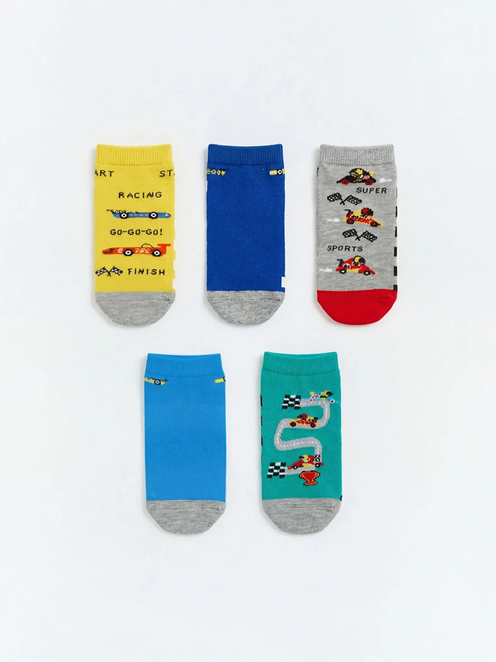 Erkek çocuk için tasarlanmış, farklı desenlere sahip patik çoraplar beşli paket halinde sunulmaktadır.
