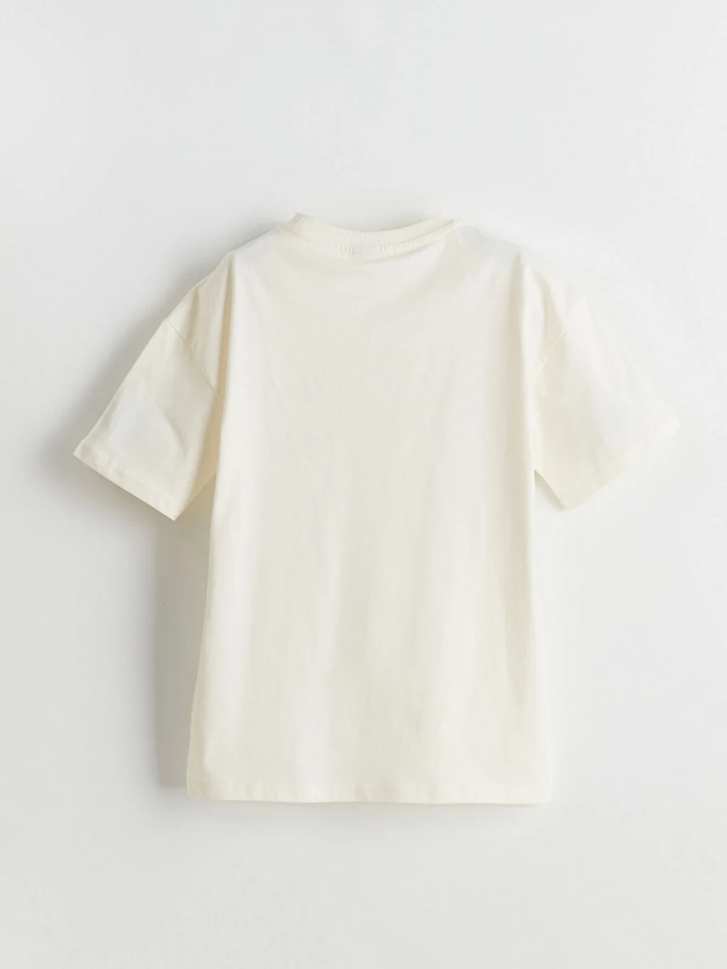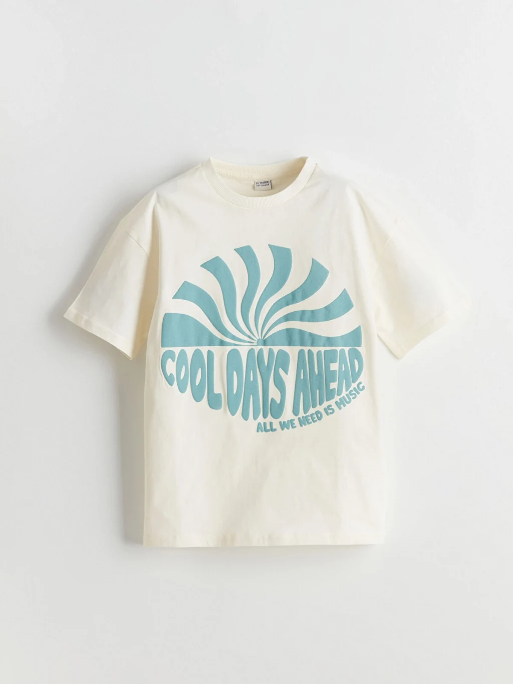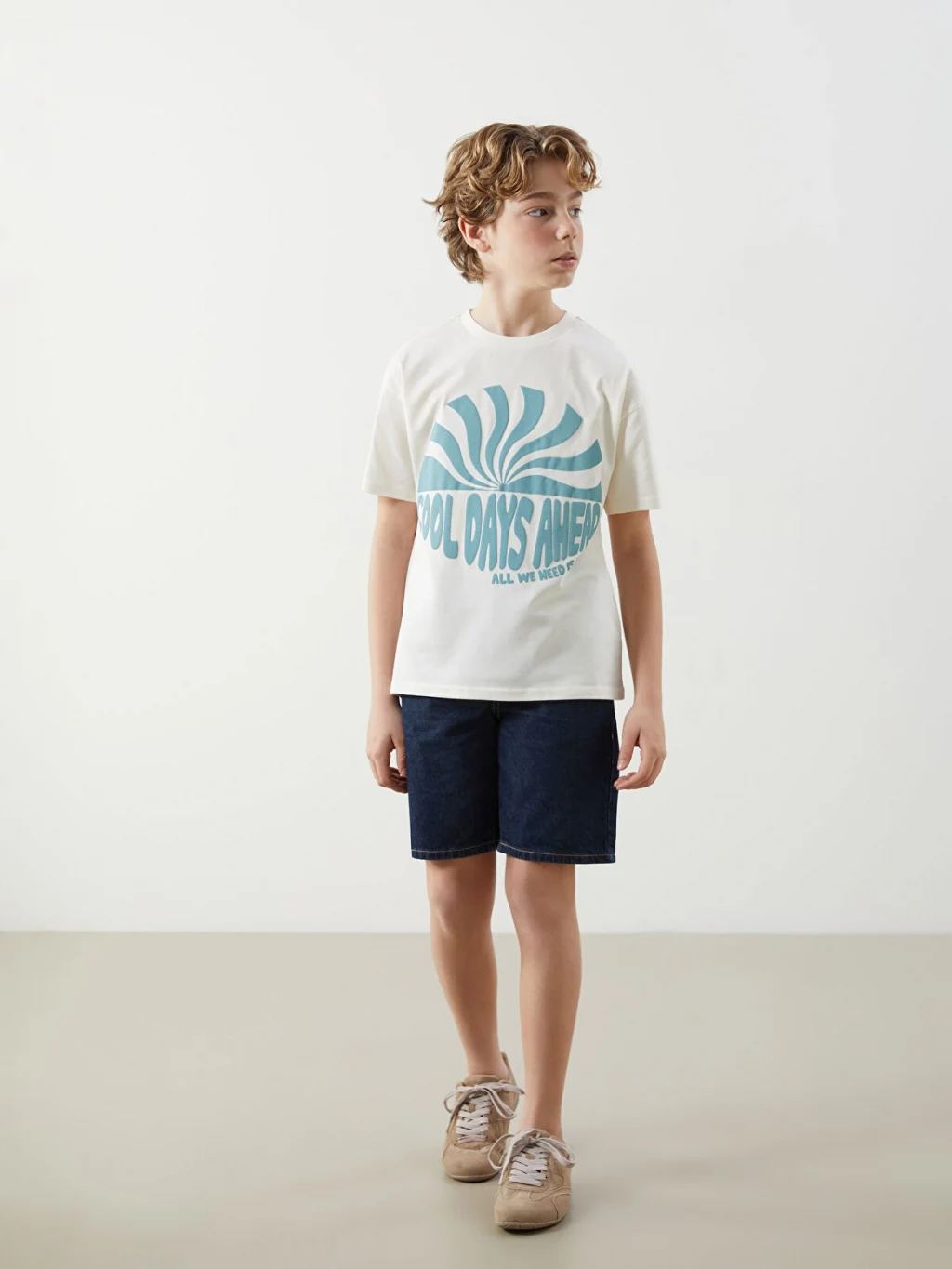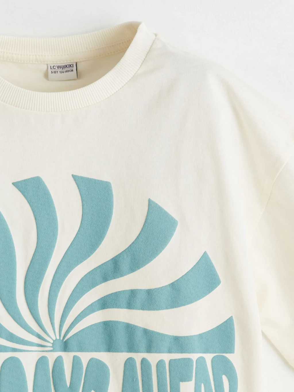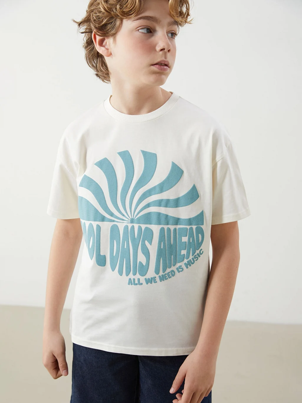 Bisiklet yaka, kısa kollu erkek çocuk tişört, %100 pamuklu penye kumaştan üretilmiştir. Bol kalıplıdır ve önü grafik baskılıdır.