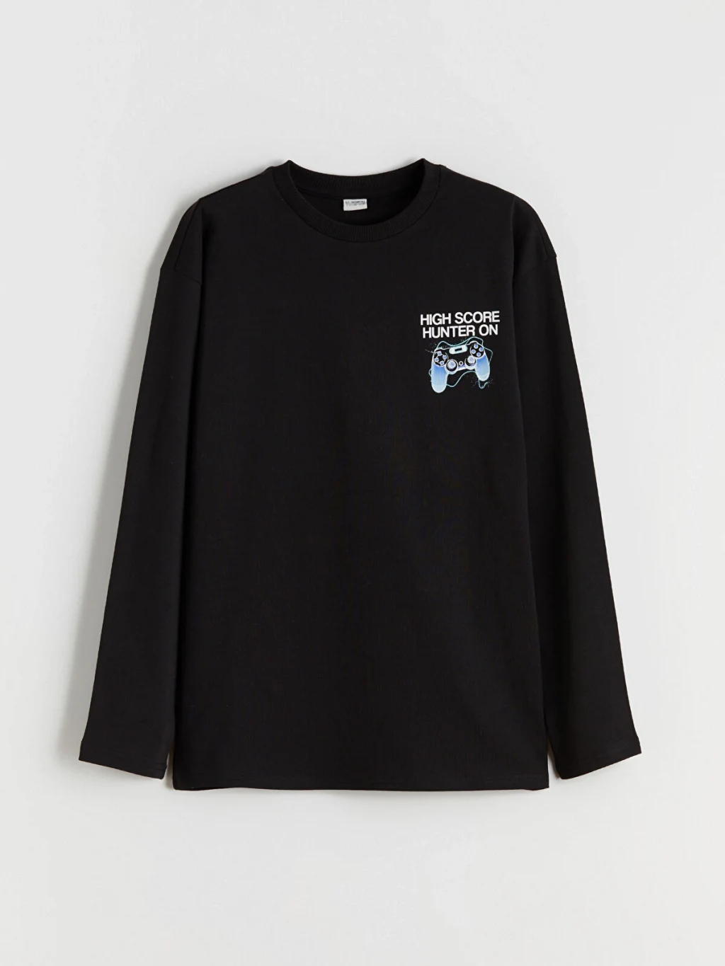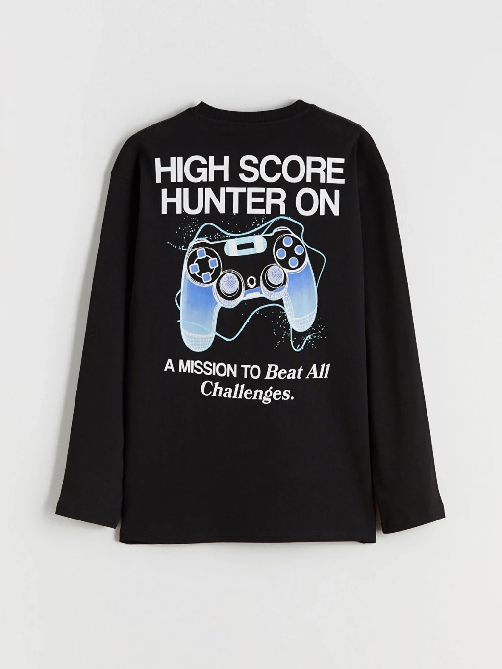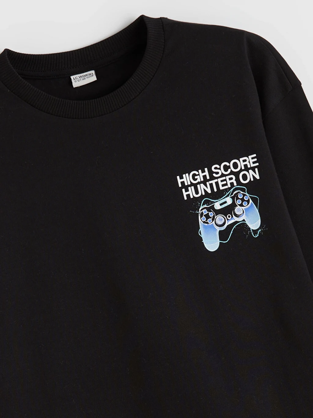 Önü ve arkası baskılı erkek çocuk tişört, pamuklu kumaştan üretilmiştir. Bisiklet yaka ve uzun kollu tasarımlıdır.