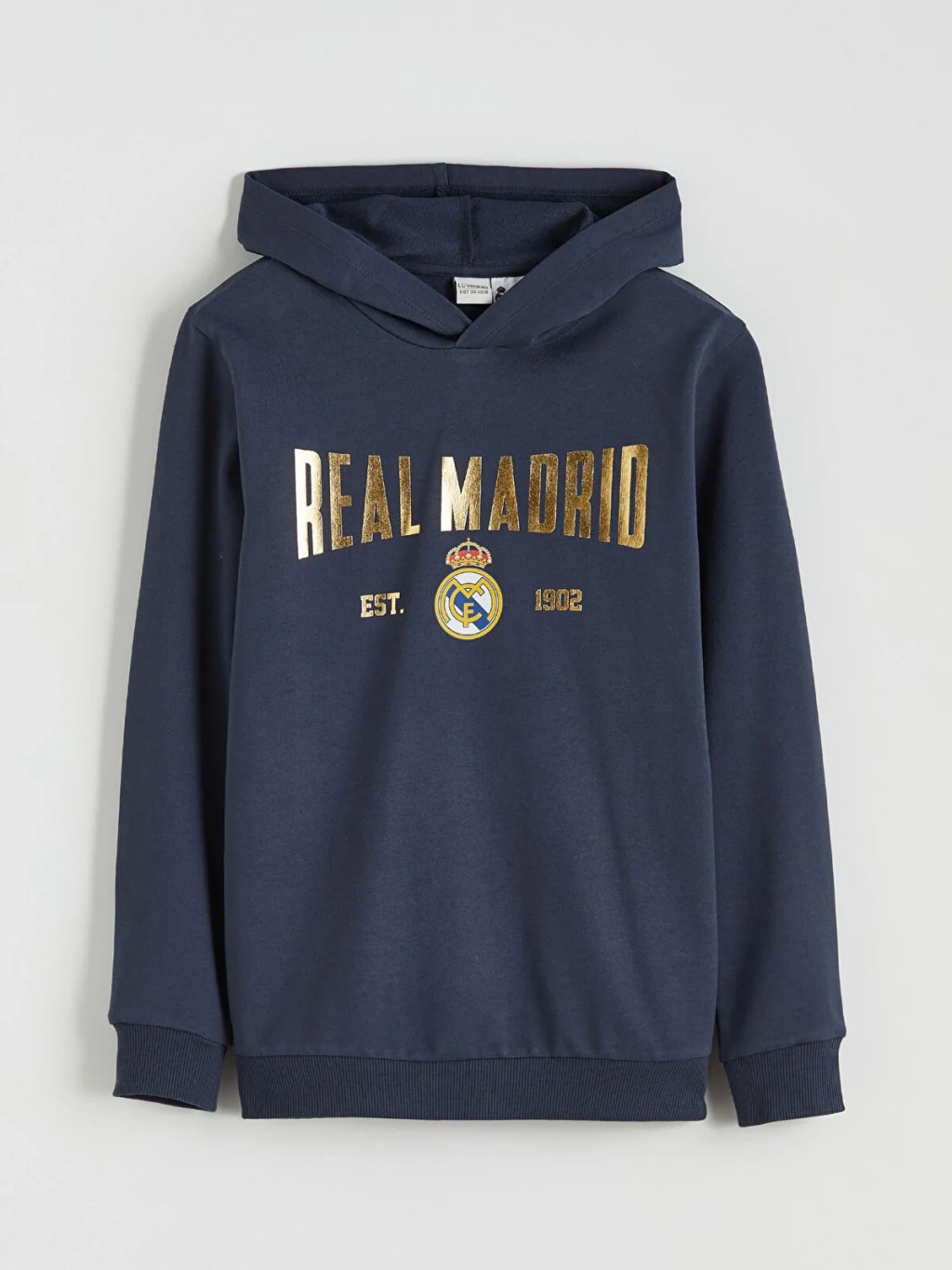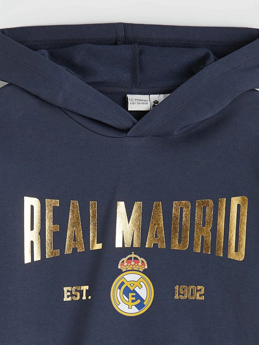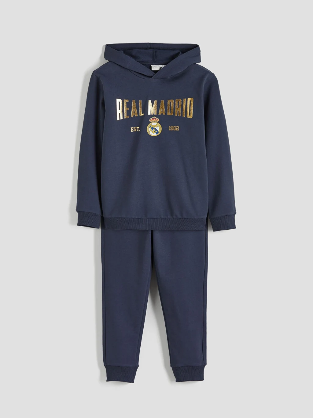 Real Madrid lisanslı erkek çocuk eşofman takımı, kapüşonlu uzun kollu sweatshirt ve beli lastikli, paçaları ribanalı eşofman alttan oluşur.