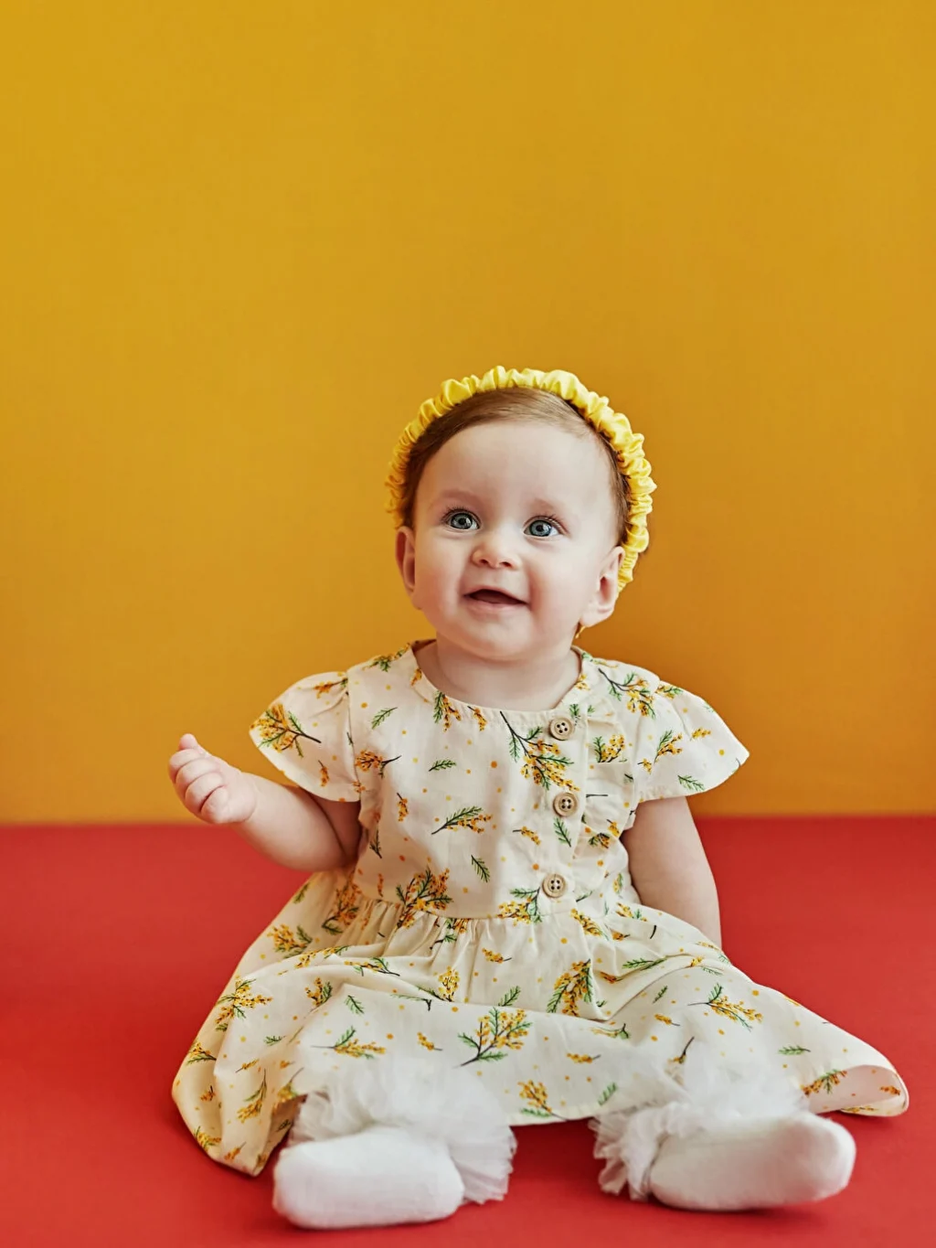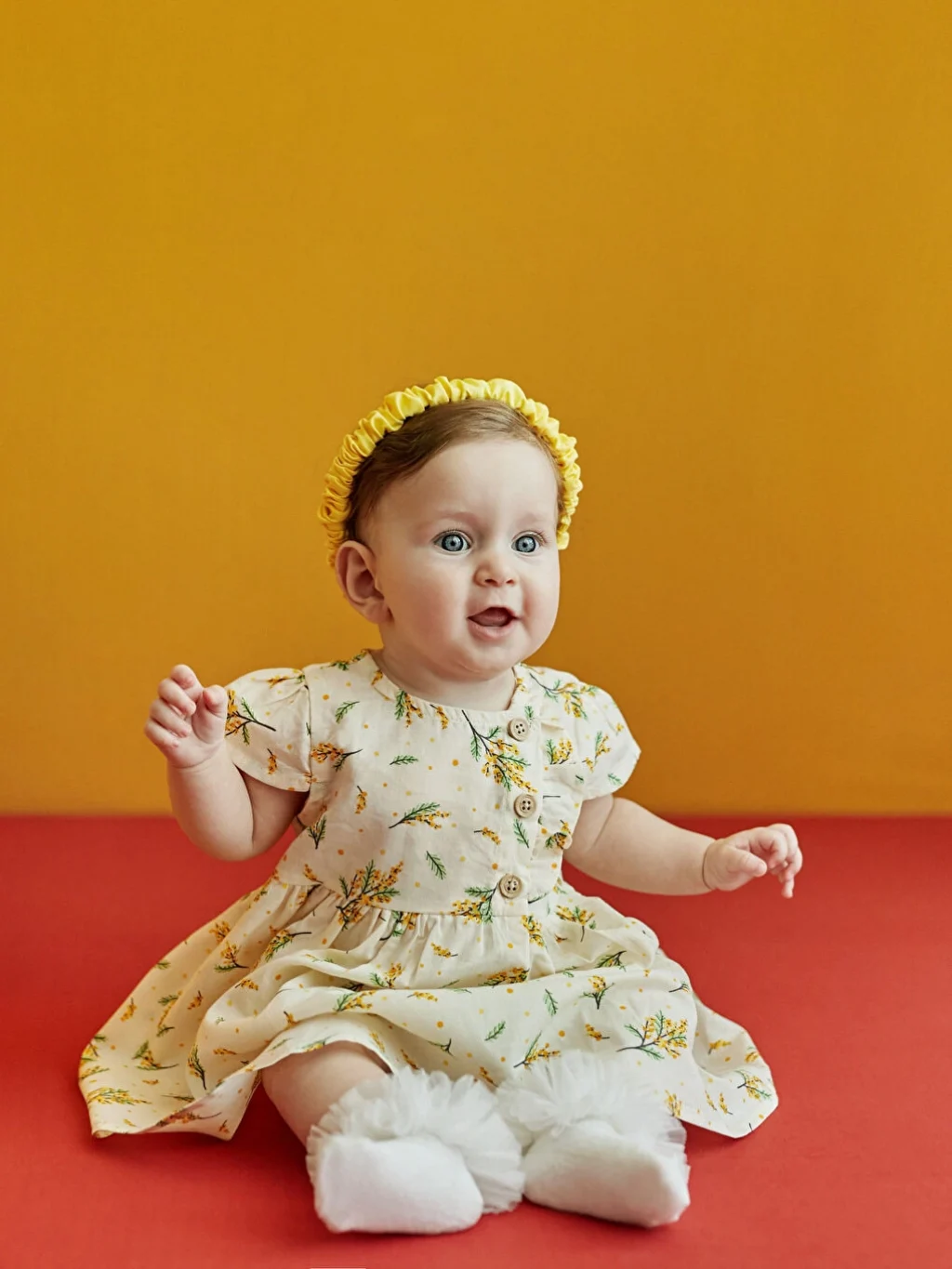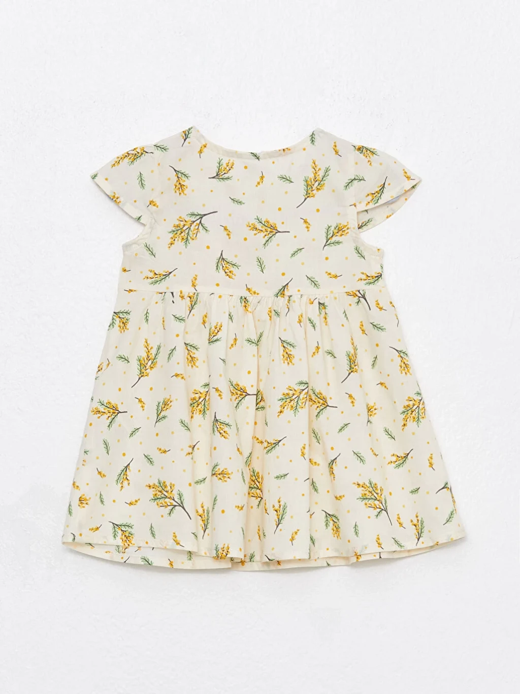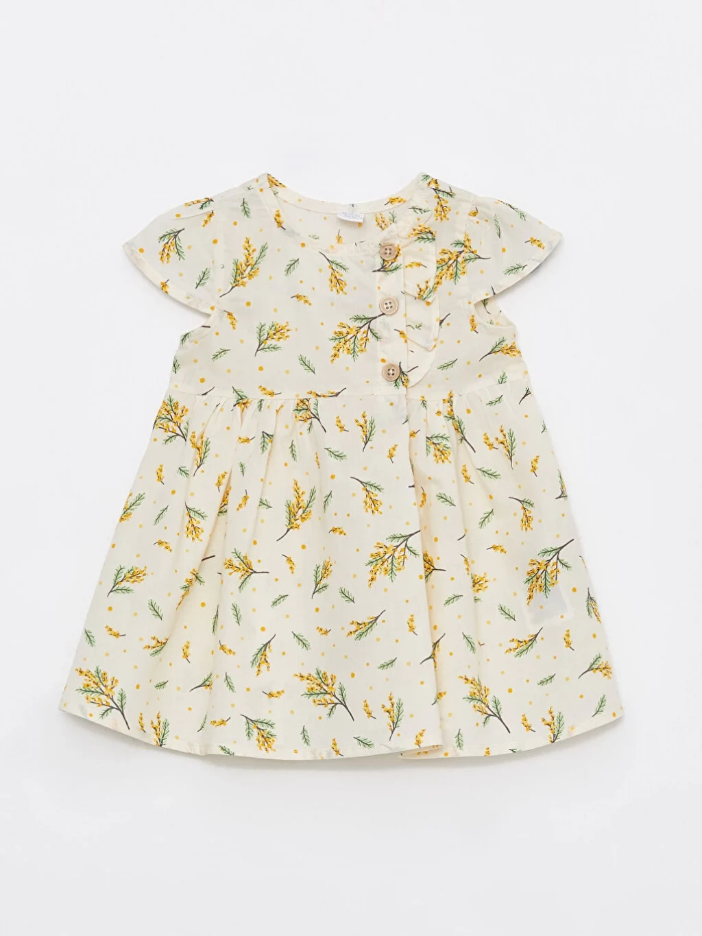 %100 pamuklu kumaştan kız bebek elbise, renk ve baskılarıyla kız bebek giyiminde şıklığın temsilcilerindendir. Kısa kollu elbiseninin yakası önden düğme kapamalıdır. Tasarımın nefes aldıran, terletmeyen dokusu kullanım konforunu üst noktaya taşır.