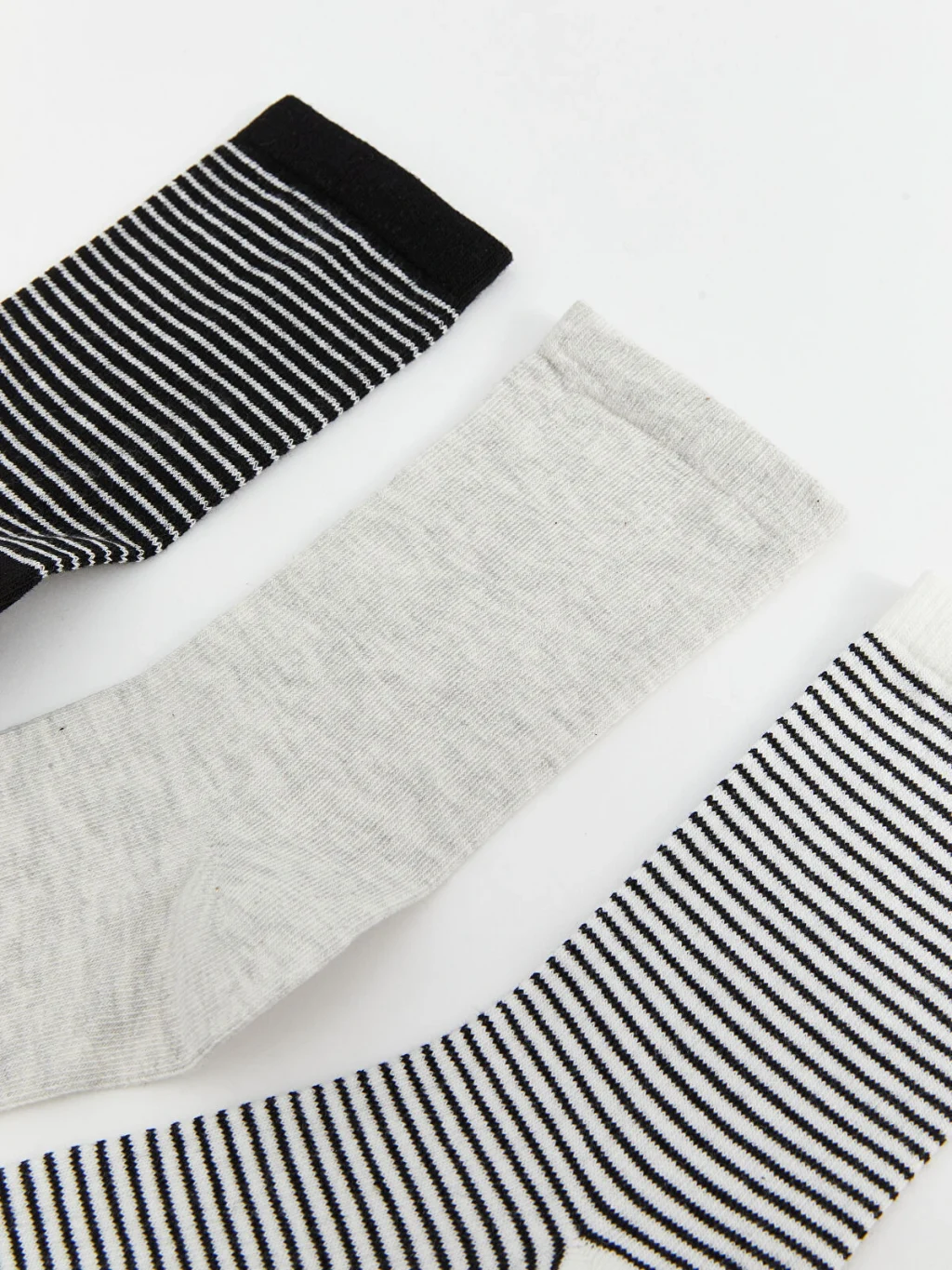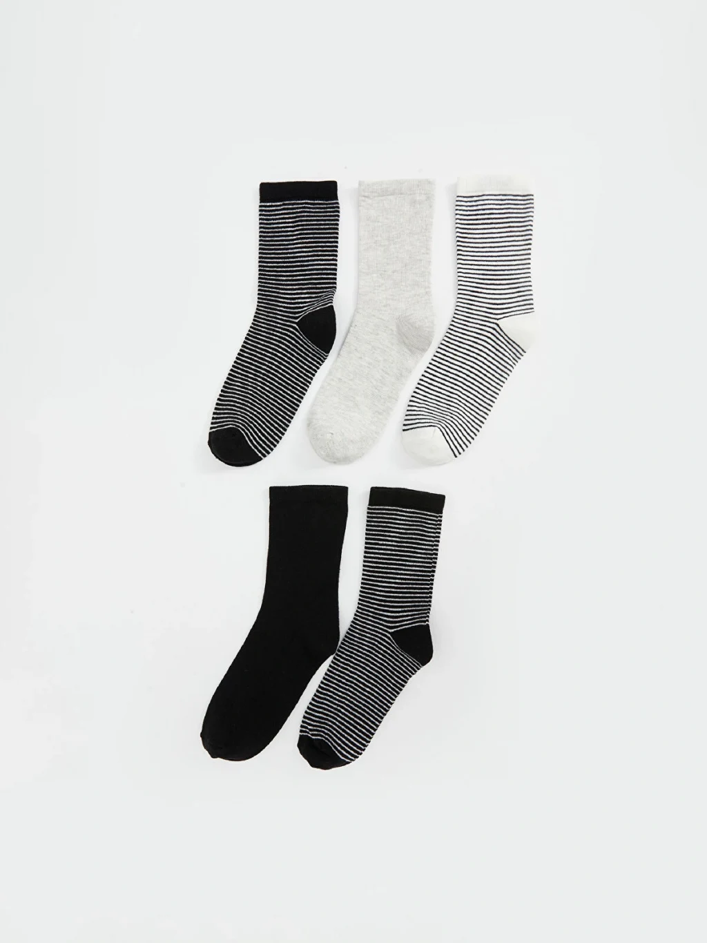 Pamuk karışımlı kumaştan üretilen soket çoraplar, yumuşak ve rahat bir dokuya sahiptir. 3 çift çizgili 2 çift düz olmak üzere ve 5 çift soket çoraptan oluşmaktadır.