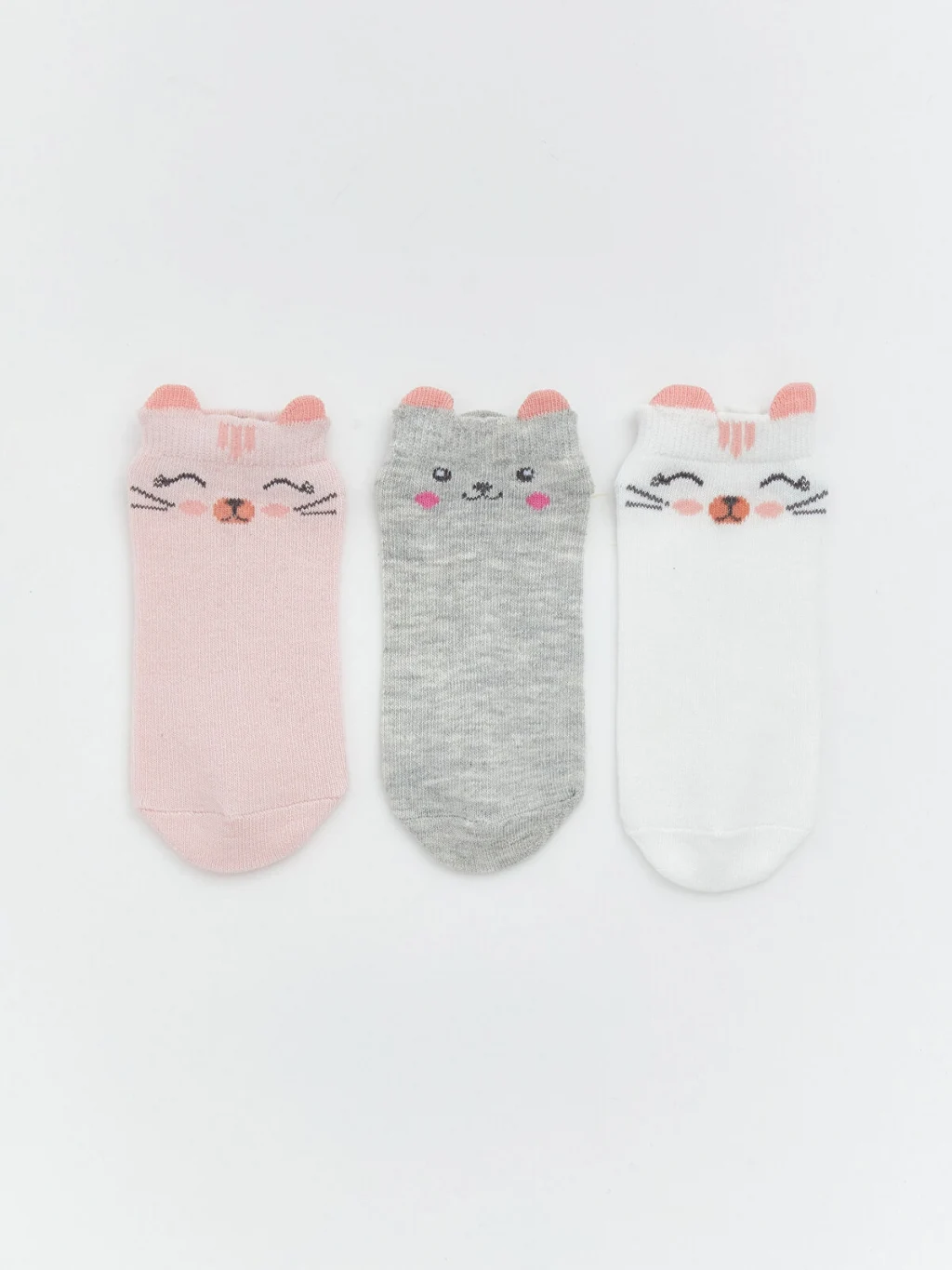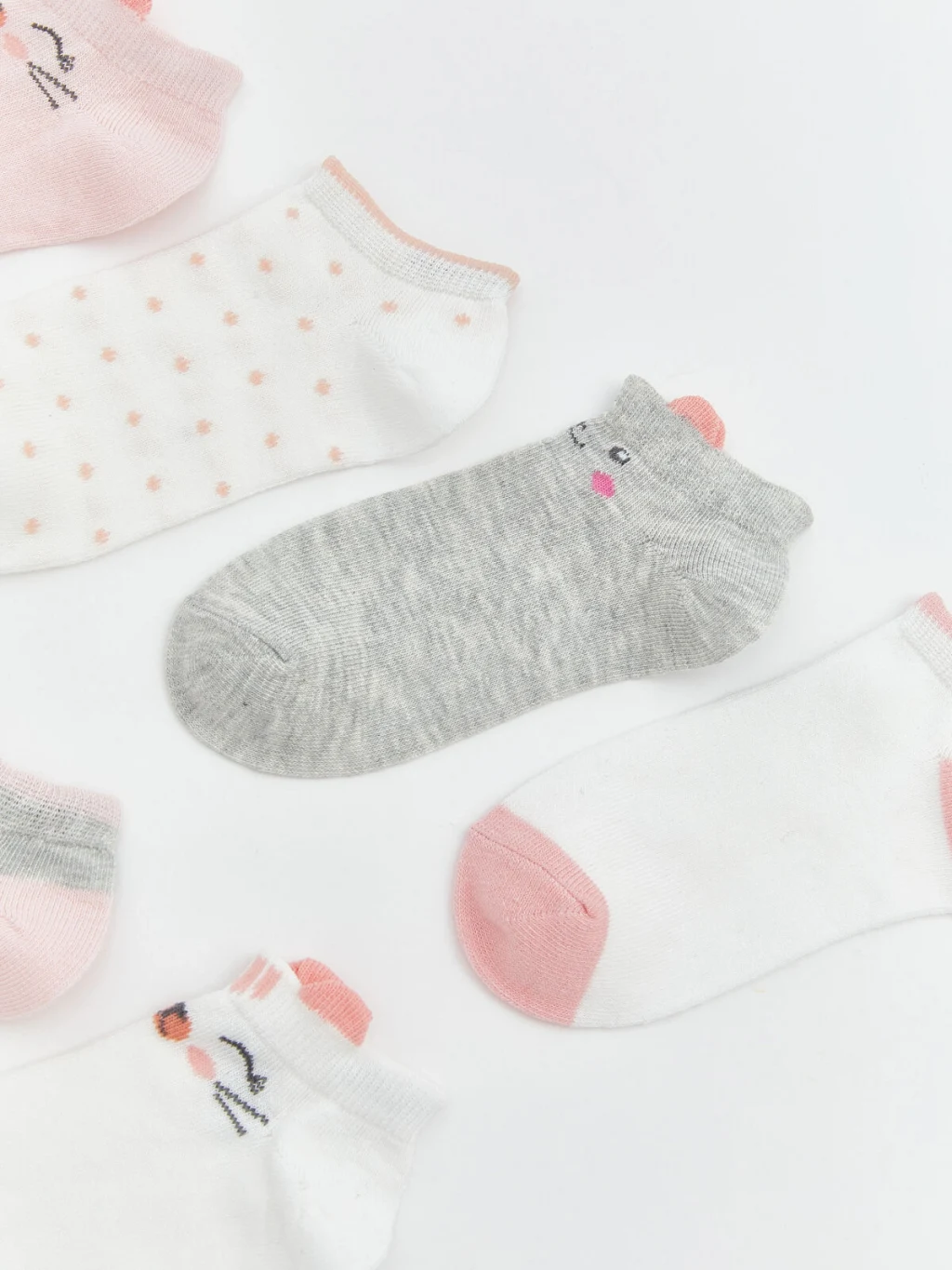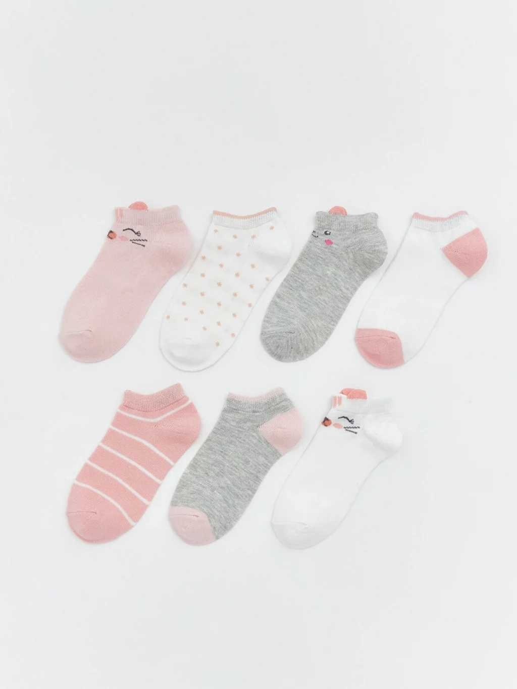 Kız çocuk için 7'li patik çorap seti; çizgili, puantiyeli ve kulak detaylı hayvan figürlü farklı desenlere sahiptir.