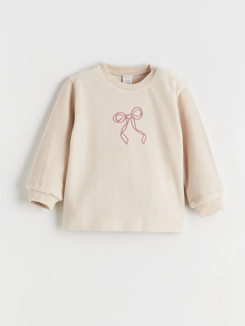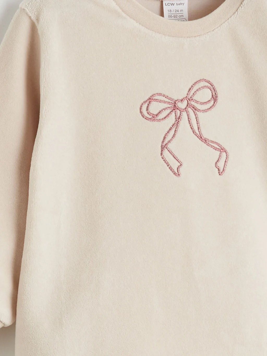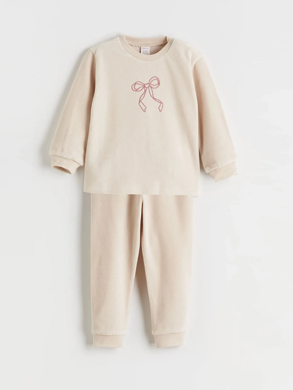 Kız bebek takımı; bisiklet yaka, uzun kollu, önü fiyonk işlemeli üst ve pantolondan oluşur. Kol ve paça uçları ribanalıdır.