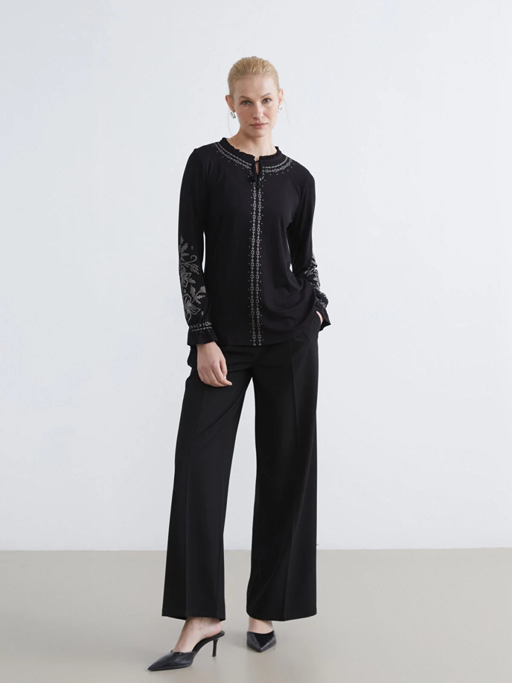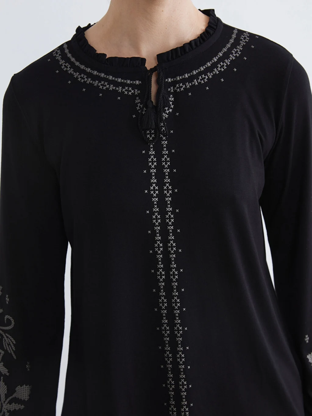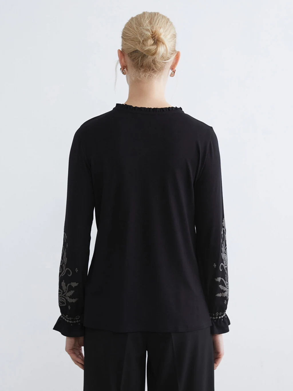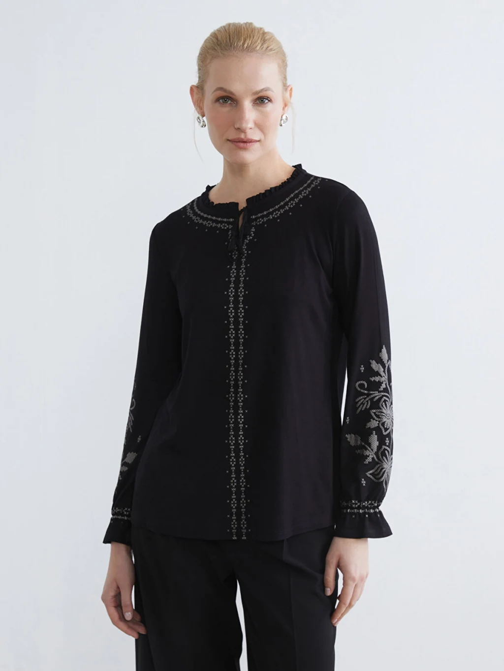 Fırfır detaylı hakim yakalı ve uzun kollu kadın tişört, nakış işlemelidir. Kol uçları fırfırlı ve önü düğme kapamalıdır.