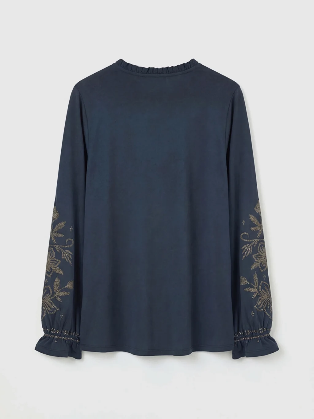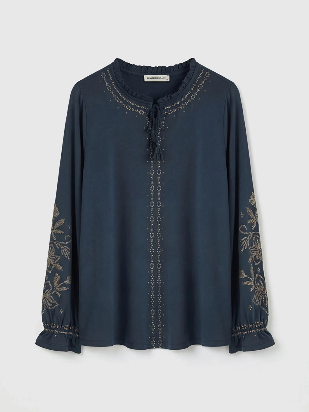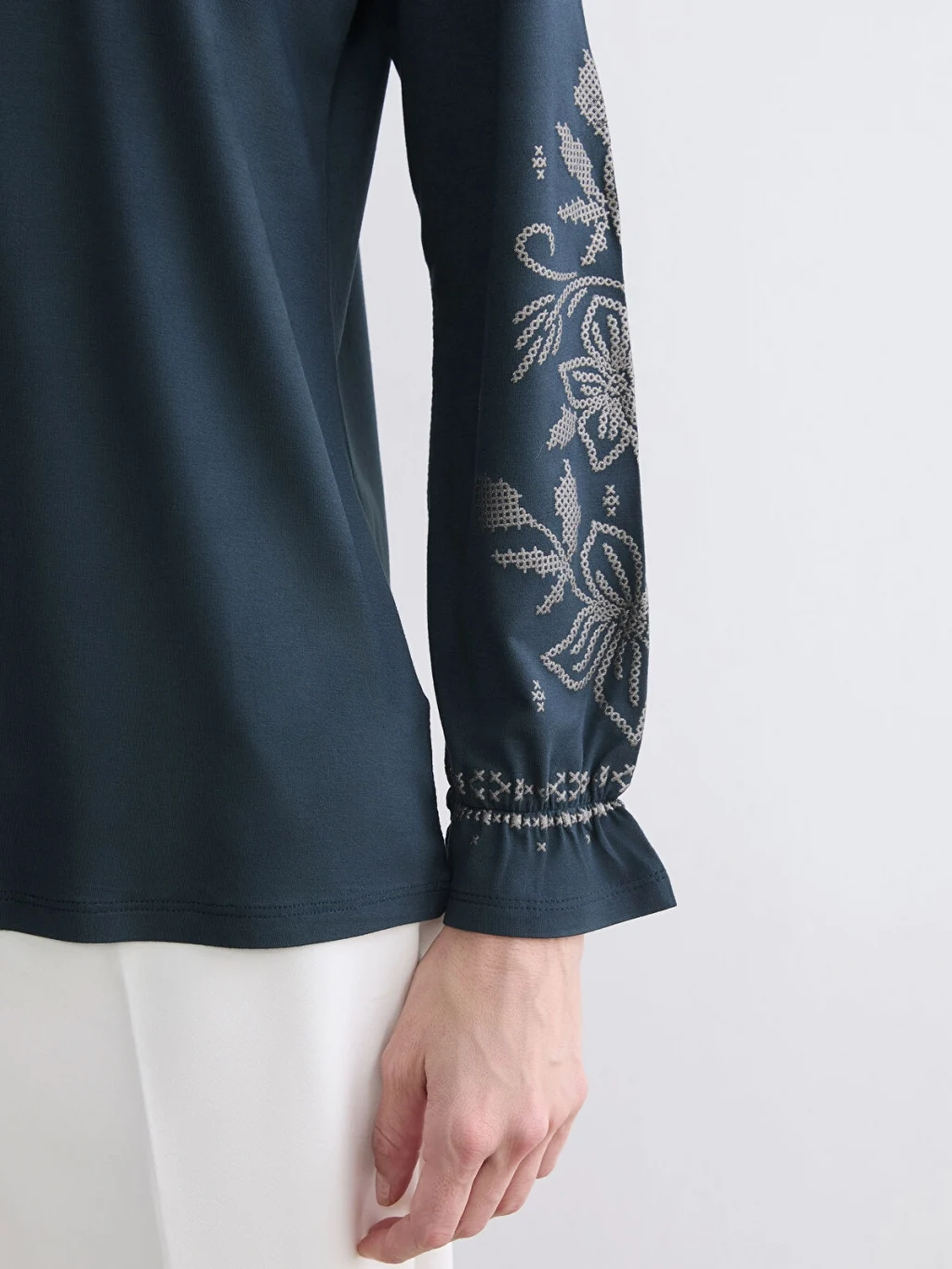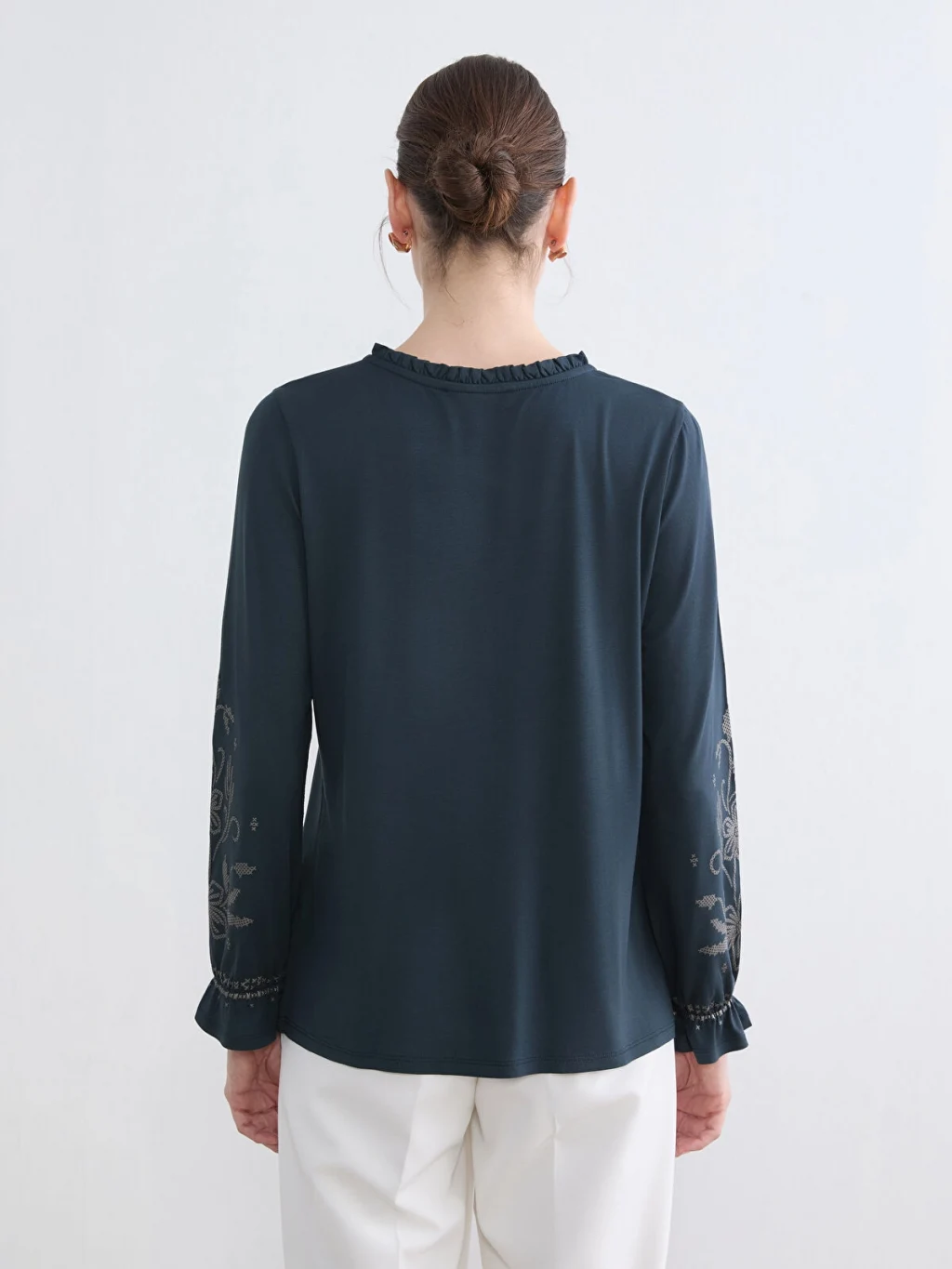 Fırfır detaylı hakim yakalı ve uzun kollu kadın tişört, nakış işlemelidir. Kol uçları fırfırlı ve önü düğme kapamalıdır.