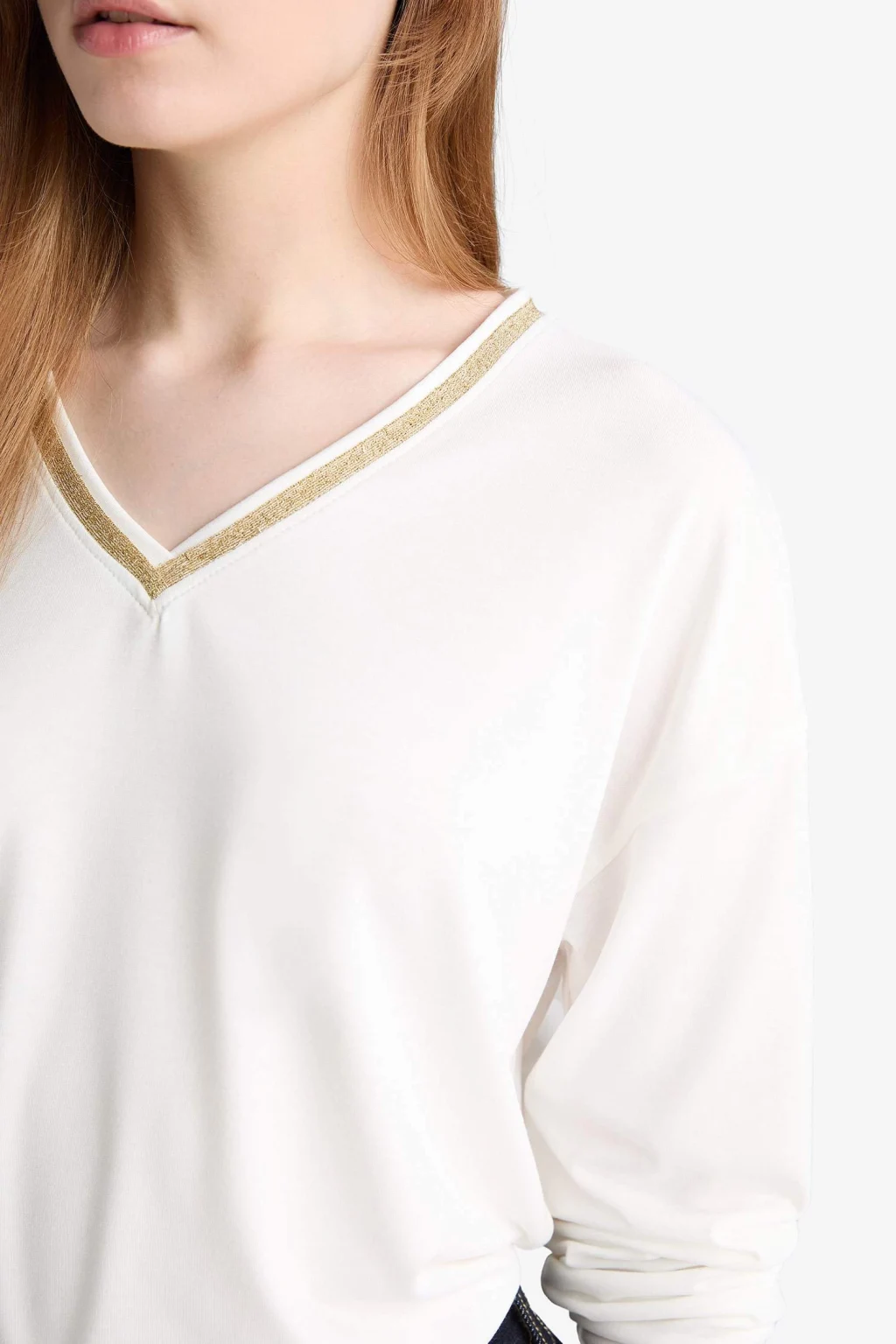 Regular fit kalıbı ve V yaka tasarımıyla bu uzun kollu tişört, şıklık ve rahatlığı bir arada sunar. Yumuşak kumaşıyla günlük kullanım için ideal bir tercih.