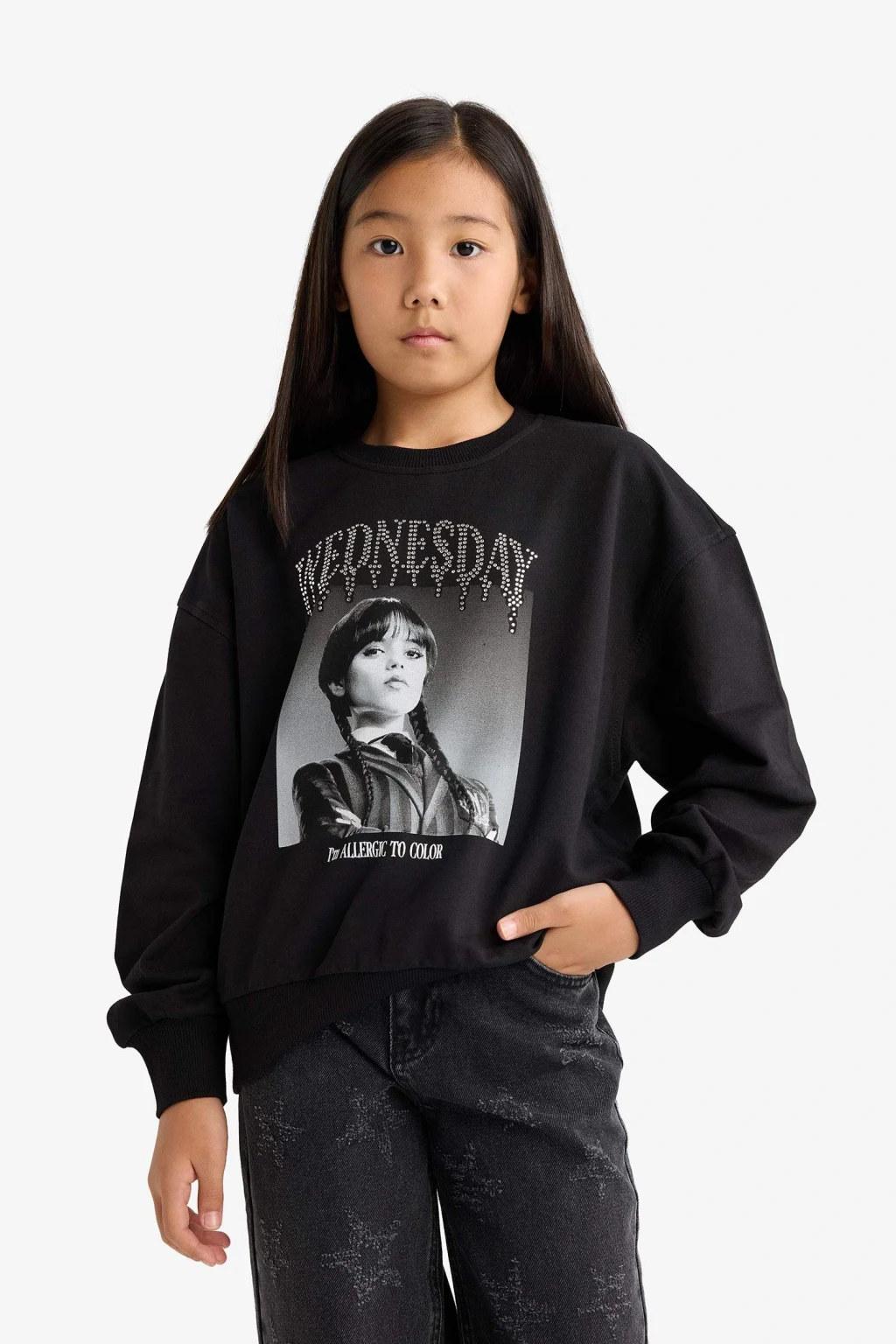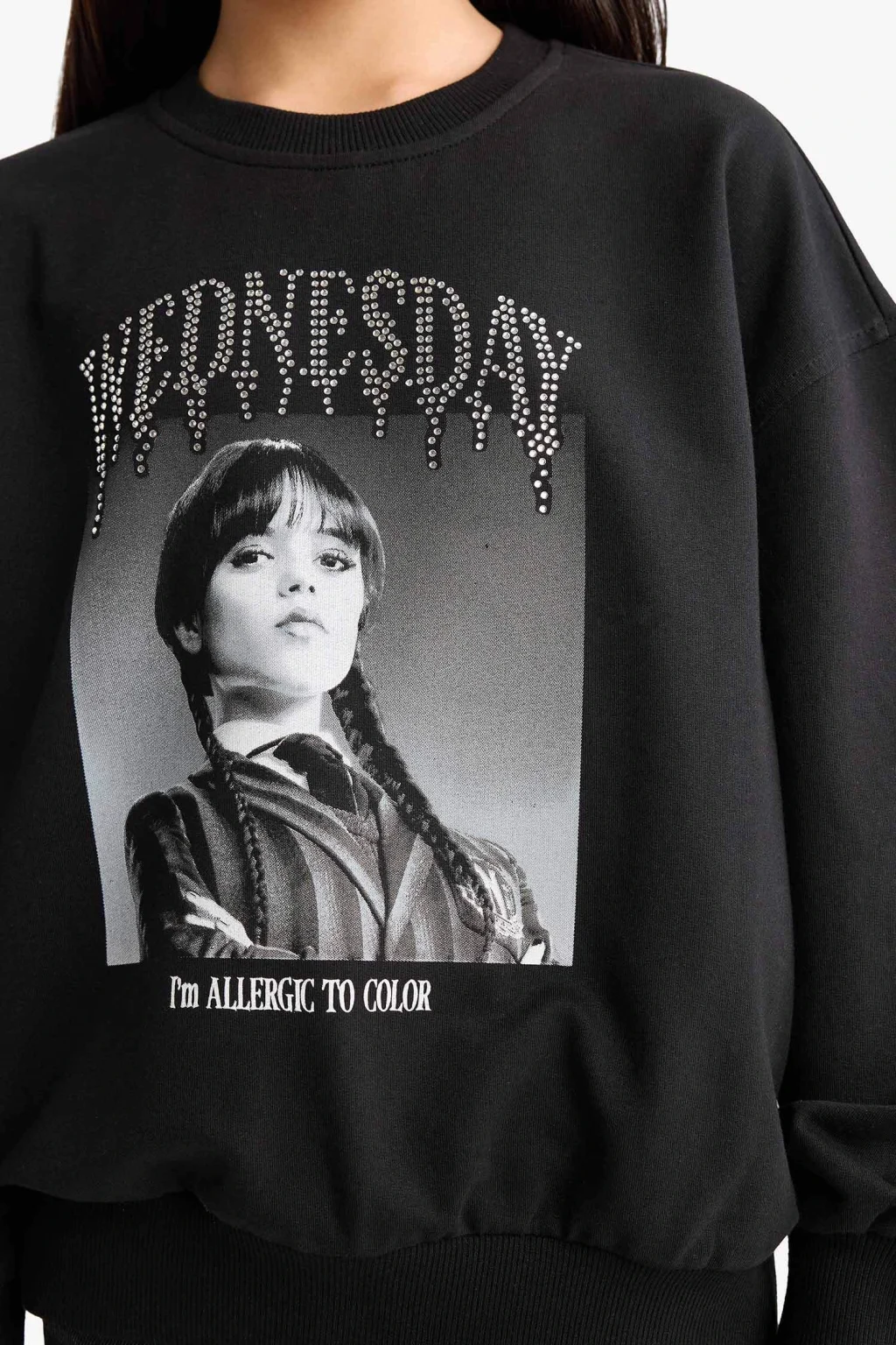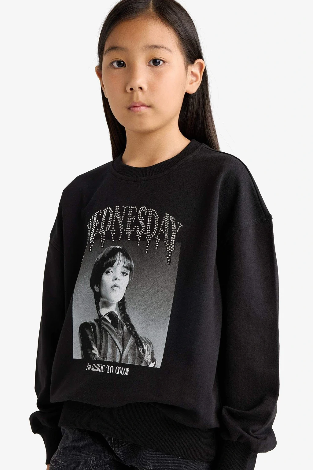 Wednesday temalı baskısıyla dikkat çeken oversize sweatshirt, kız çocukları için eğlenceli ve trend bir parça sunar. Geniş kalıbı ve yumuşak dokusuyla gün boyu rahatlık sağlar, soğuk havalarda sıcak tutar.