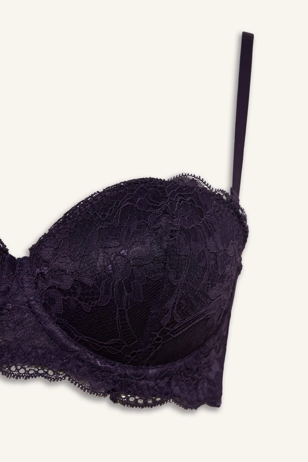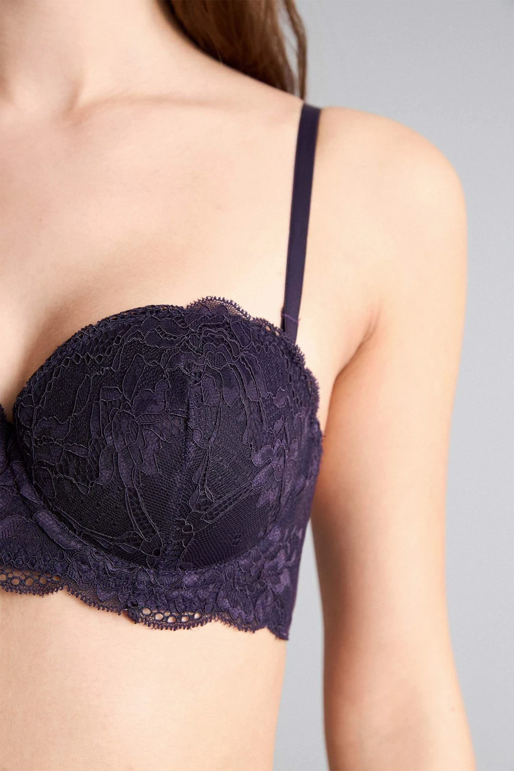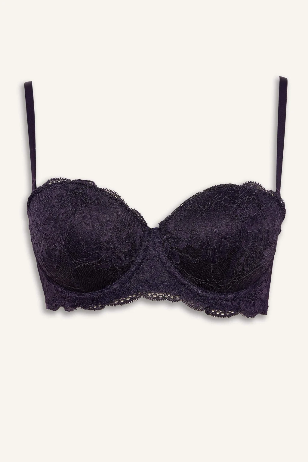 Dantel Detaylı Kaplı Yarım Dolgulu Balenli Straplez Sütyen, zarif dantel detayları ve balenli yapısıyla şıklığı ve destekleyiciliği bir arada sunar. Yarım dolgulu tasarımı, doğal bir siluet oluştururken straplez yapısı farklı kıyafetlerle rahat kullanım sağlar.