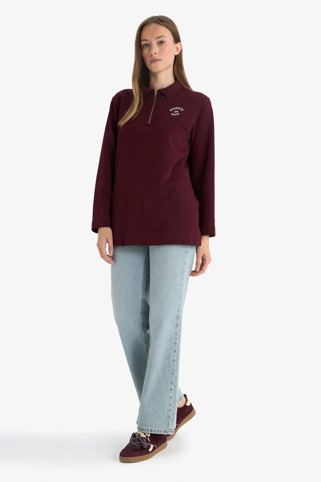 Regular fit kesimi ve polo yaka tasarımıyla şıklık sunan bu nakışlı yarım fermuarlı sweatshirt tunik, rahat ve modern bir stil yaratır. Yumuşak kumaşıyla gün boyu konfor sağlar.