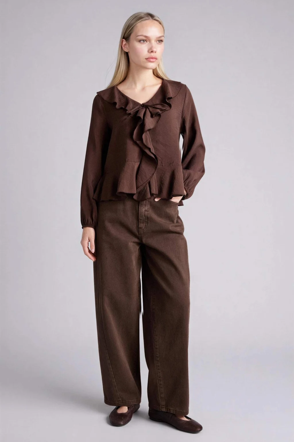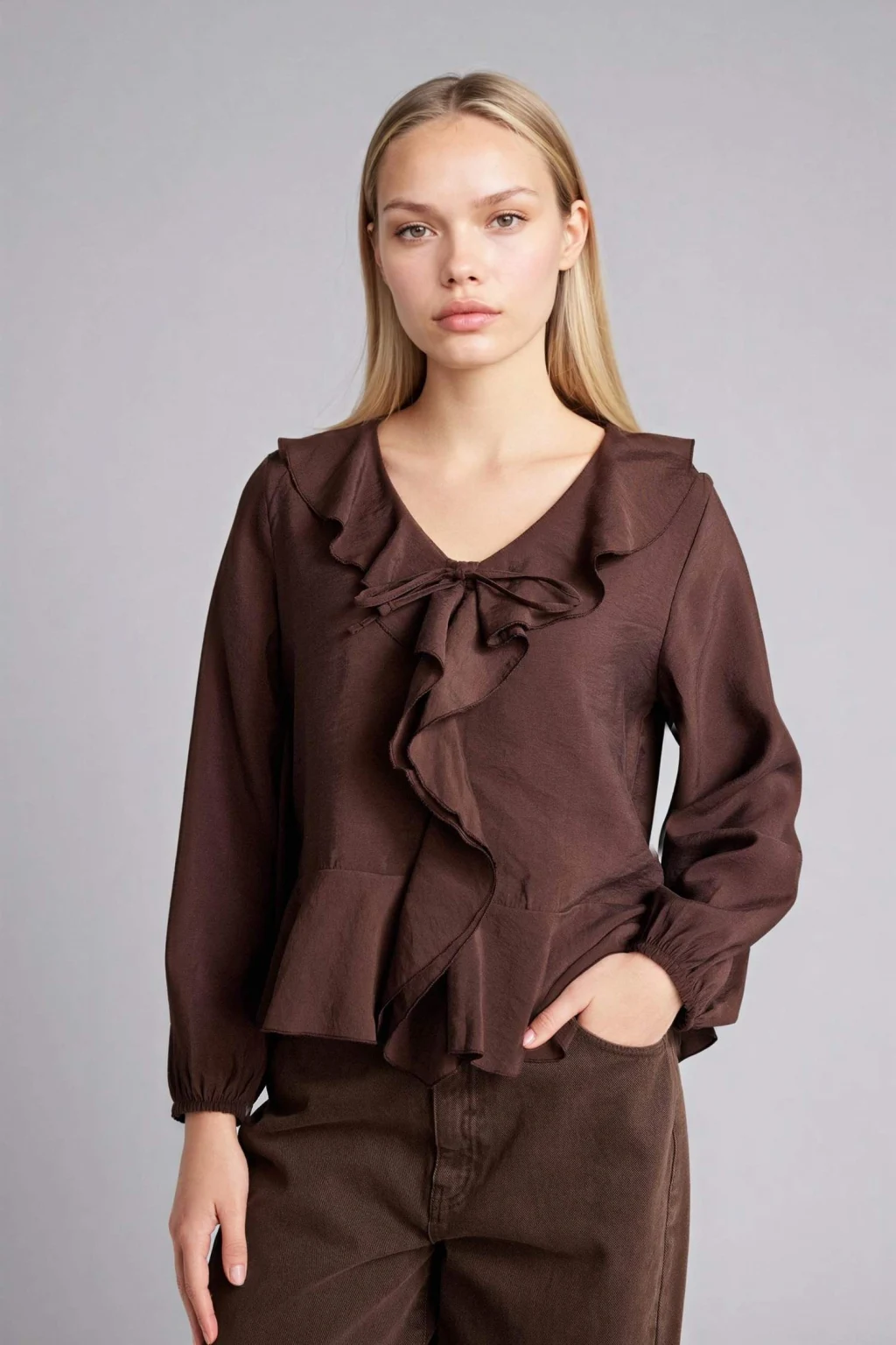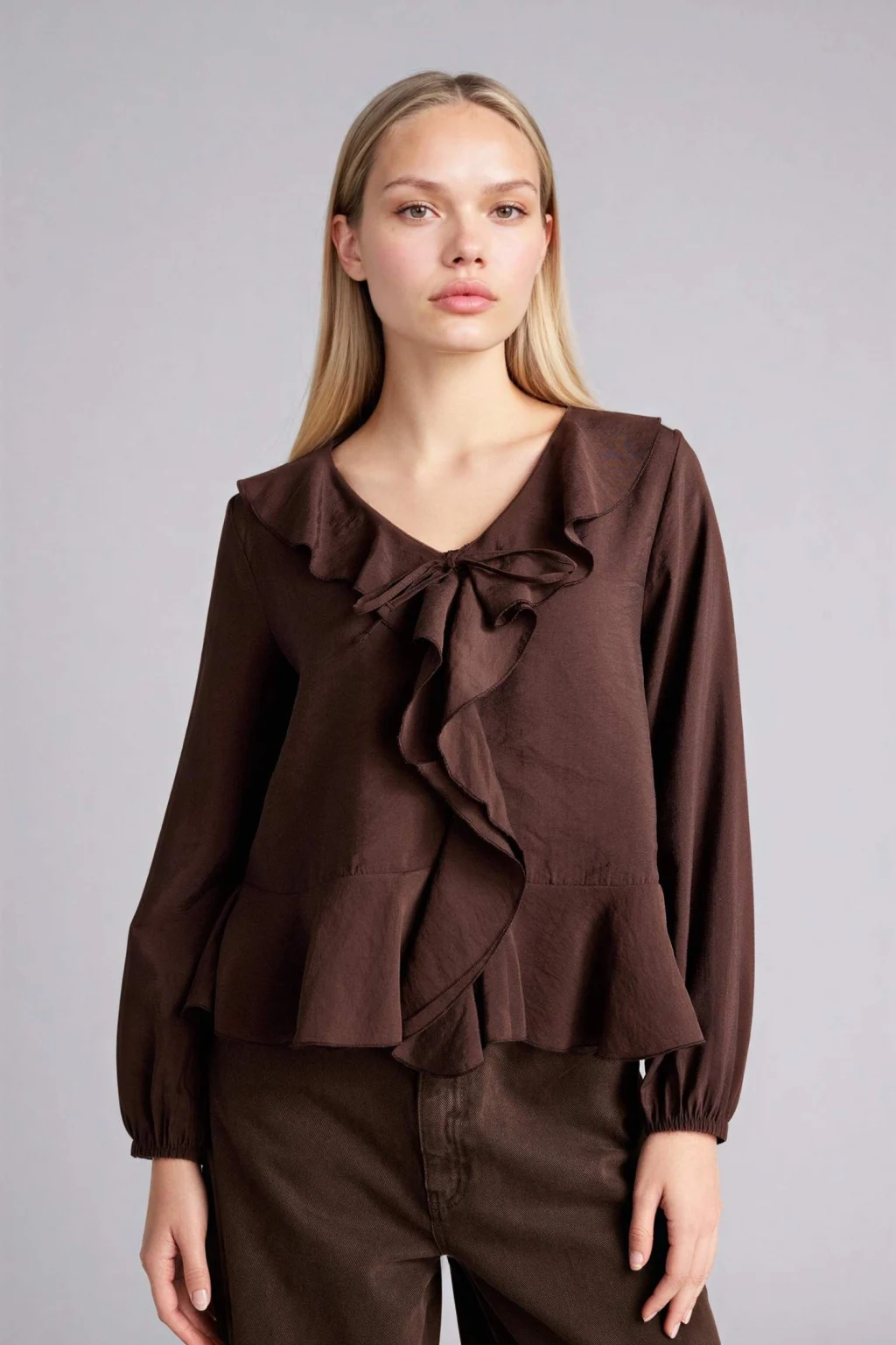 LCW Grace Kahverengi Bağlamalı Yaka Desenli Bluz