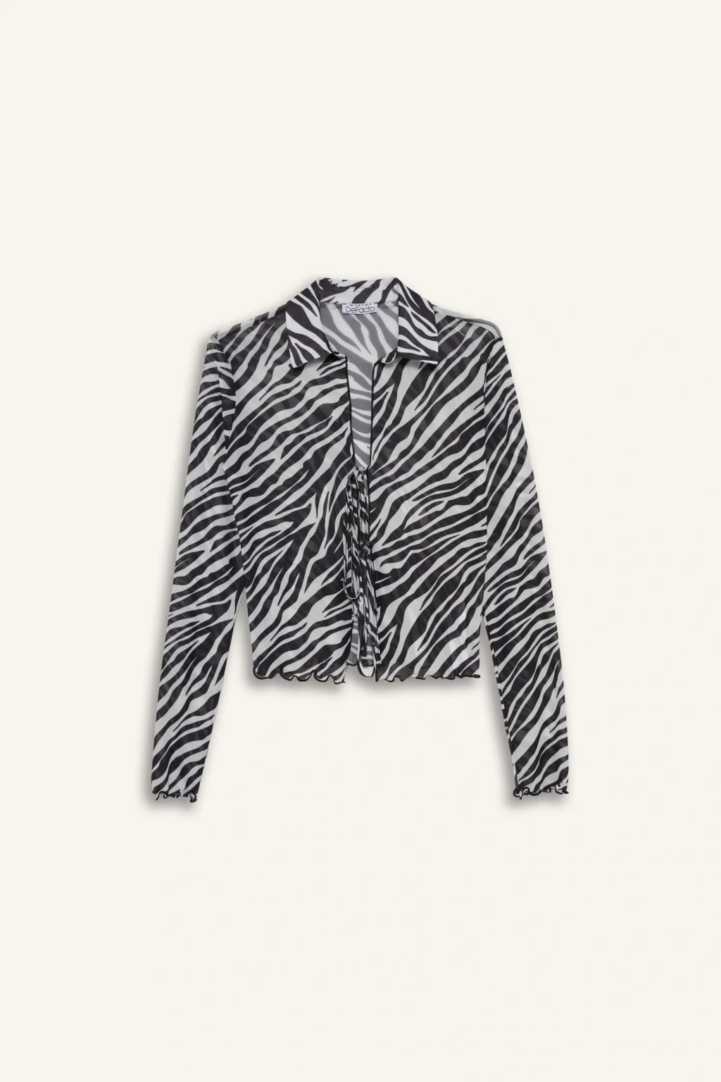 Fitted kesimi ve polo yaka tasarımıyla şıklık sunan bu zebra desenli tül bluz, önden bağlamalı detayıyla modern ve feminen bir hava katar. Hafif ve esnek yapısıyla konforlu bir kullanım sağlar.