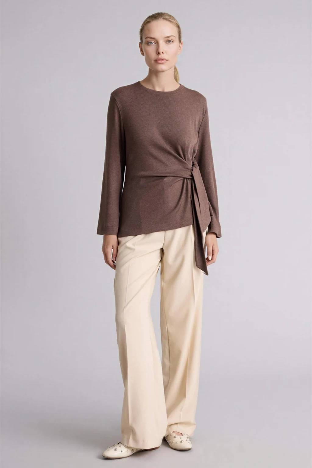 Yetişkin kadınlar için ideal bir seçim olan kahverengi uzun kollu bisiklet yaka tişört. Regular fit kalıbıyla rahat bir kullanım sunar. İlkbahar/Yaz mevsimlerinde tercih edilen temel bir parçadır.