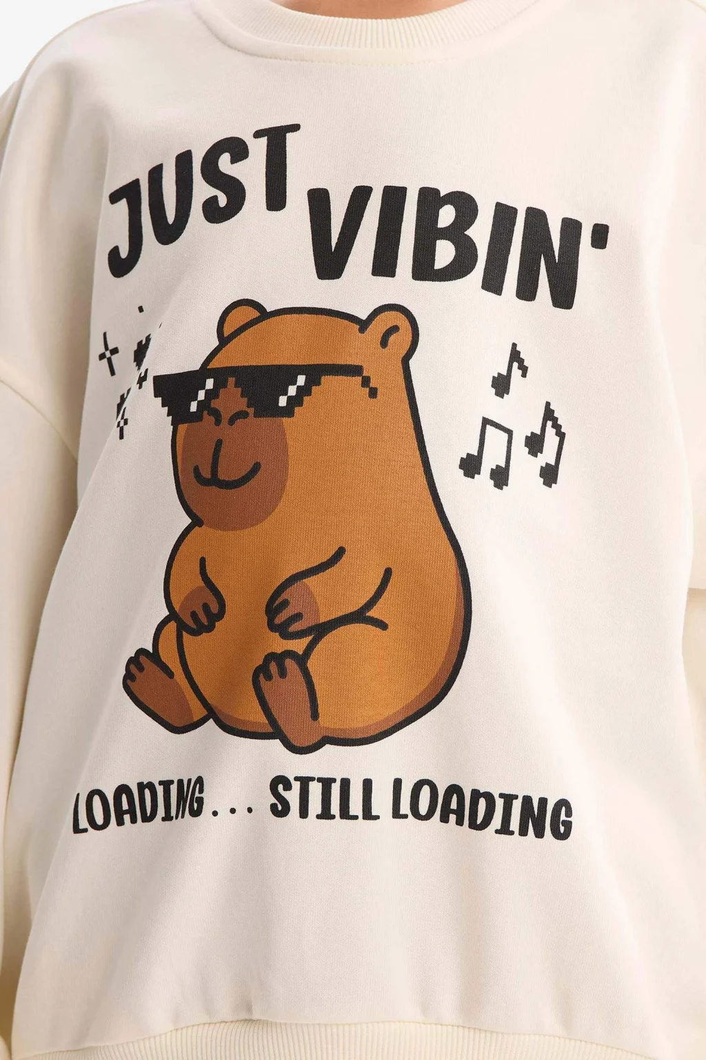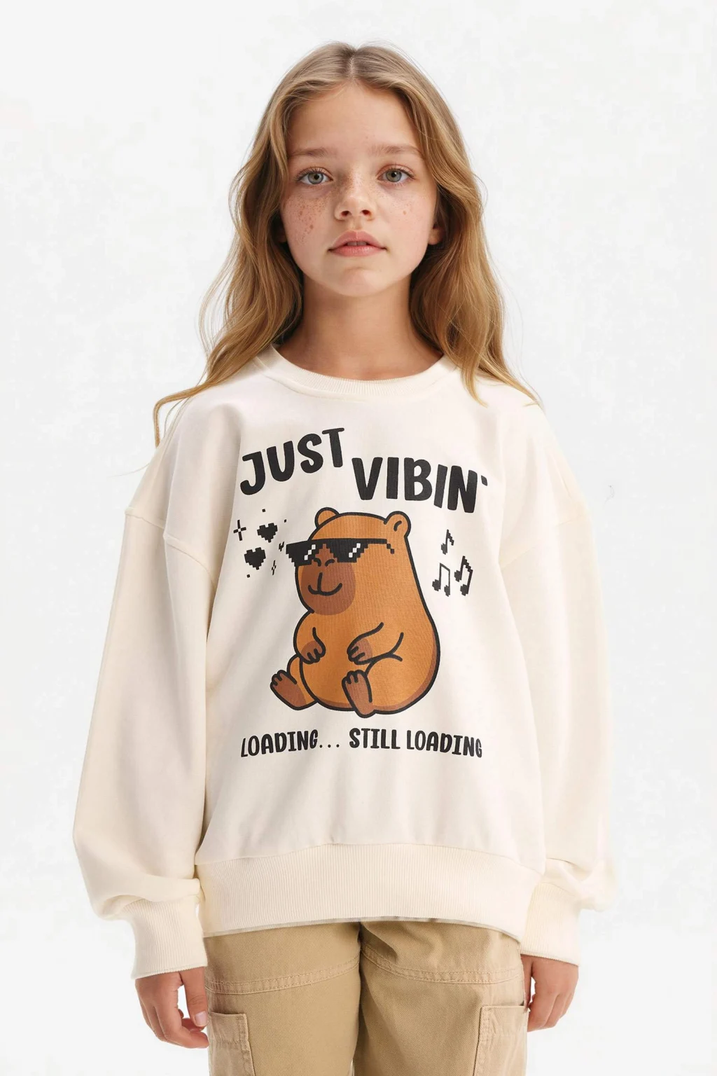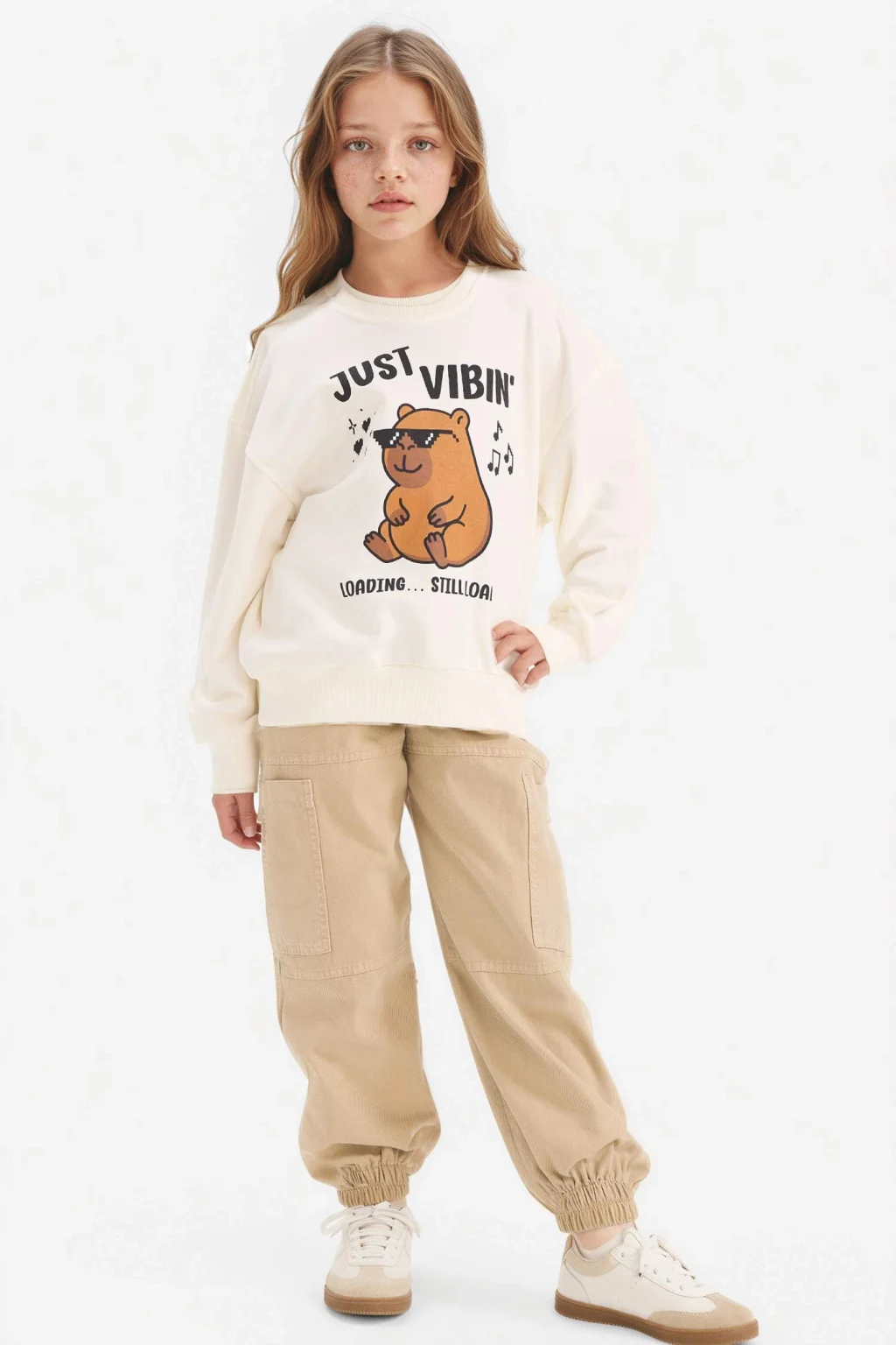 Rahat kesimi ve eğlenceli baskısıyla bu kız çocuk sweatshirt, günlük kombinlere enerji katar. Yumuşak kumaşı sayesinde gün boyu konfor sunar ve serbest tarzı destekler.