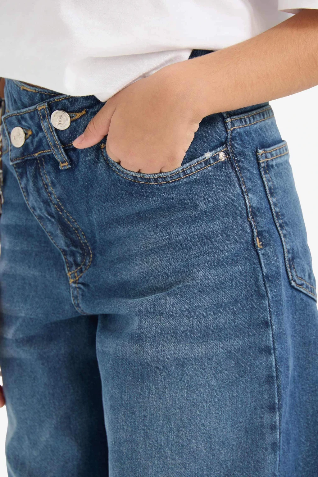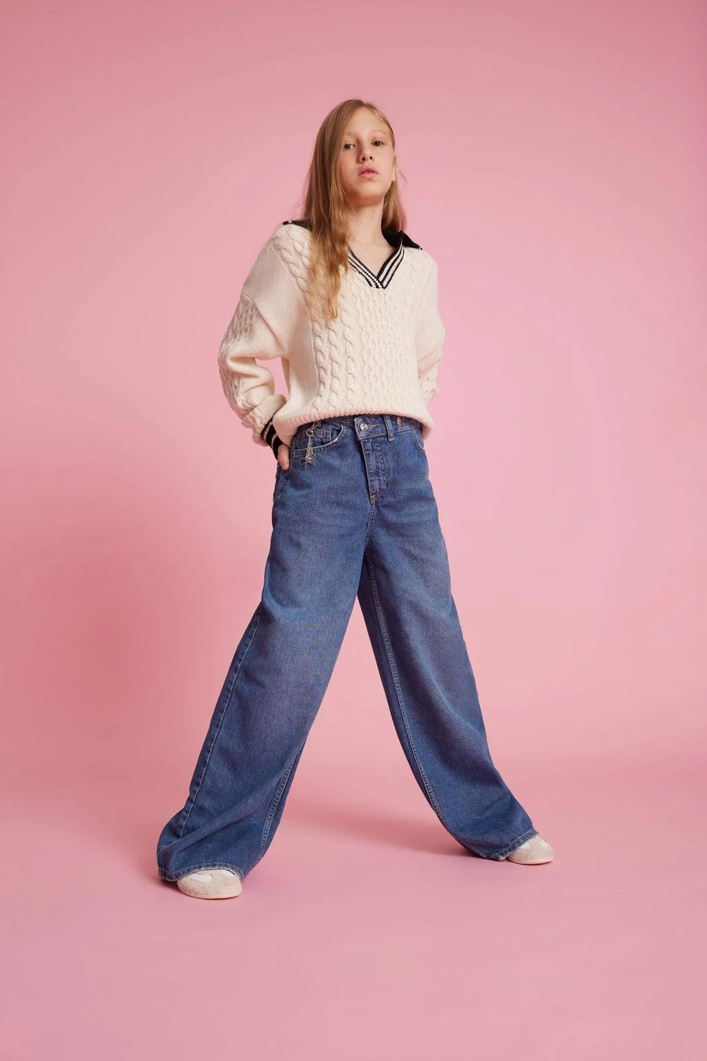 Kız Çocuk Wide Leg Geniş Paça Jean Pantolon, modern kesimi ve dayanıklı denim kumaşıyla hem rahat hem de stil sahibi bir görünüm sunar. Günlük kullanıma uygun tasarımıyla miniklerin gardırobunun vazgeçilmezi olur.