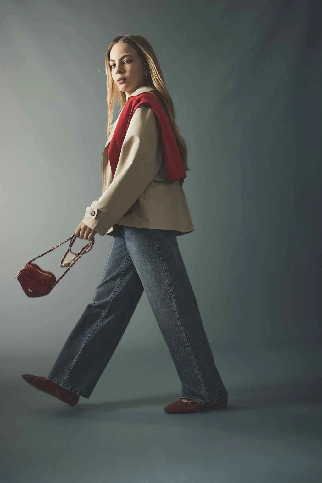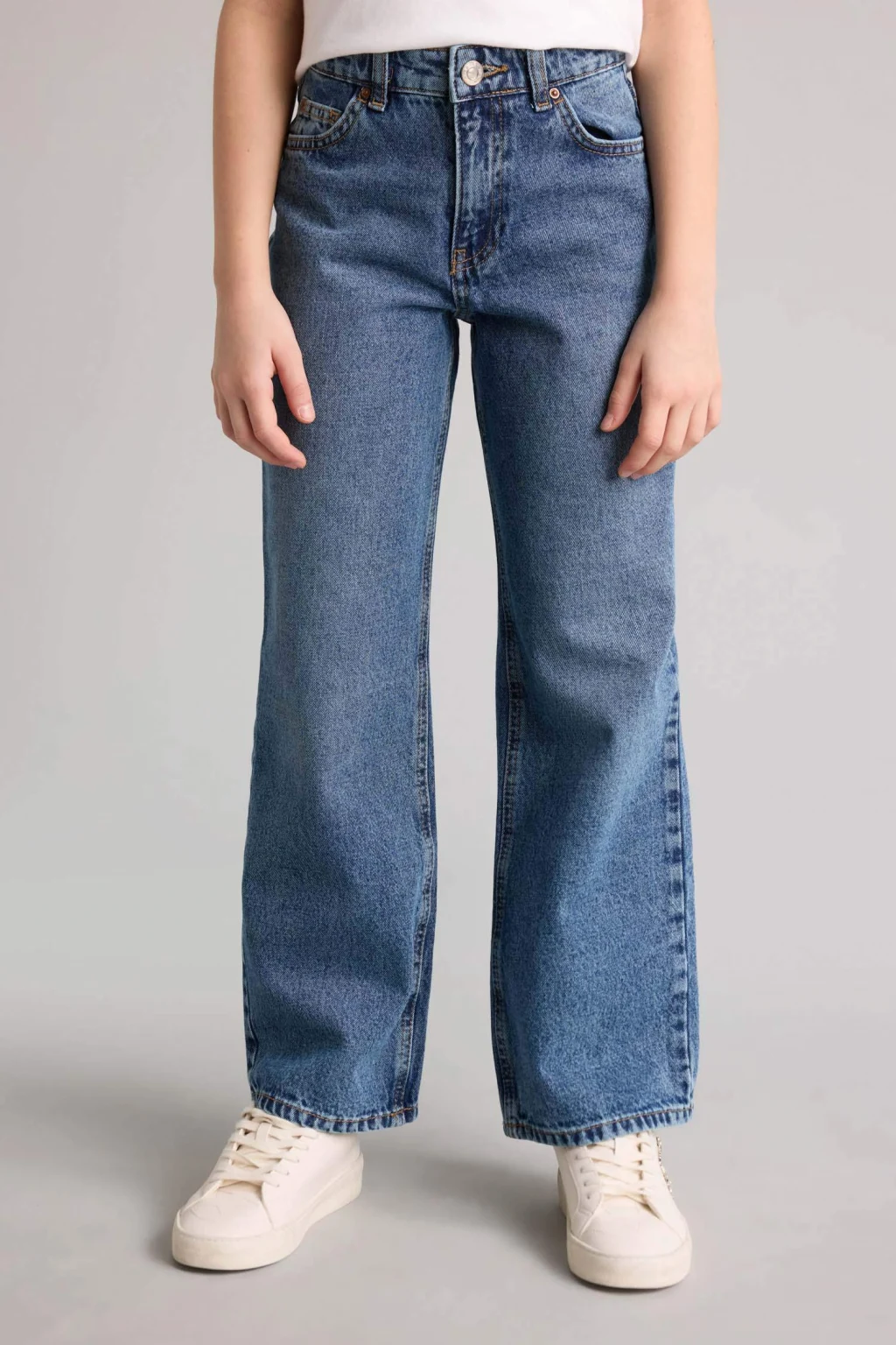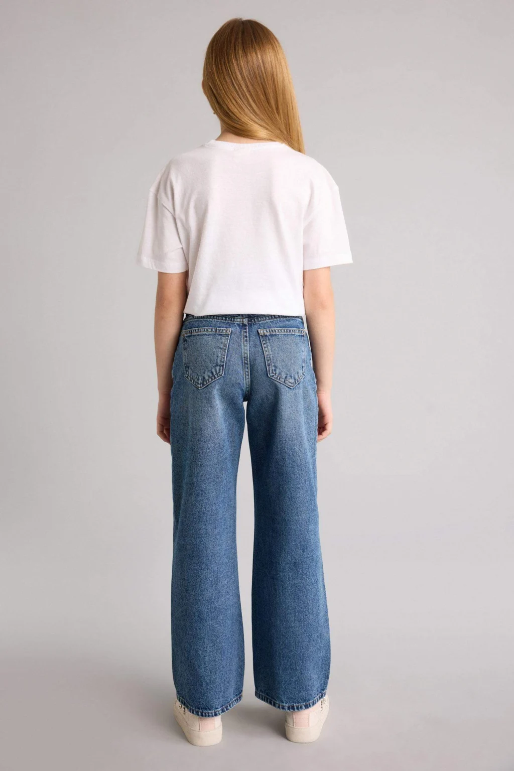 Straight Wide Geniş Paça Jean Pantolon – Kız Çocuk, geniş paça tasarımıyla rahat hareket özgürlüğü sağlar. Dayanıklı ve yumuşak denim kumaşı, günlük kullanım ve oyunlar için idealdir. Modern ve şık kesimi sayesinde farklı kombinlerde öne çıkan bir parçadır.