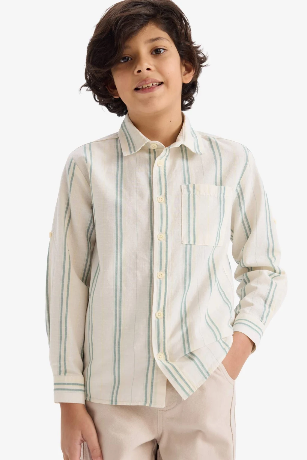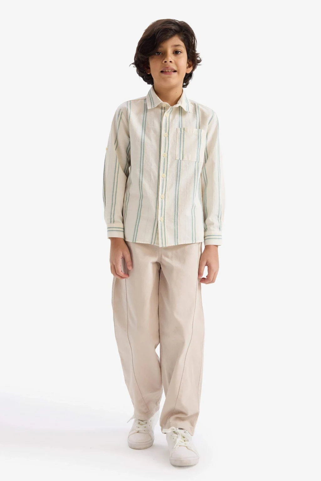 Erkek Çocuk Çizgili Uzun Kollu Gömlek, şık çizgili deseniyle her kombine uyum sağlar. Rahat kesimi ve yumuşak kumaşıyla gün boyu konfor sunar.