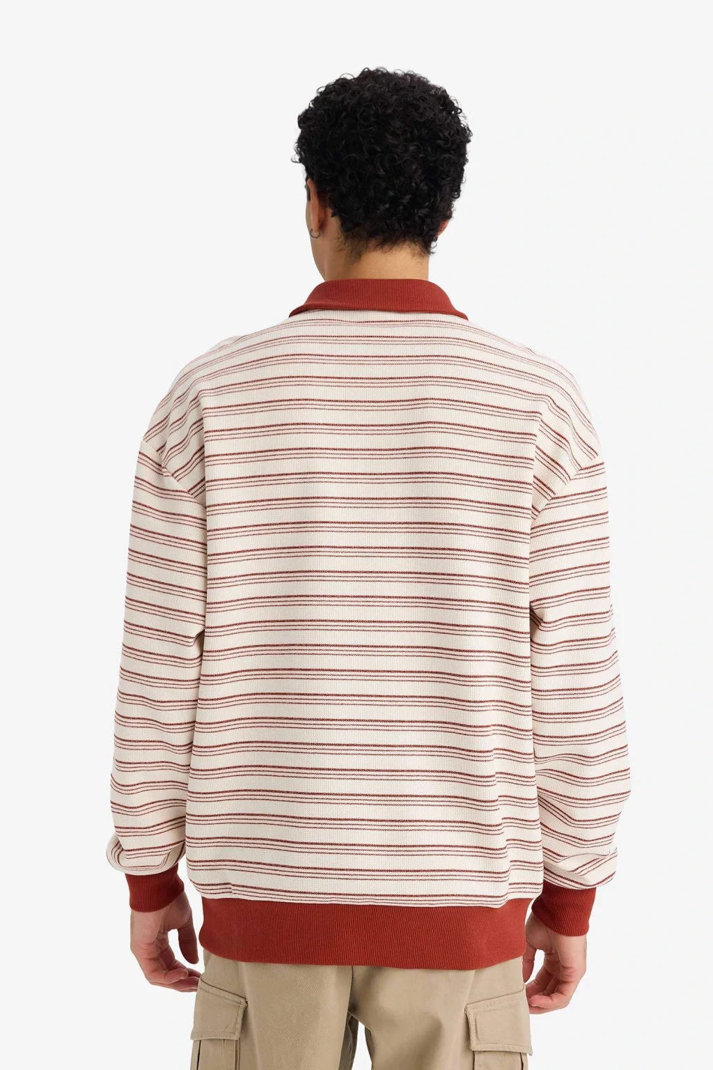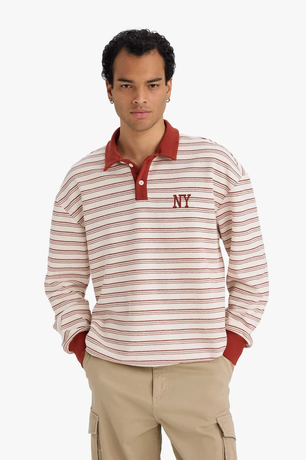 Boxy Fit Polo Yaka Baskılı Çizgili Sweatshirt, rahat boxy kesimi ve şık çizgili tasarımıyla günlük kombinlere modern bir dokunuş katar. Polo yaka detayı şıklık katarken, yumuşak kumaşı gün boyu konfor sağlar. Esnek yapısıyla hareket özgürlüğü sunar.