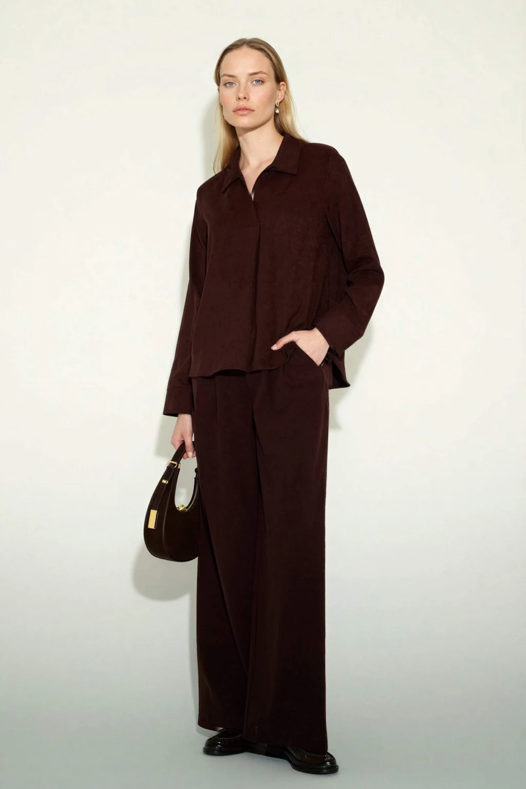 Straight wide kesimli, geniş paça süet pantolon, rahat ve modern bir stil sunar. Yumuşak süet kumaşı gün boyu konfor sağlarken, geniş paça tasarımı şık ve sofistike bir görünüm kazandırır. Günlük ve özel kombinlerde ideal bir tercihtir.
