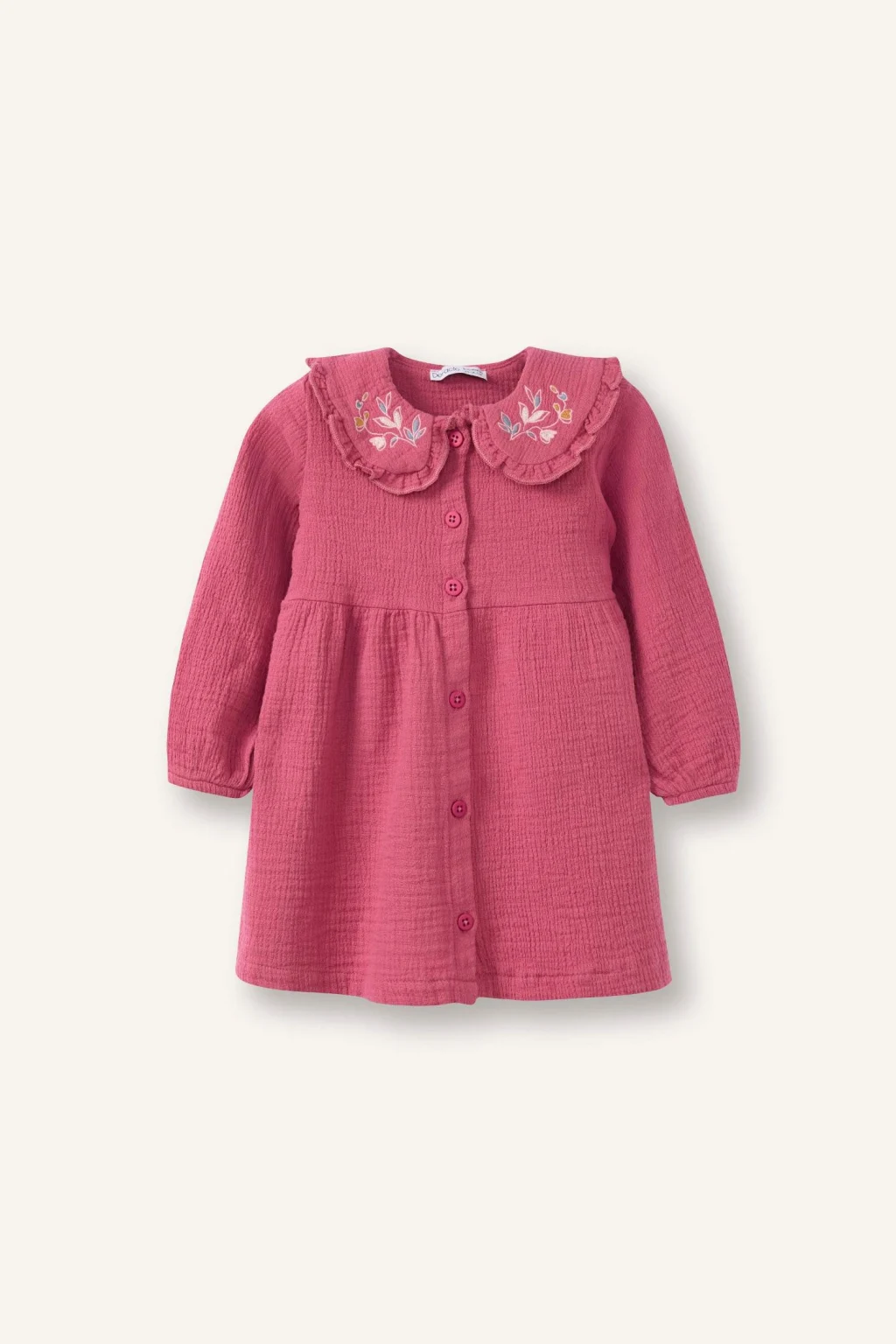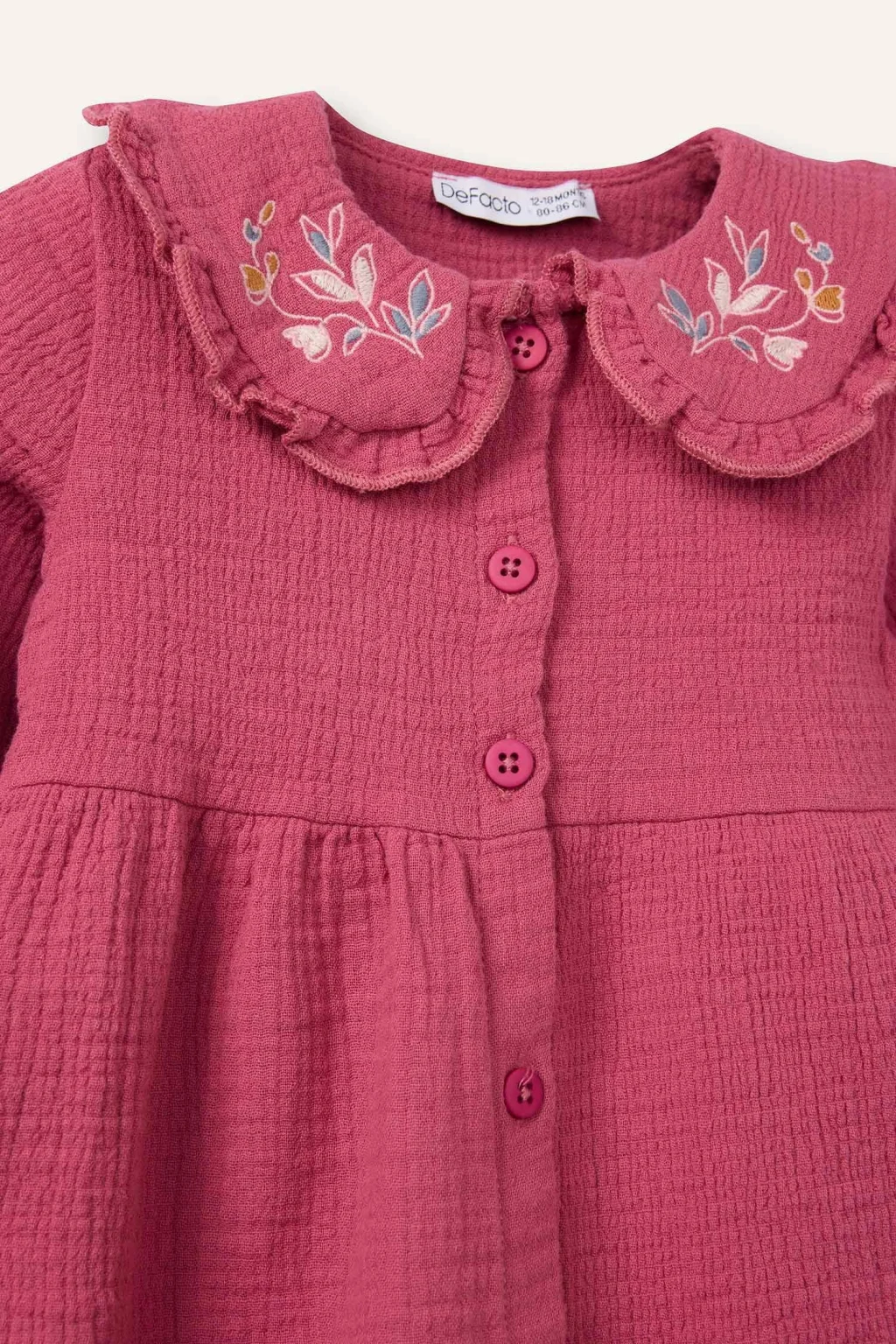 Çiçekli müslin kumaşı ve nakış yakasıyla zarif bir tasarım sunan elbise, kız bebekler için yumuşak ve rahat bir kullanım sağlar. Şık ve sevimli detaylarıyla özel günlerde öne çıkar.