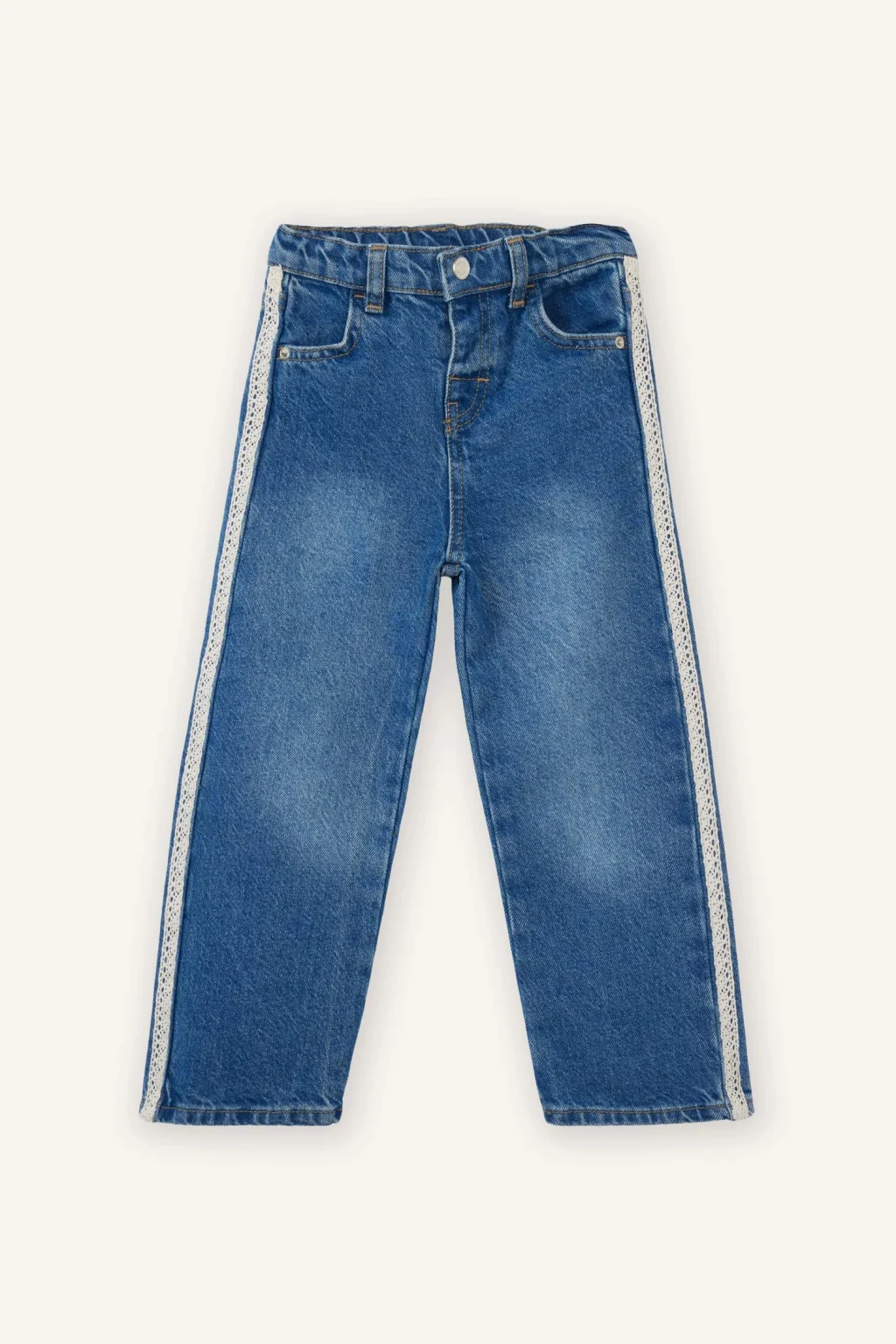 Şerit detaylarıyla süslenmiş culotte kesimli jean pantolon, kız bebekler için rahat ve konforlu bir kullanım sunar. Günlük kombinlerde şık ve modern bir tercih oluşturur.