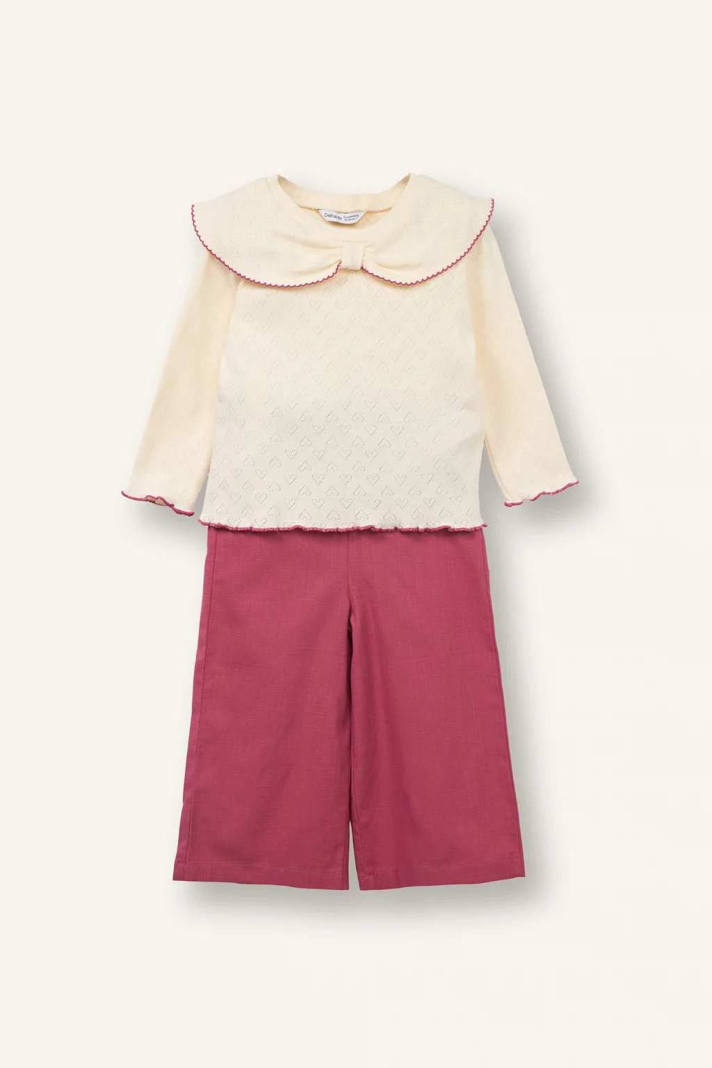 Keten Görünümlü 2'li Takım, zarif ve rahat tasarımıyla dikkat çekiyor. Krem rengi, fırfırlı detaylı yakasıyla üst parça, yumuşak dokusuyla konfor sunar. Bordo renkli bol paça pantolon ise hareket kolaylığı sağlayarak şıklık katar.