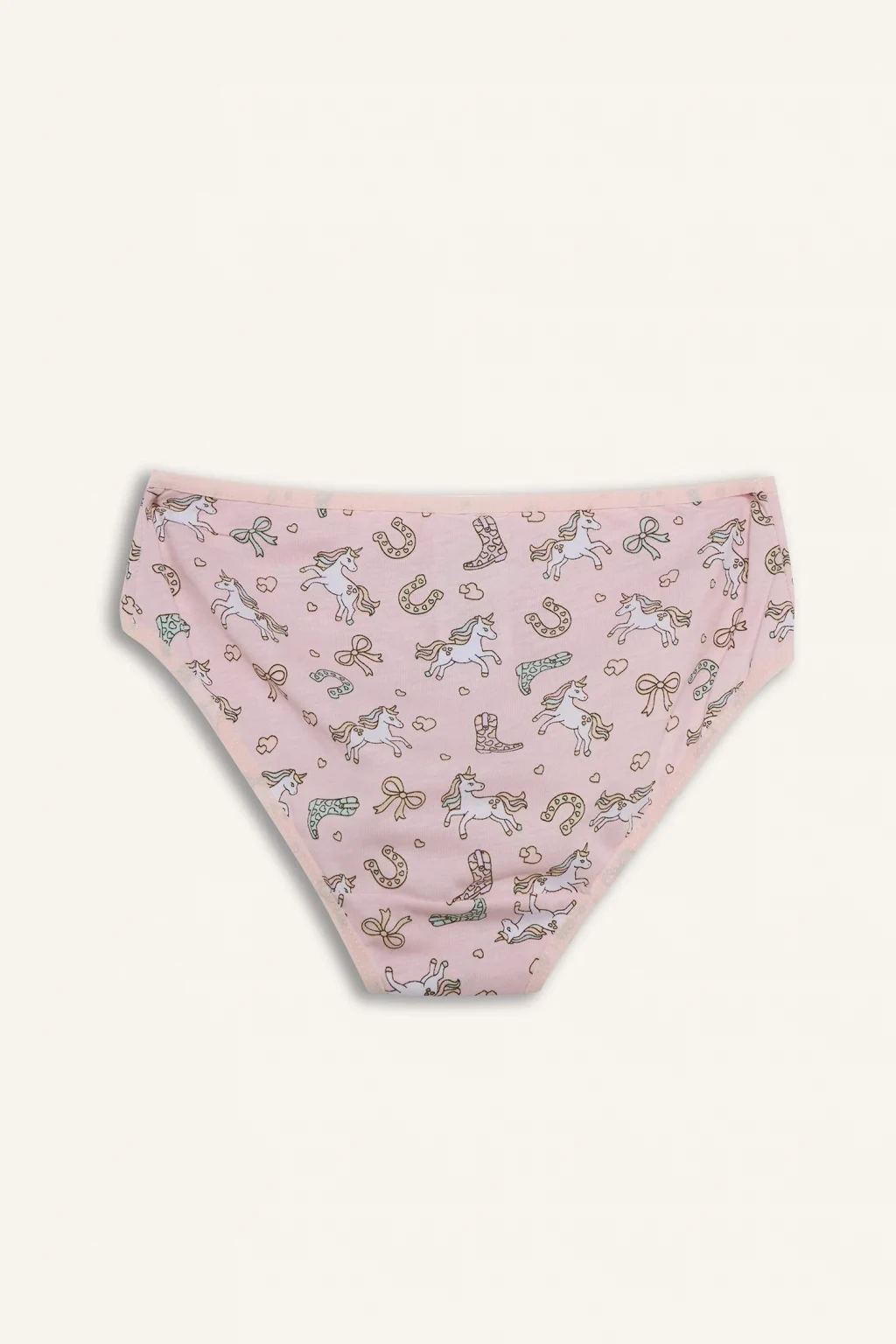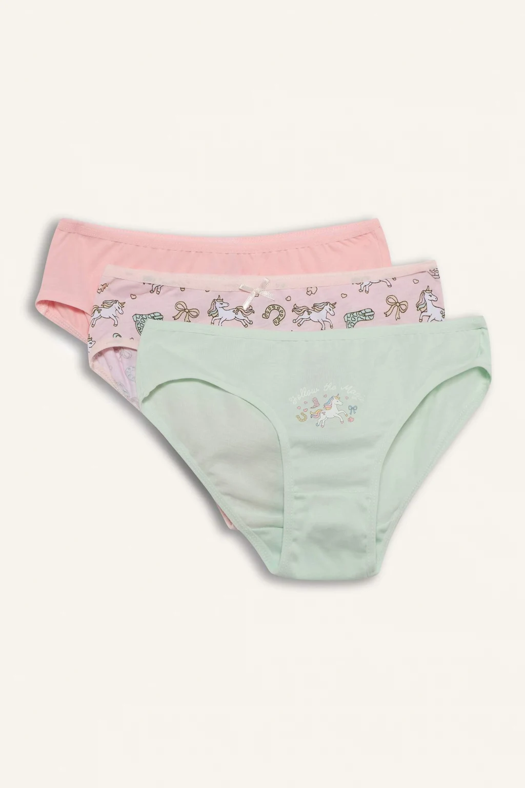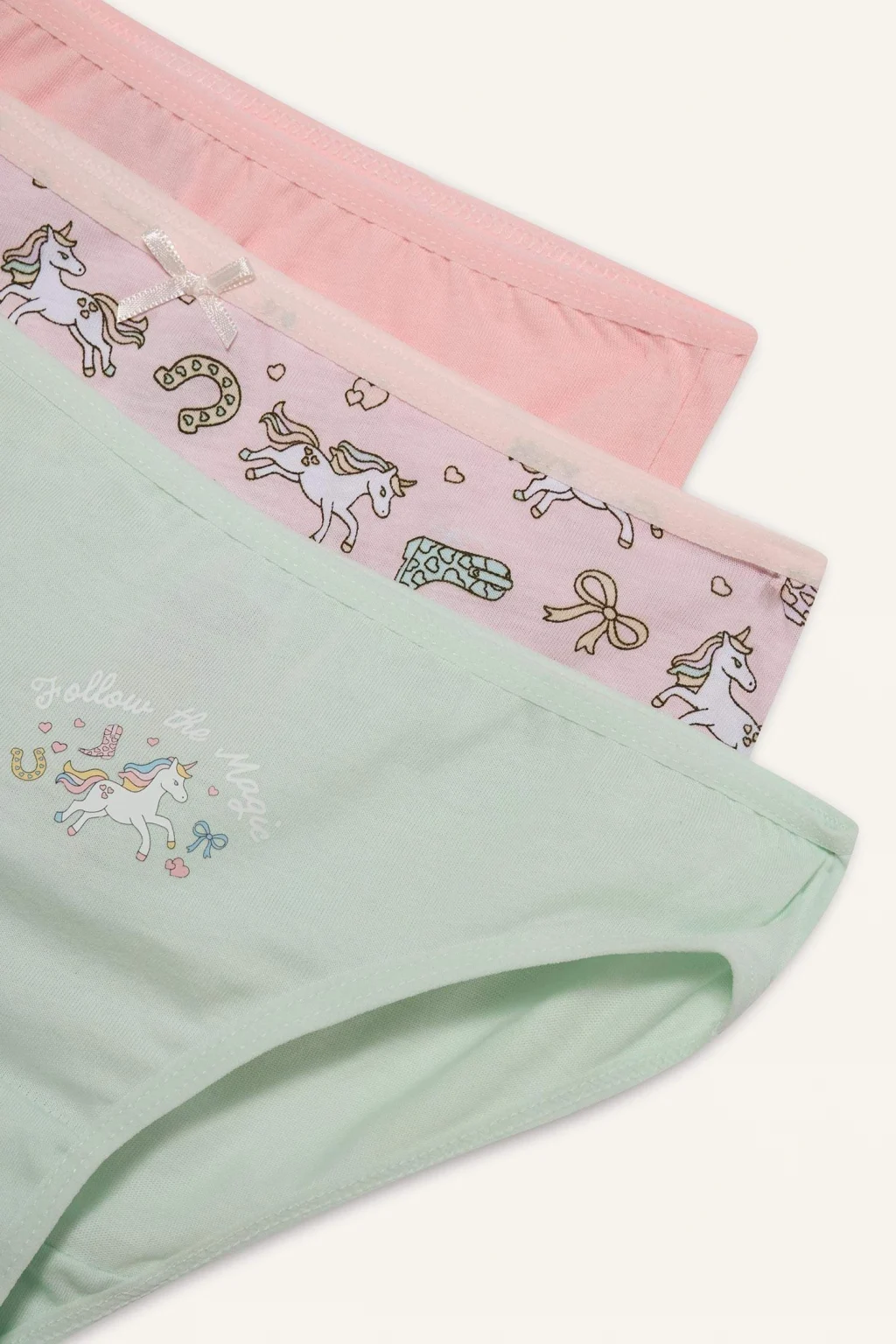 %100 pamuklu penye kumaştan üretilen unicorn baskılı kız çocuk 3’lü slip külot seti, yumuşak ve nefes alabilen yapısıyla gün boyu konfor sağlar. Renkli unicorn desenleriyle eğlenceli ve şık bir görünüm sunar, esnek bel bandı sayesinde rahat bir uyum sağlar.