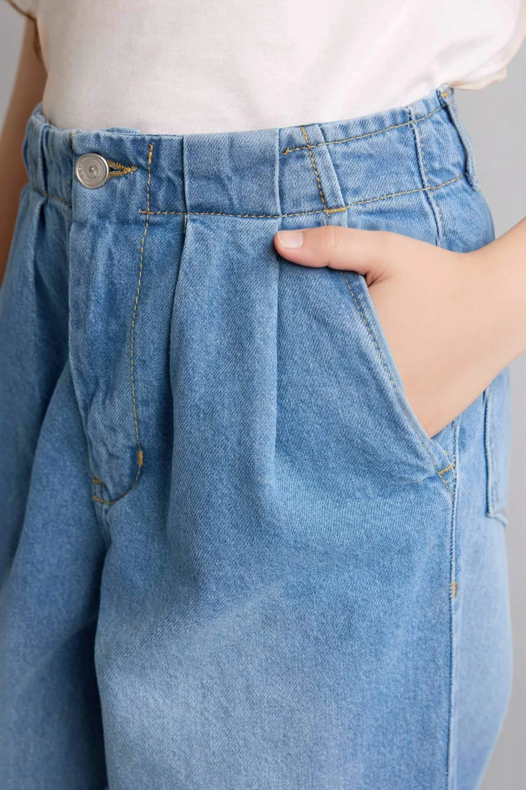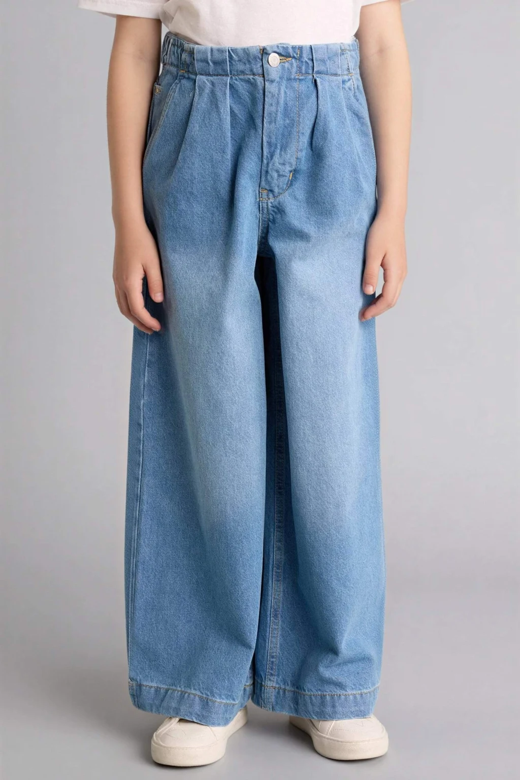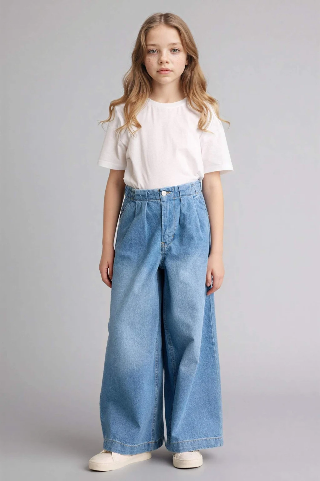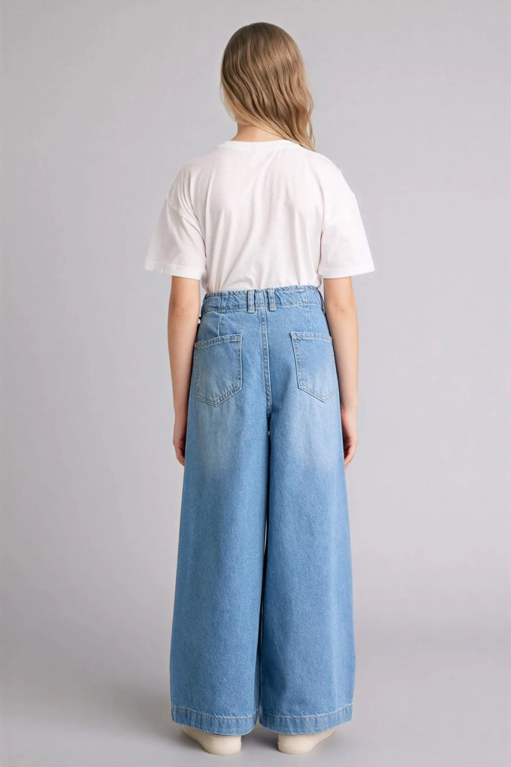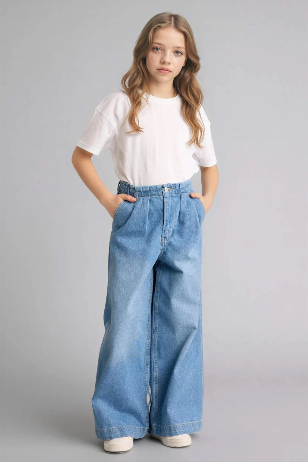 Geniş paça tasarımıyla kız çocuk wide leg jean pantolon, hem rahat hem de trend bir stil sunar.