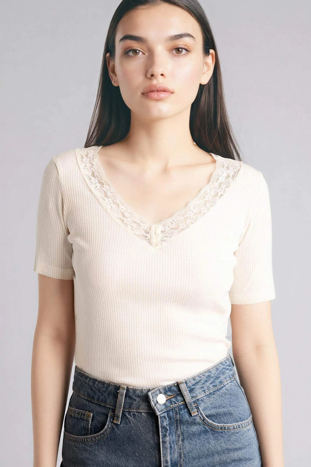 Defacto G9665AXER233 Ekru %100 Pamuk Slım Fıt Fıtilli Kaşkorse Tişört