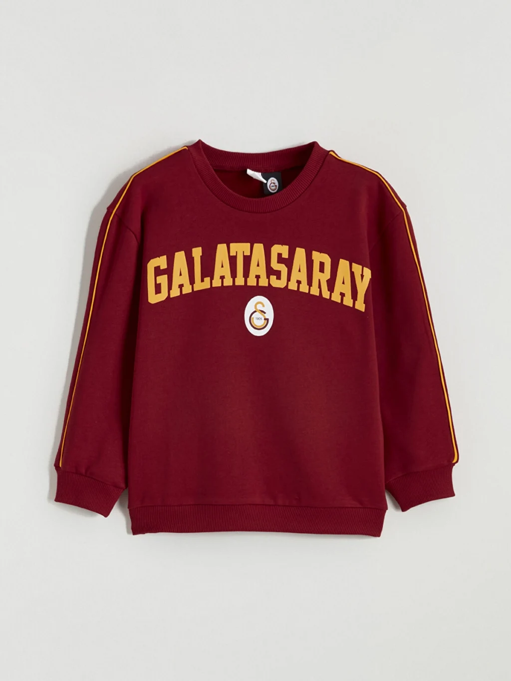 Galatasaray lisanslı erkek çocuk sweatshirt, bisiklet yaka ve uzun kolludur. Önü yazı baskılı, kolları şeritli, bilekleri ve altı ribanalıdır.