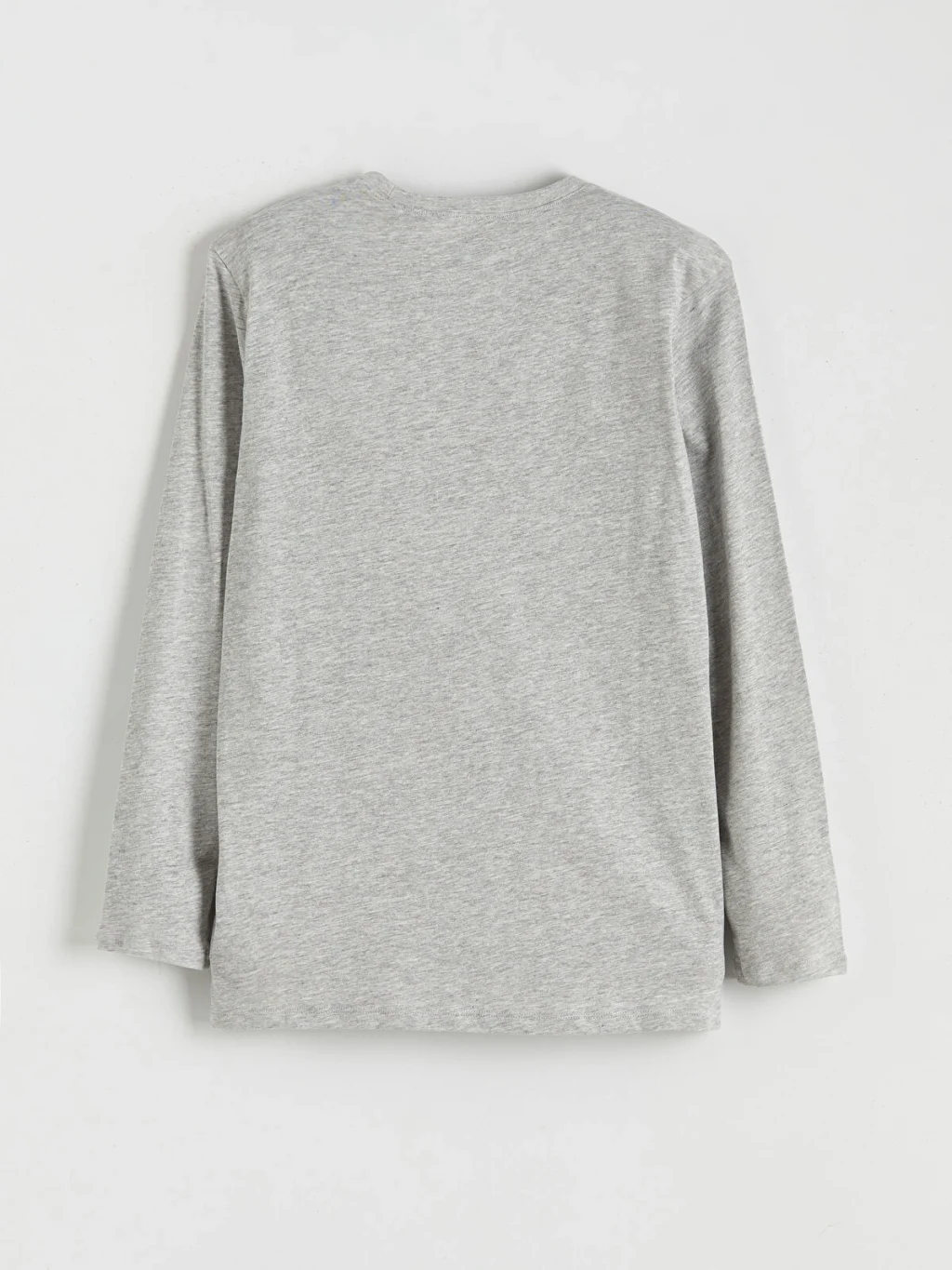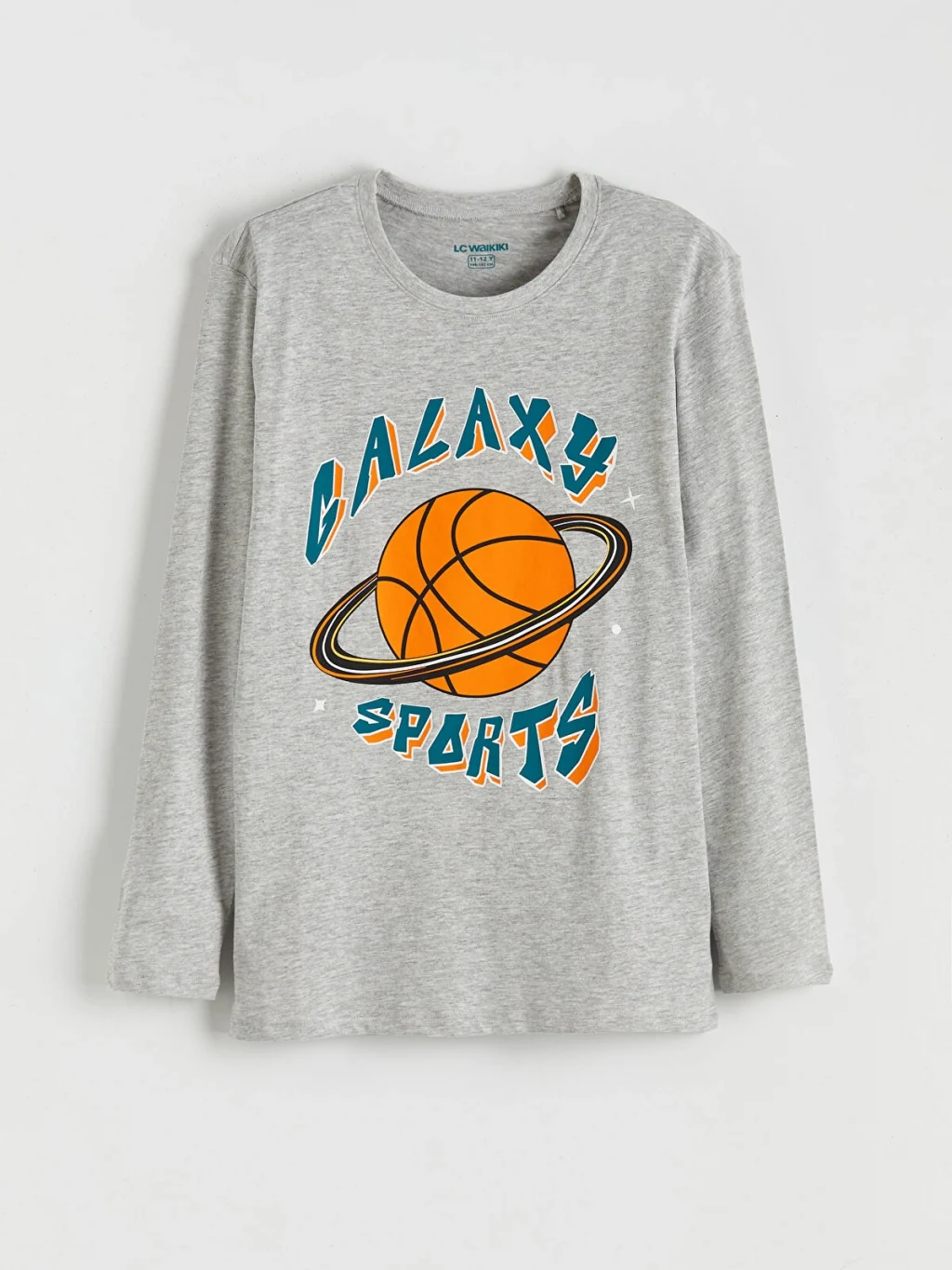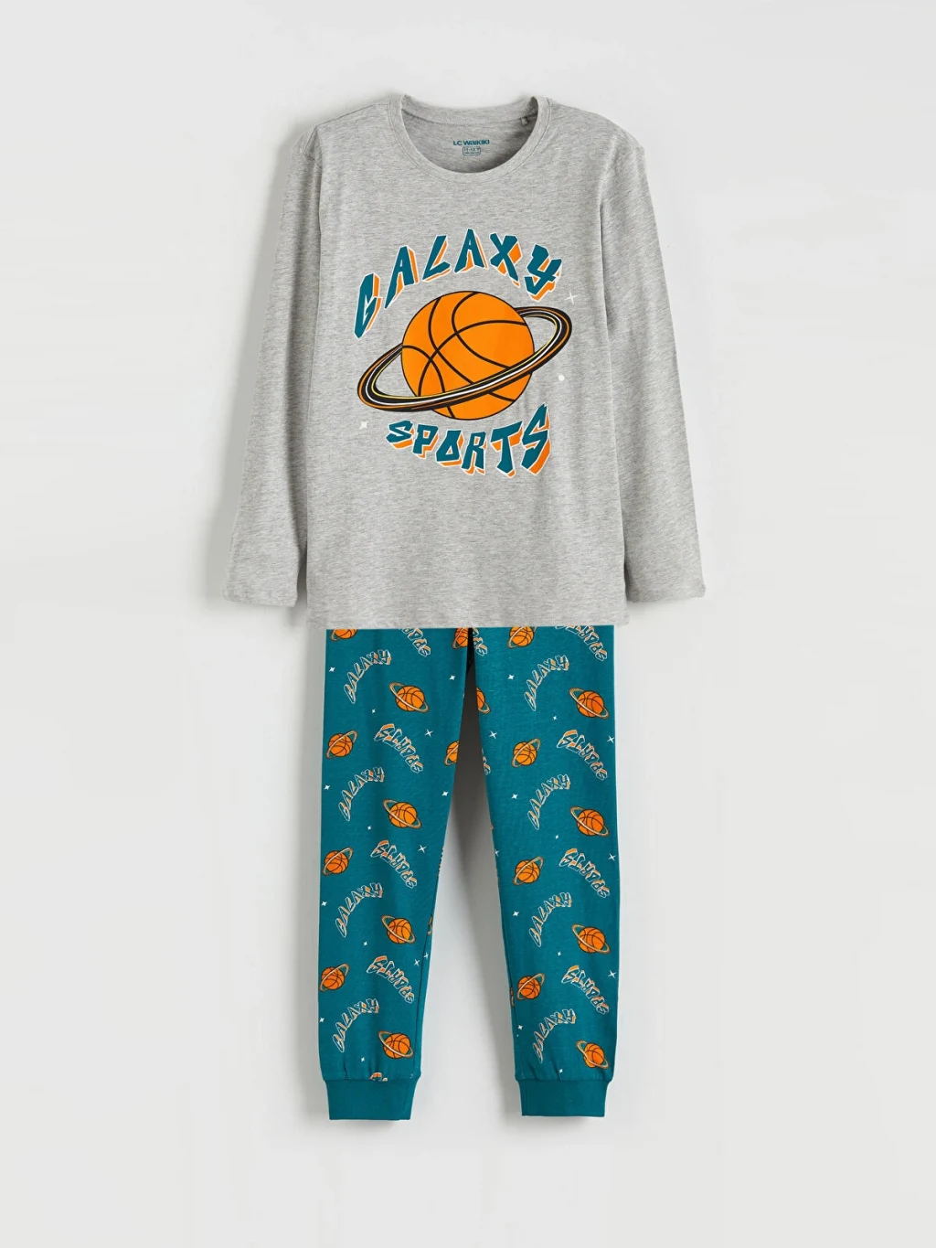 Yüksek pamuk içerikli penye kumaştan erkek çocuk pijama takımı, bisiklet yaka, uzun kollu baskılı üst ve desenli, paçaları ribanalı alttan oluşur.