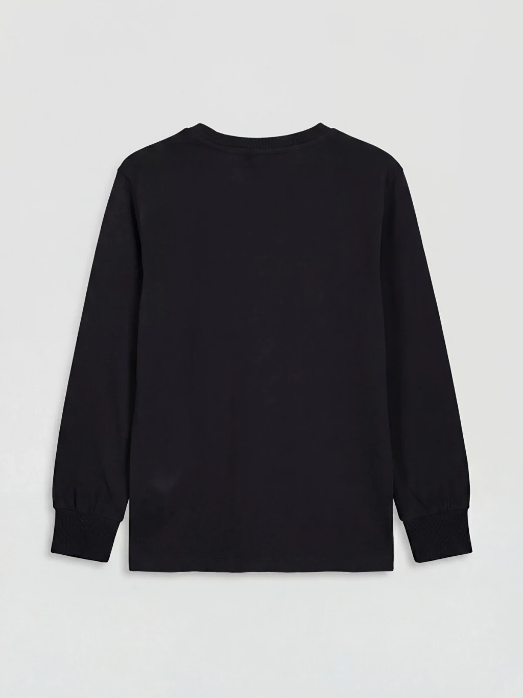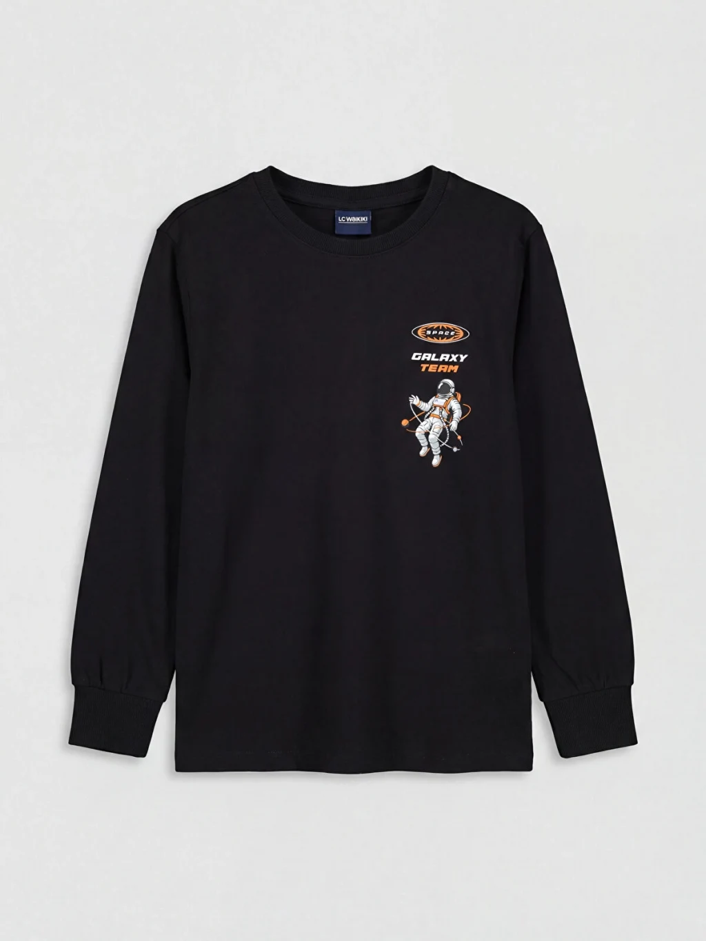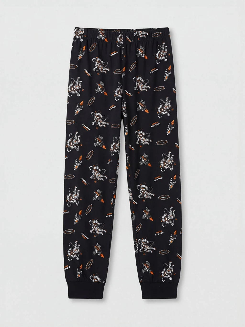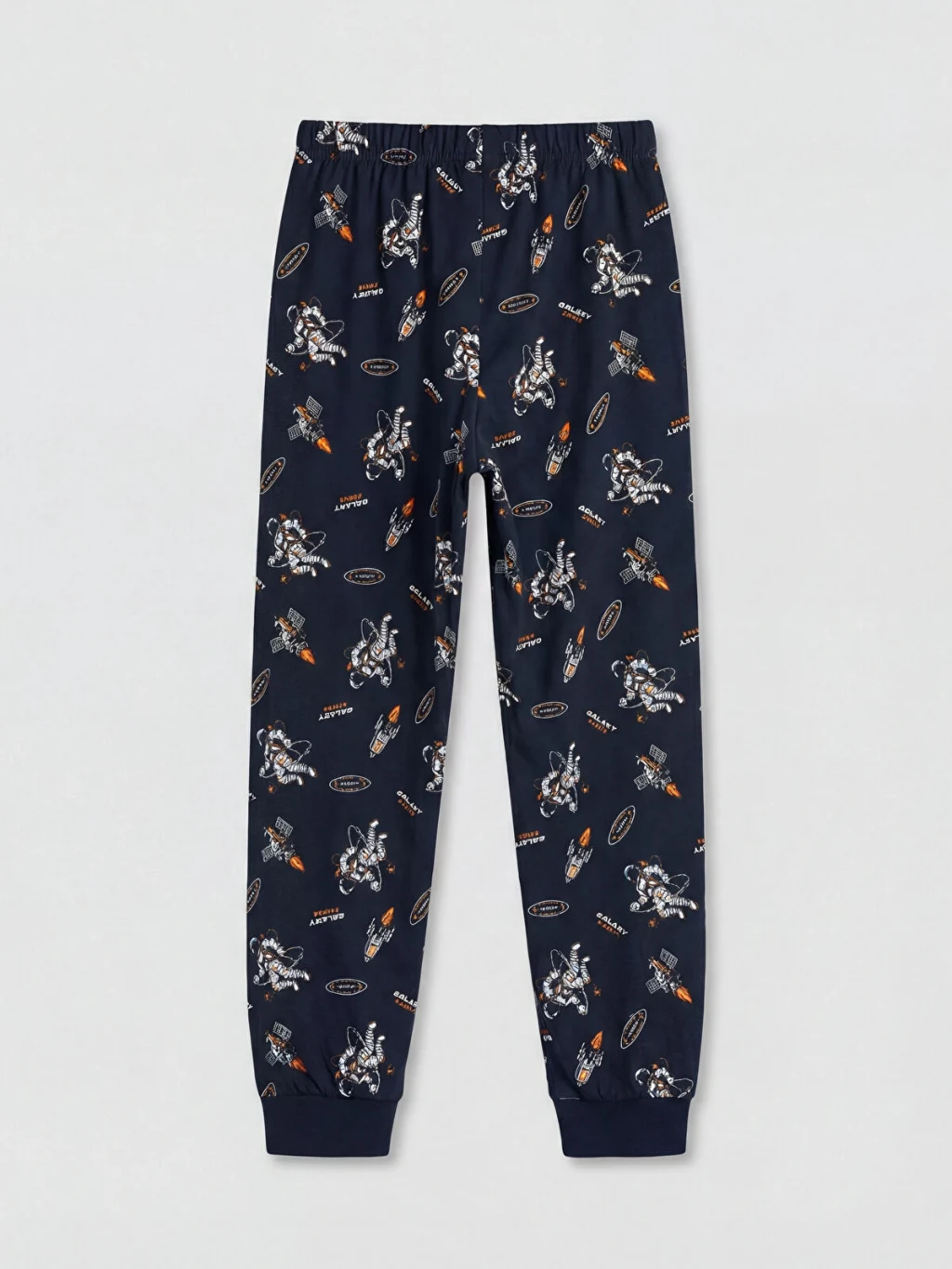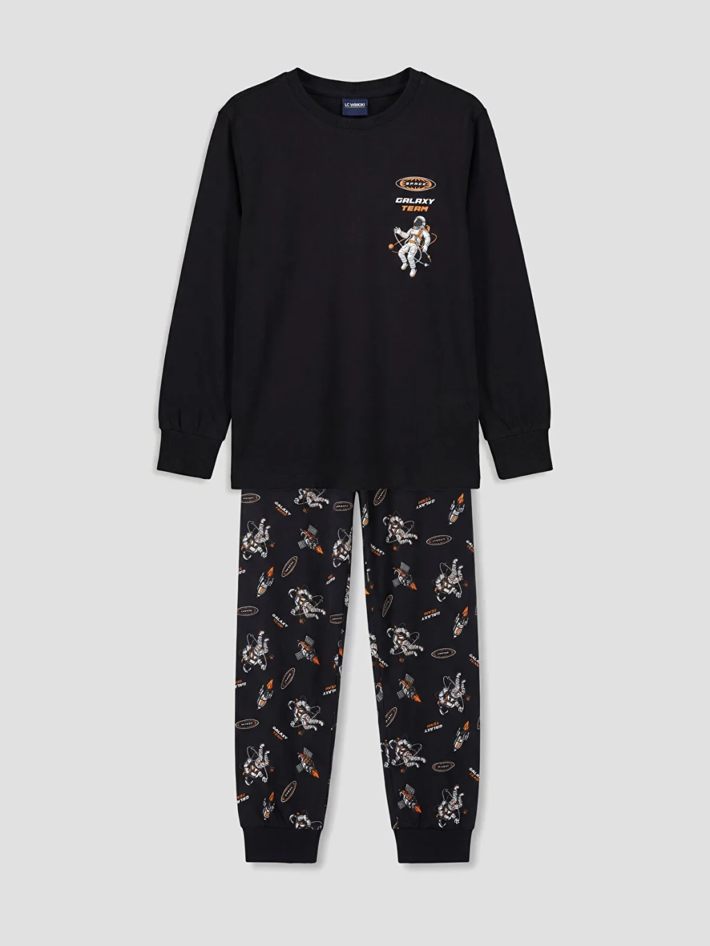 Bisiklet yaka ve uzun kollu erkek çocuk pijama takımı, baskılı üst ve desenli, paçası ribanalı alttan oluşmaktadır. %100 pamuklu kumaşa sahiptir.