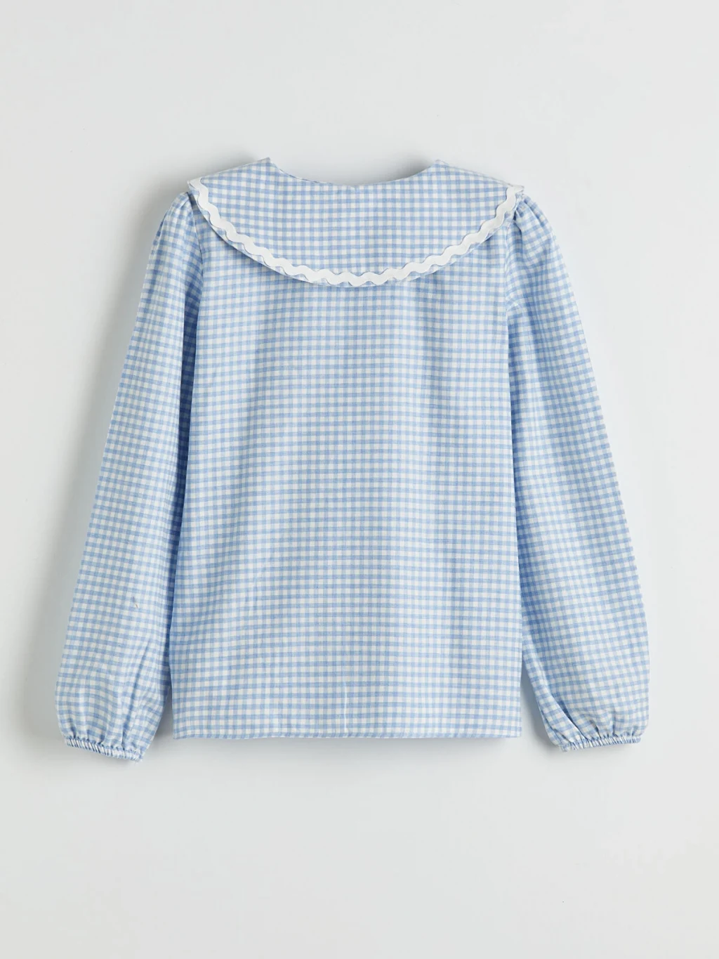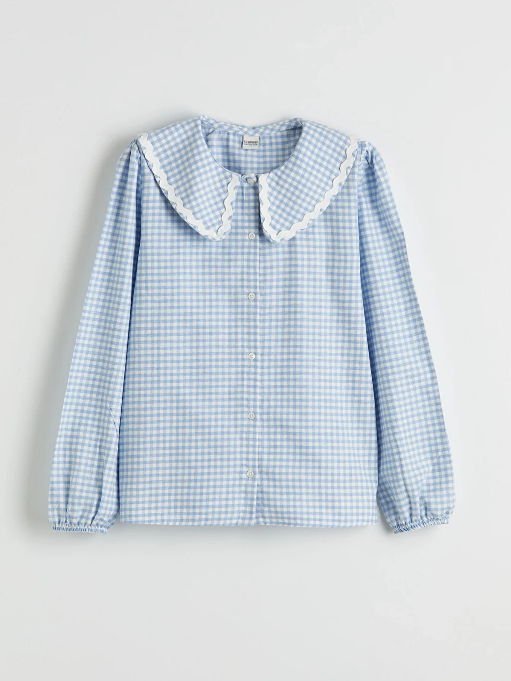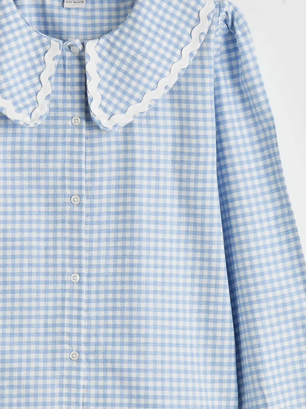 Ekose desenli, bebe yakalı ve uzun kollu kız çocuk gömlek, pamuklu poplin kumaştan üretilmiştir. Önden düğme kapamalıdır.