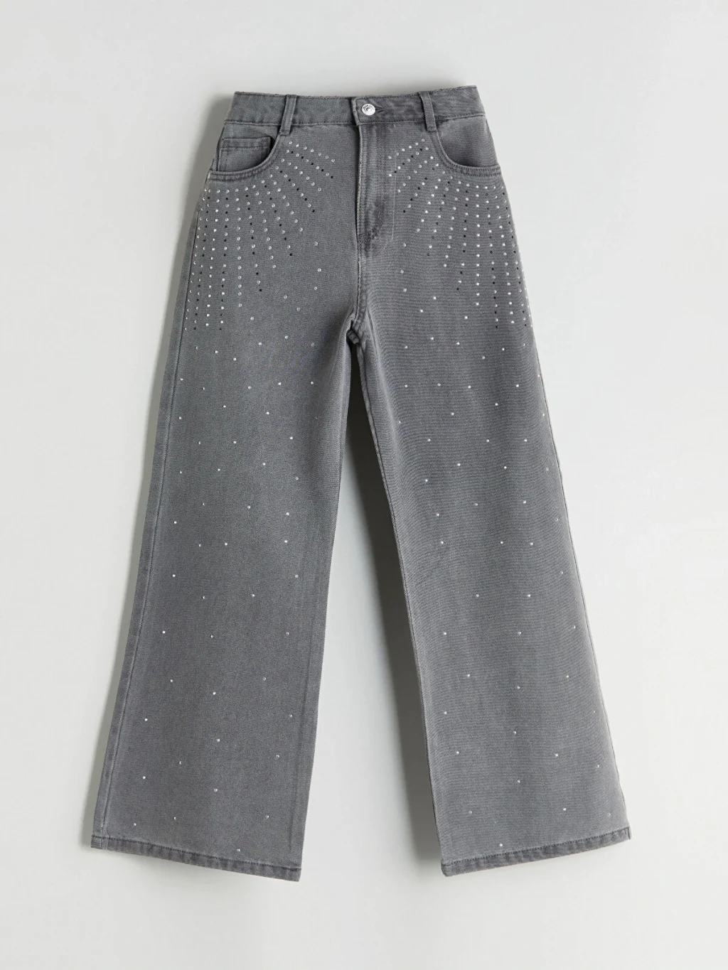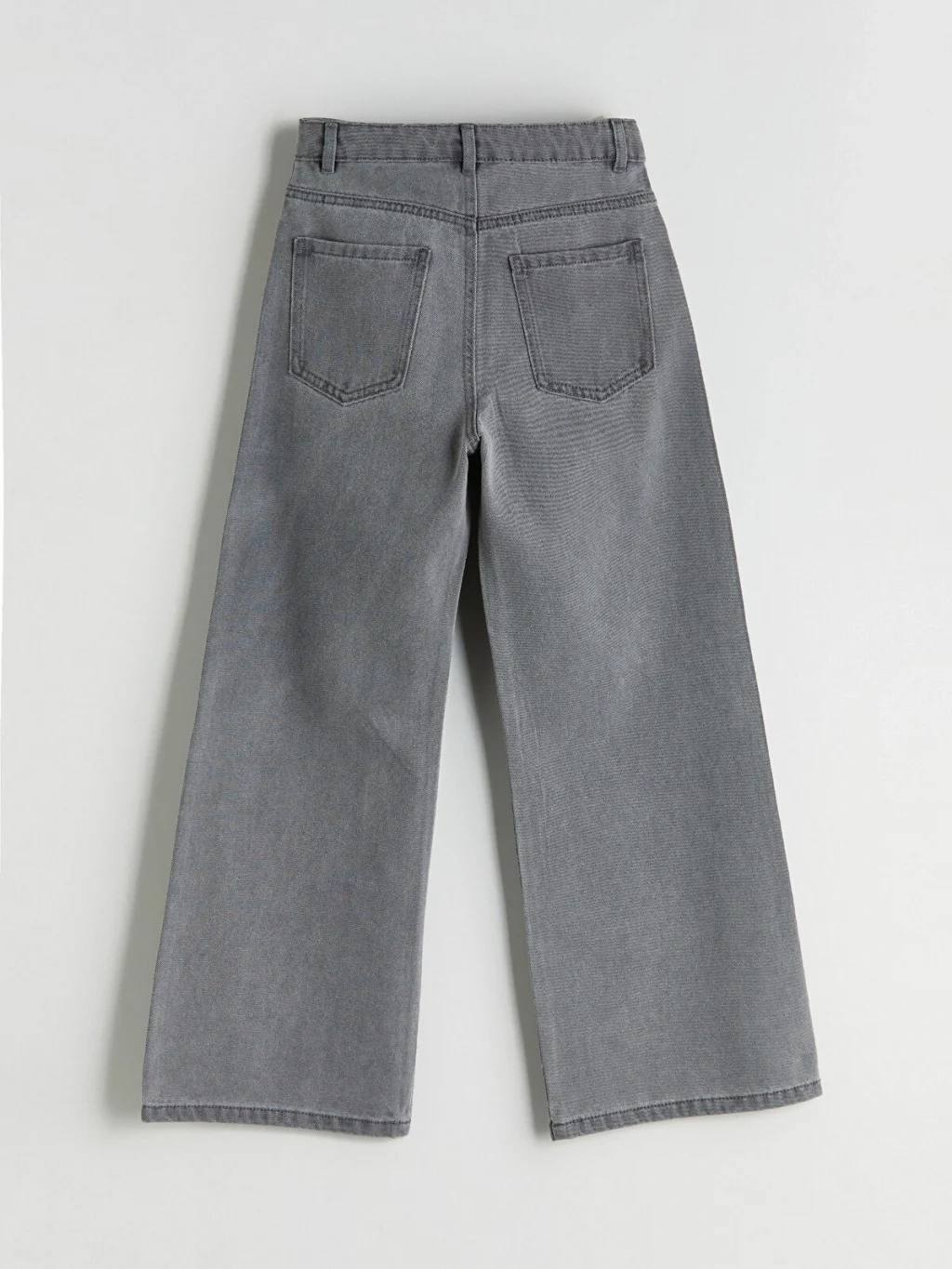 Wideleg kız çocuk denim pantolon, yüksek bel ve geniş paça kesime sahiptir. Beli içten ayarlanabilir lastiklidir.