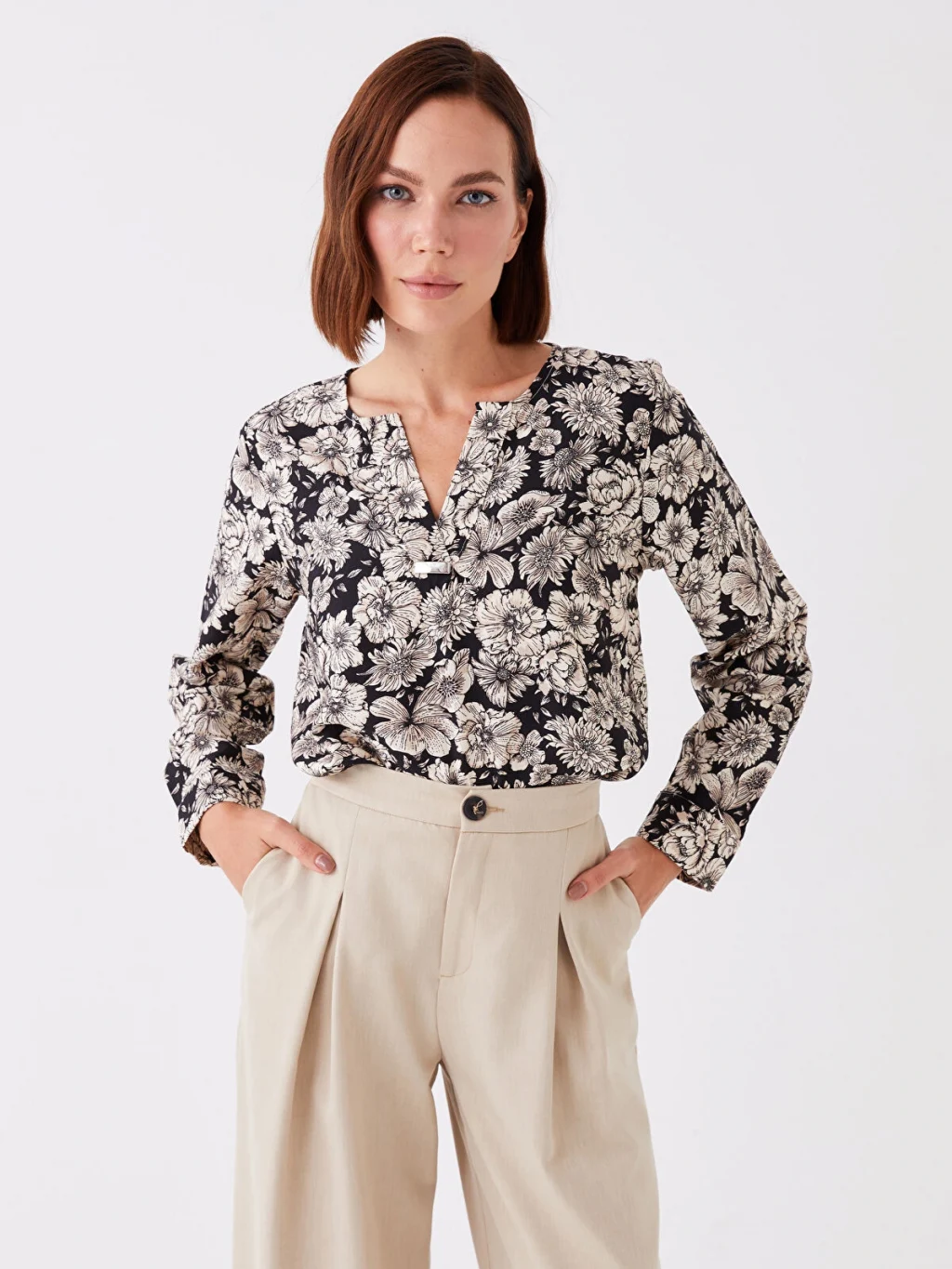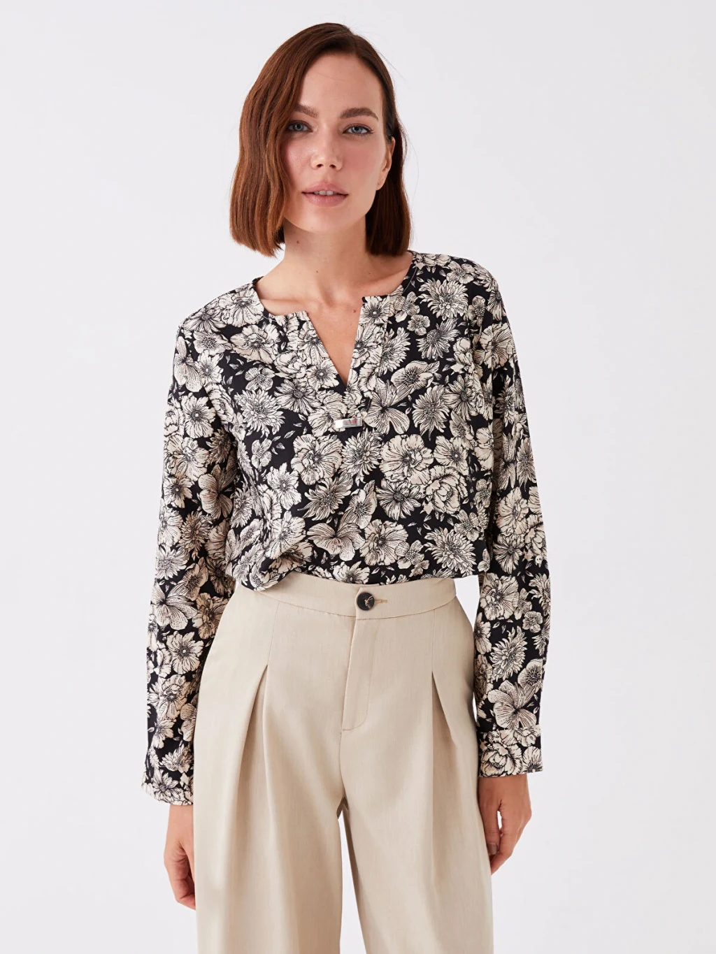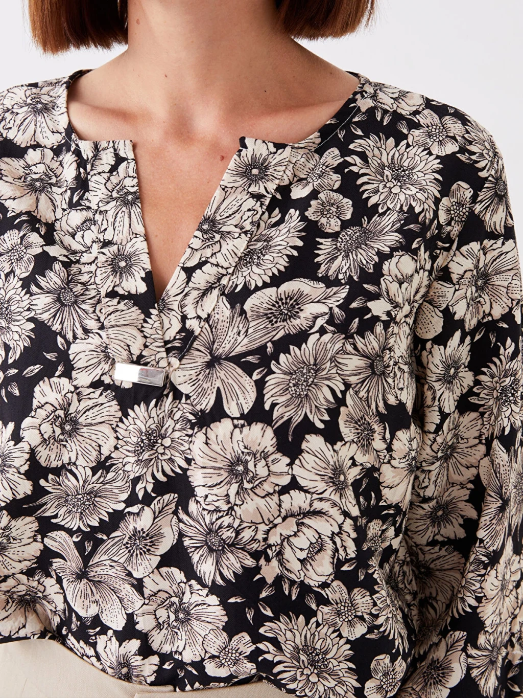 Çiçekli uzun kollu kadın bluz, jakar kumaştan üretilmiştir. Çiçek desenleriyle dikkat çeker. Kaçık yaka detayıyla özgün bir tarz oluşturur ve düğme detayları sayesinde kullanım kolaylığı sağlar. Rahat ve şık bir görünüm sunar.