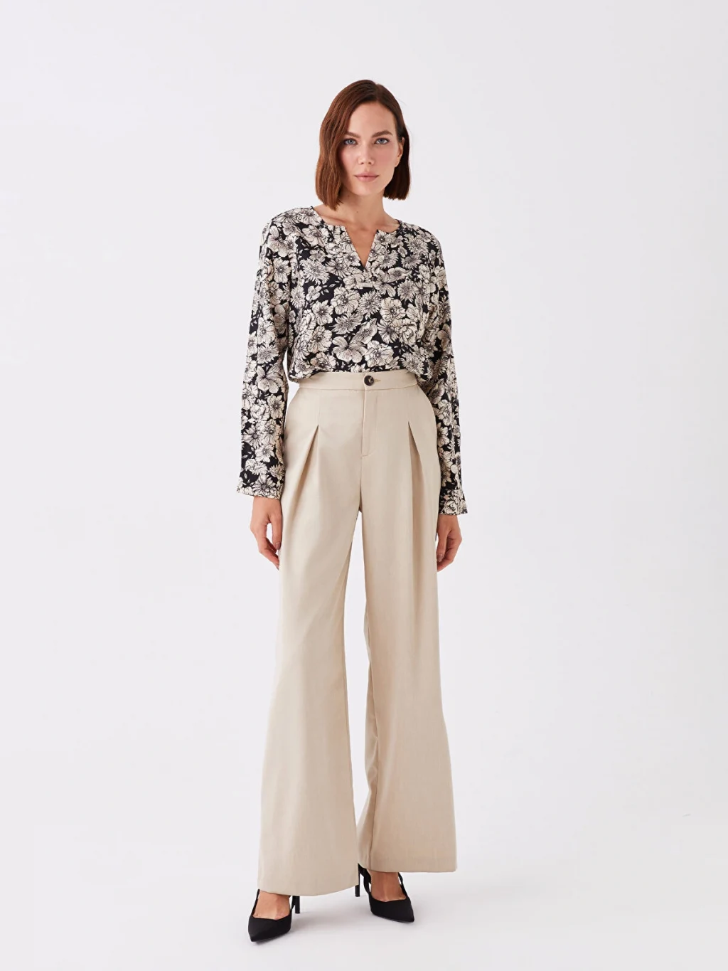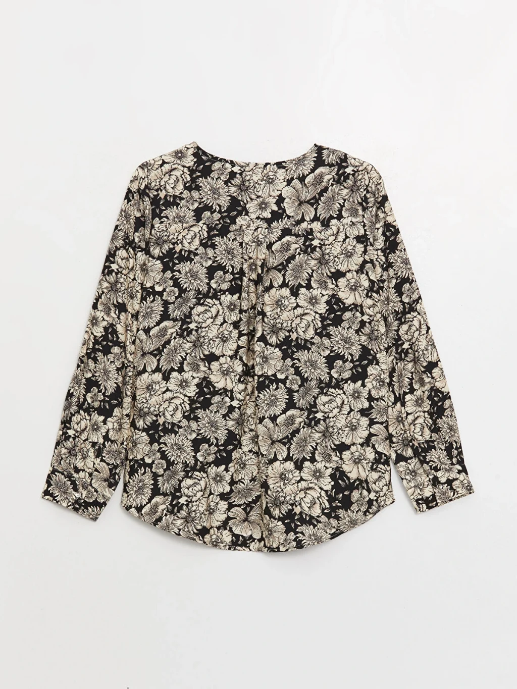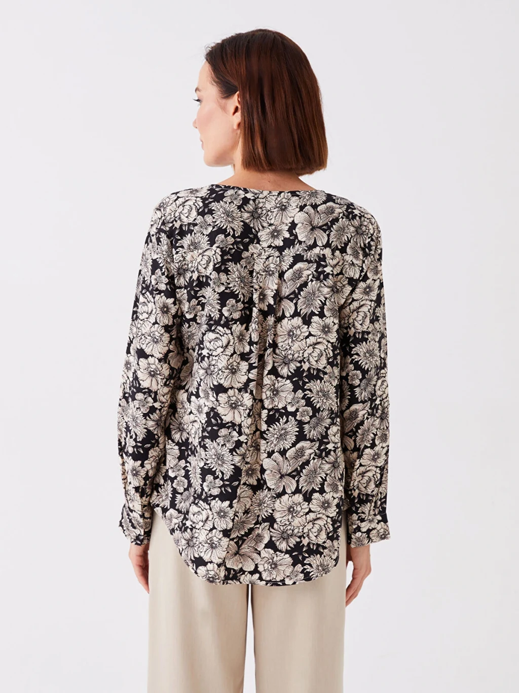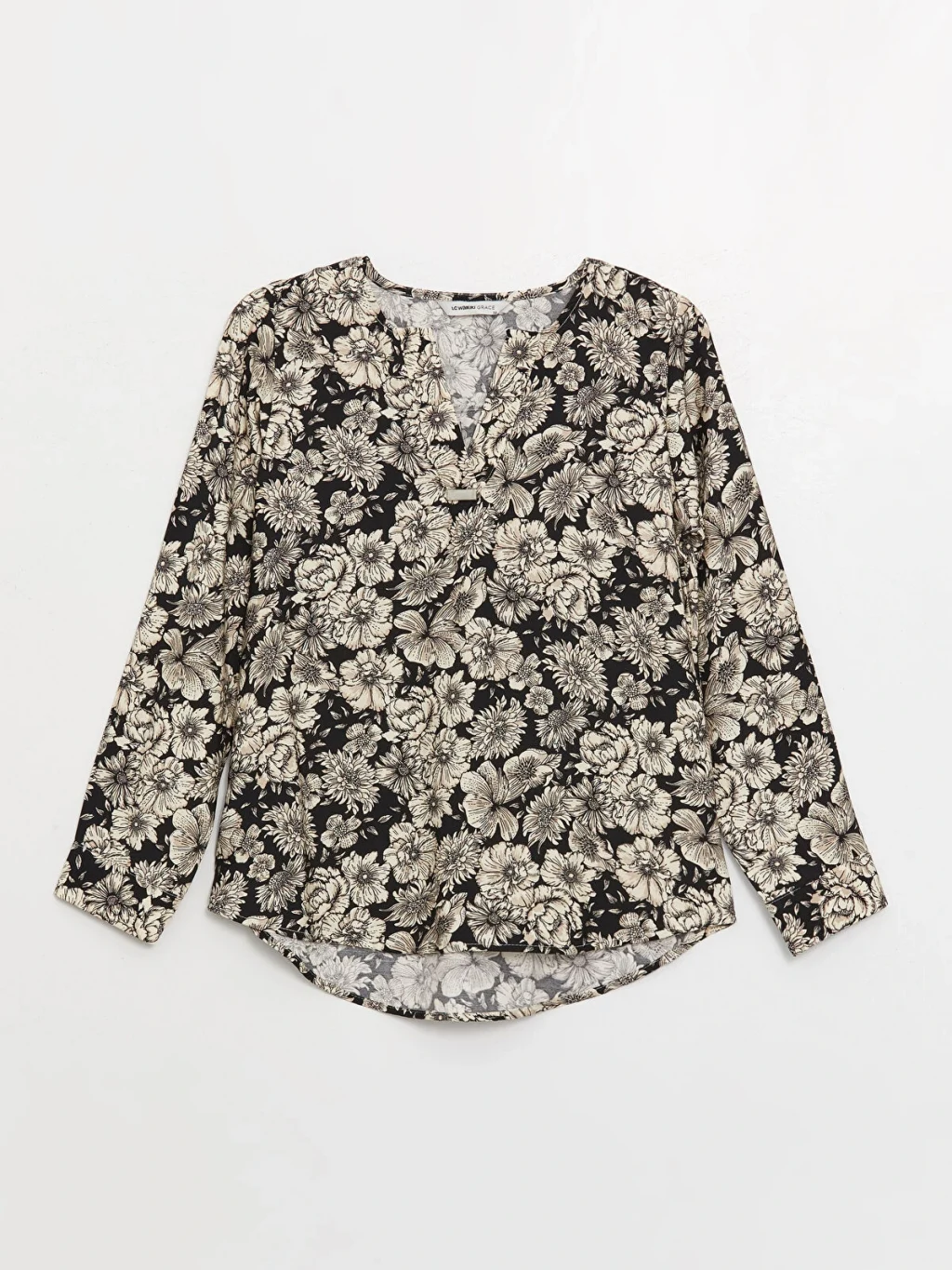 Çiçekli uzun kollu kadın bluz, jakar kumaştan üretilmiştir. Çiçek desenleriyle dikkat çeker. Kaçık yaka detayıyla özgün bir tarz oluşturur ve düğme detayları sayesinde kullanım kolaylığı sağlar. Rahat ve şık bir görünüm sunar.