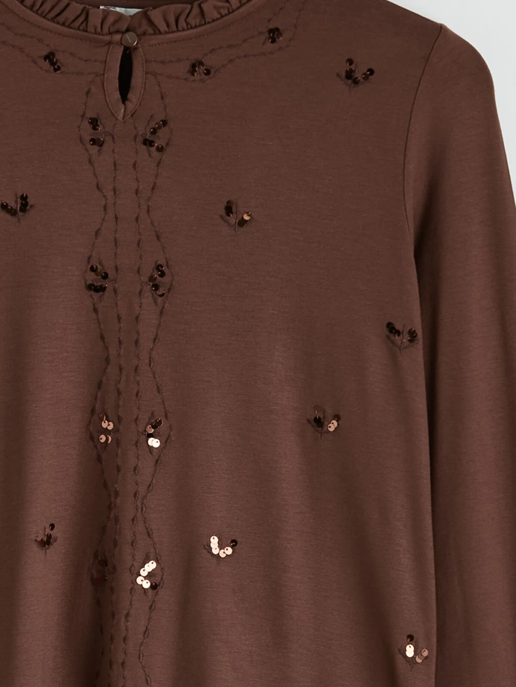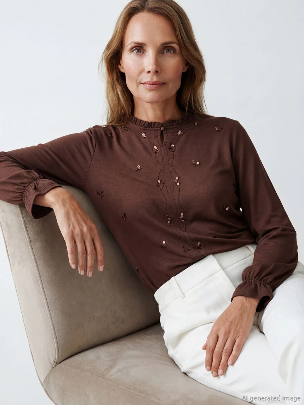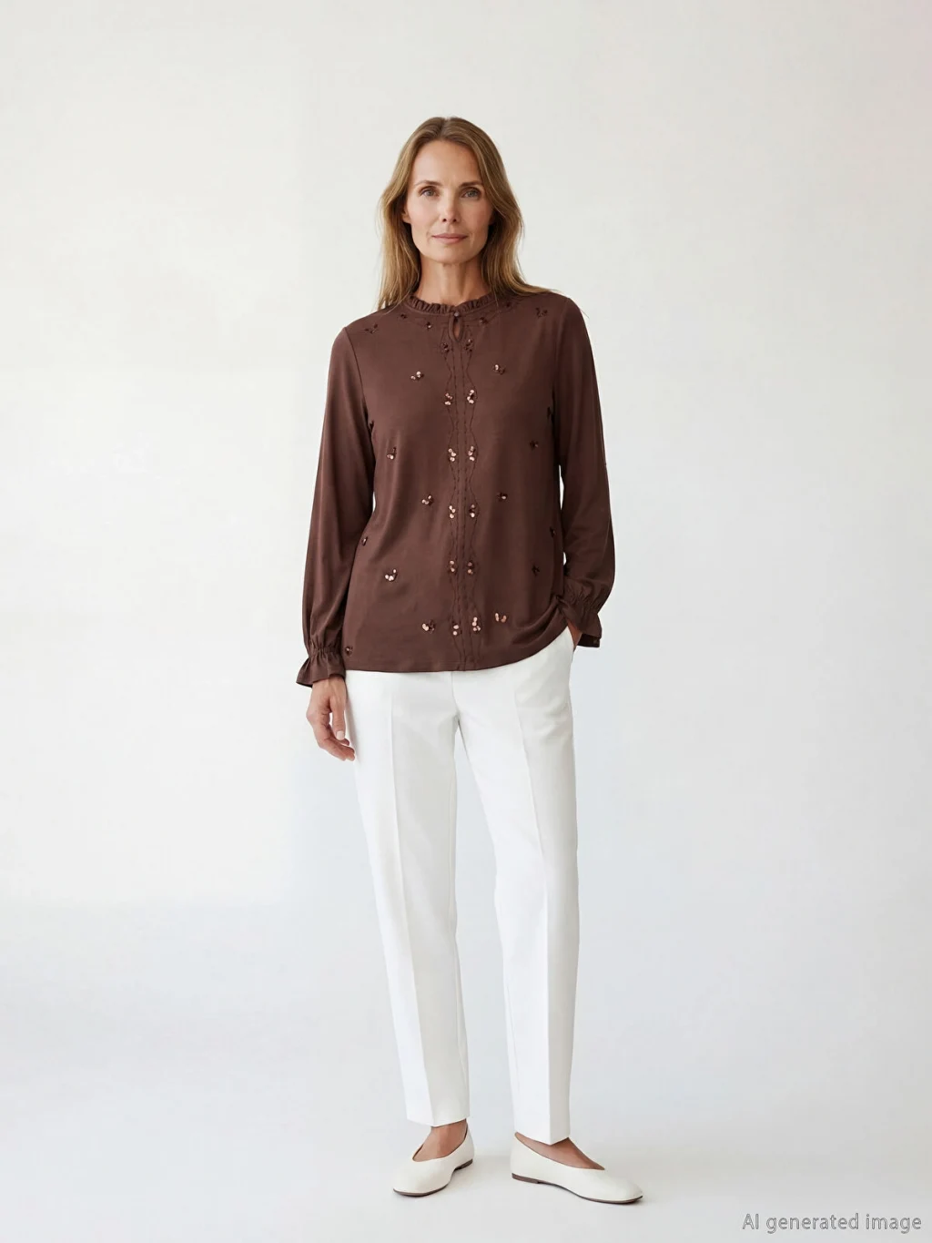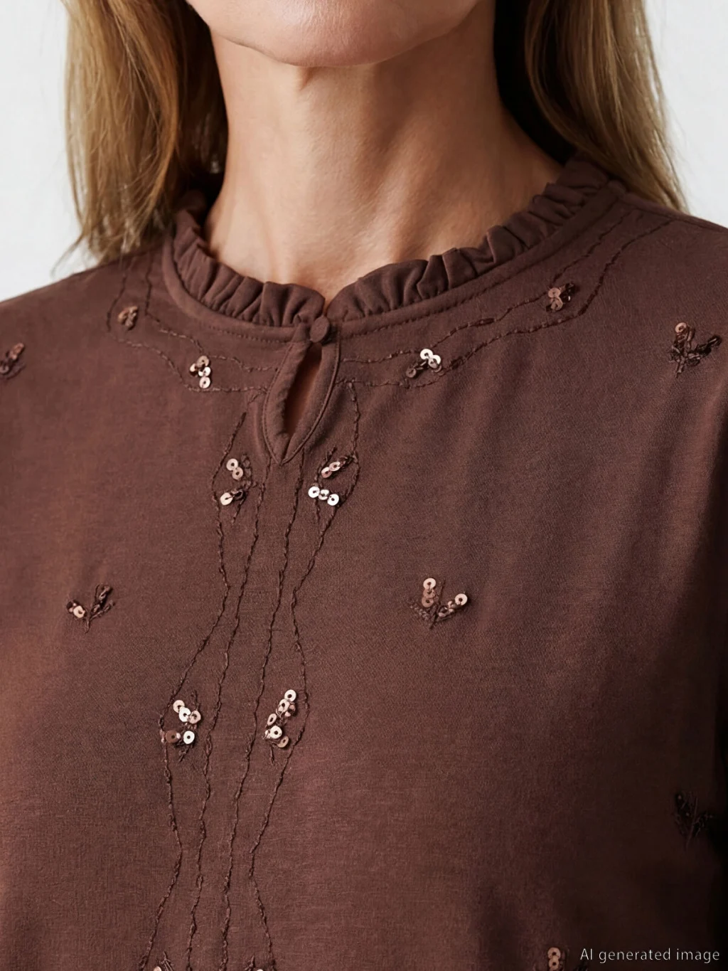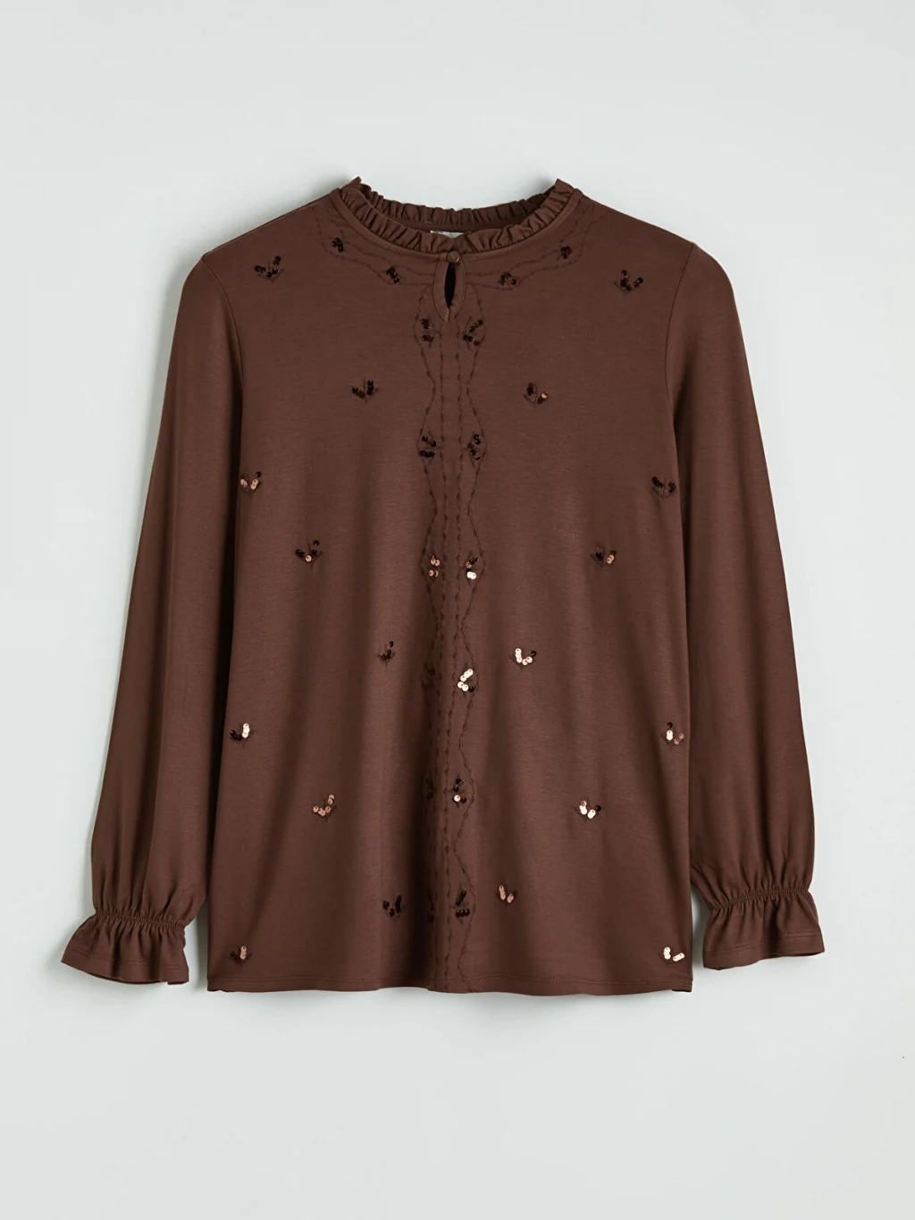Fırfırlı hakim yakalı ve yaka ortası pencereli kadın bluz, uzun kolludur. Kol uçları fırfırlı olup önü nakış ve pul payet işlemelidir.