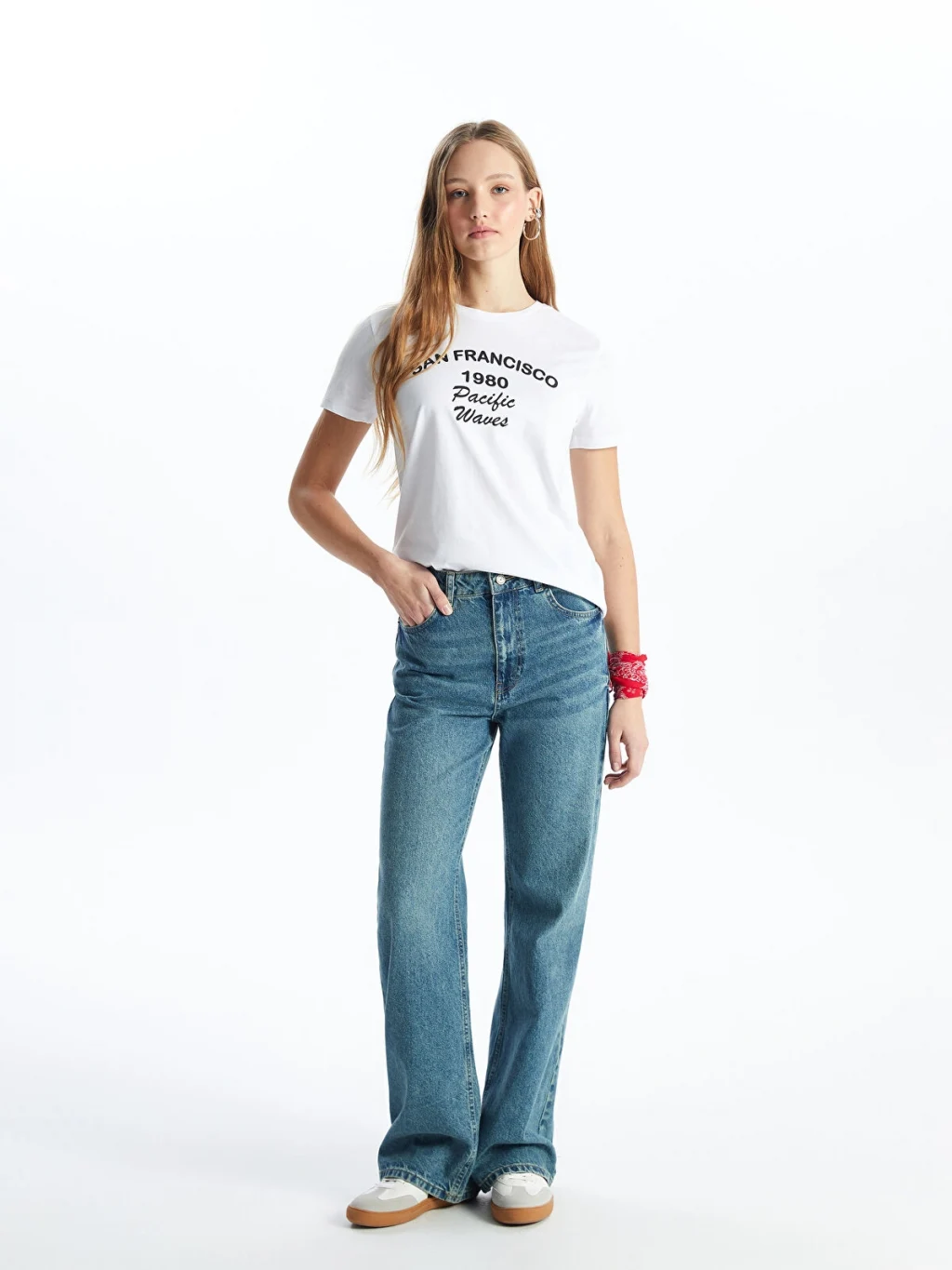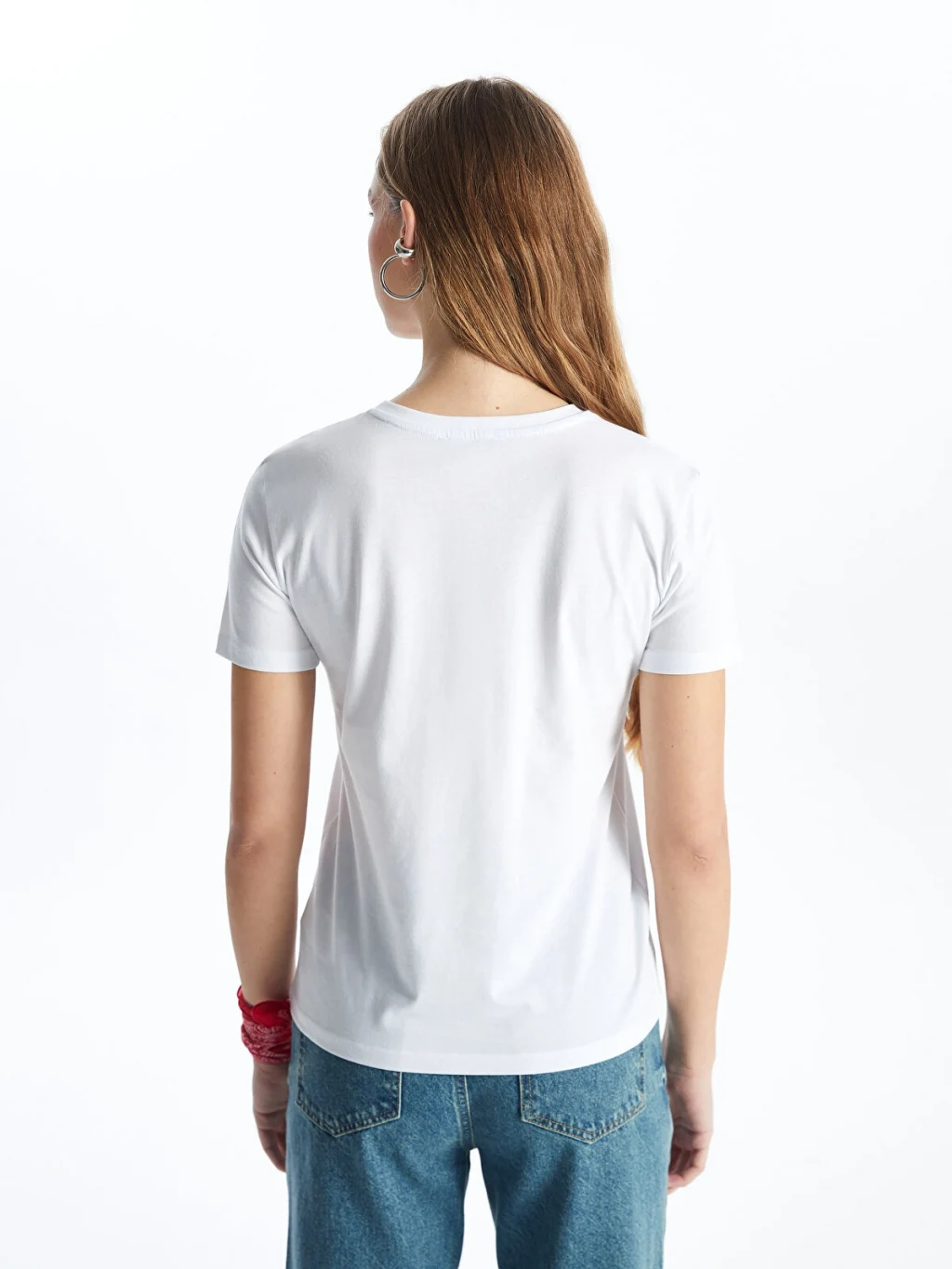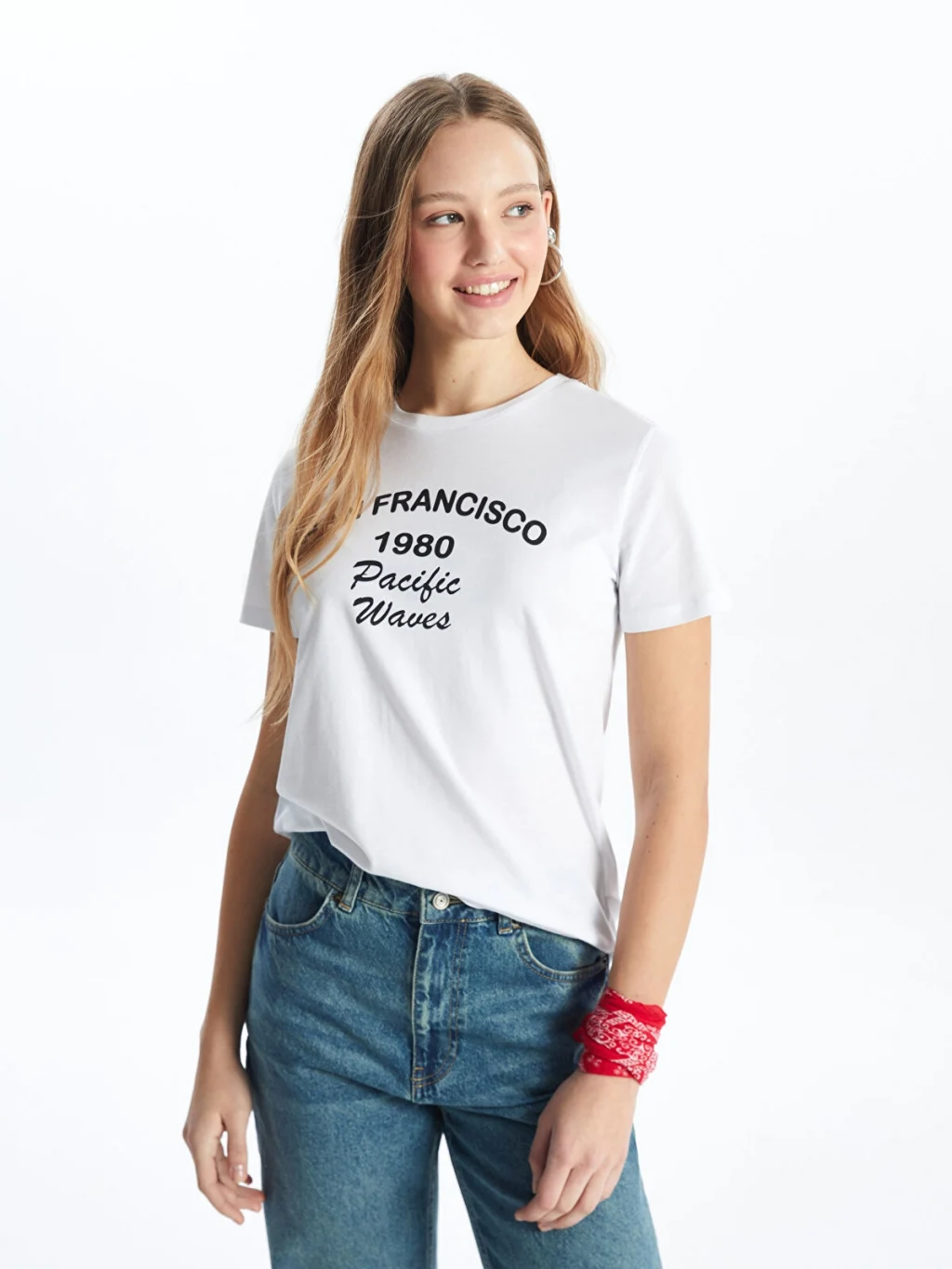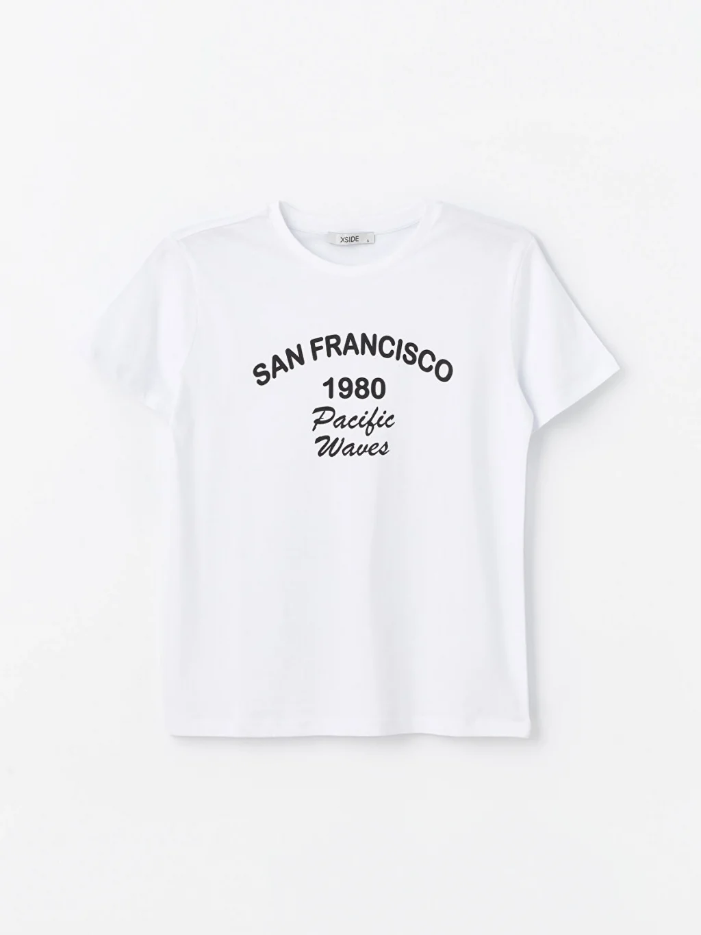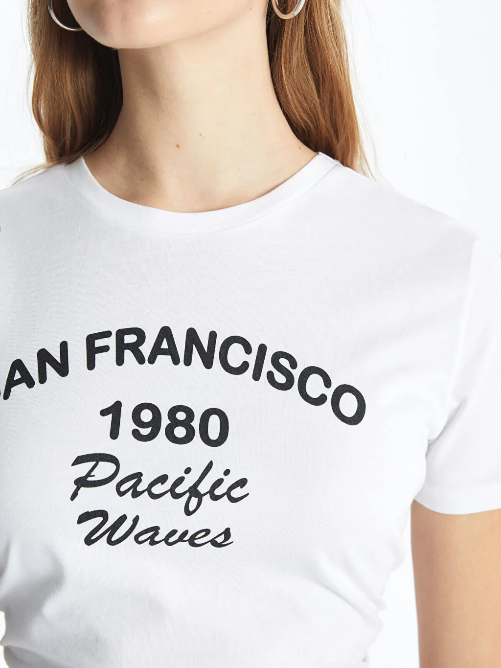 Standart kalıp, bisiklet yaka ve kısa kollu kadın tişört, %100 pamuklu penye kumaştan üretilmiştir ve önü yazı baskılıdır.