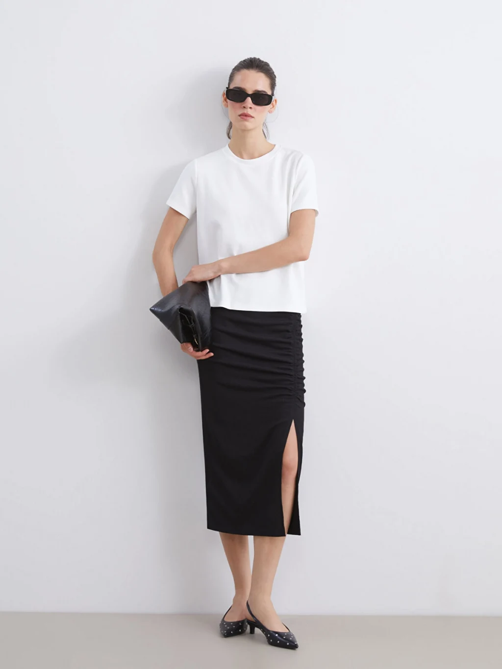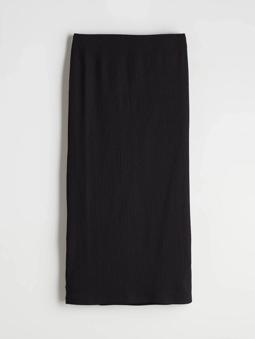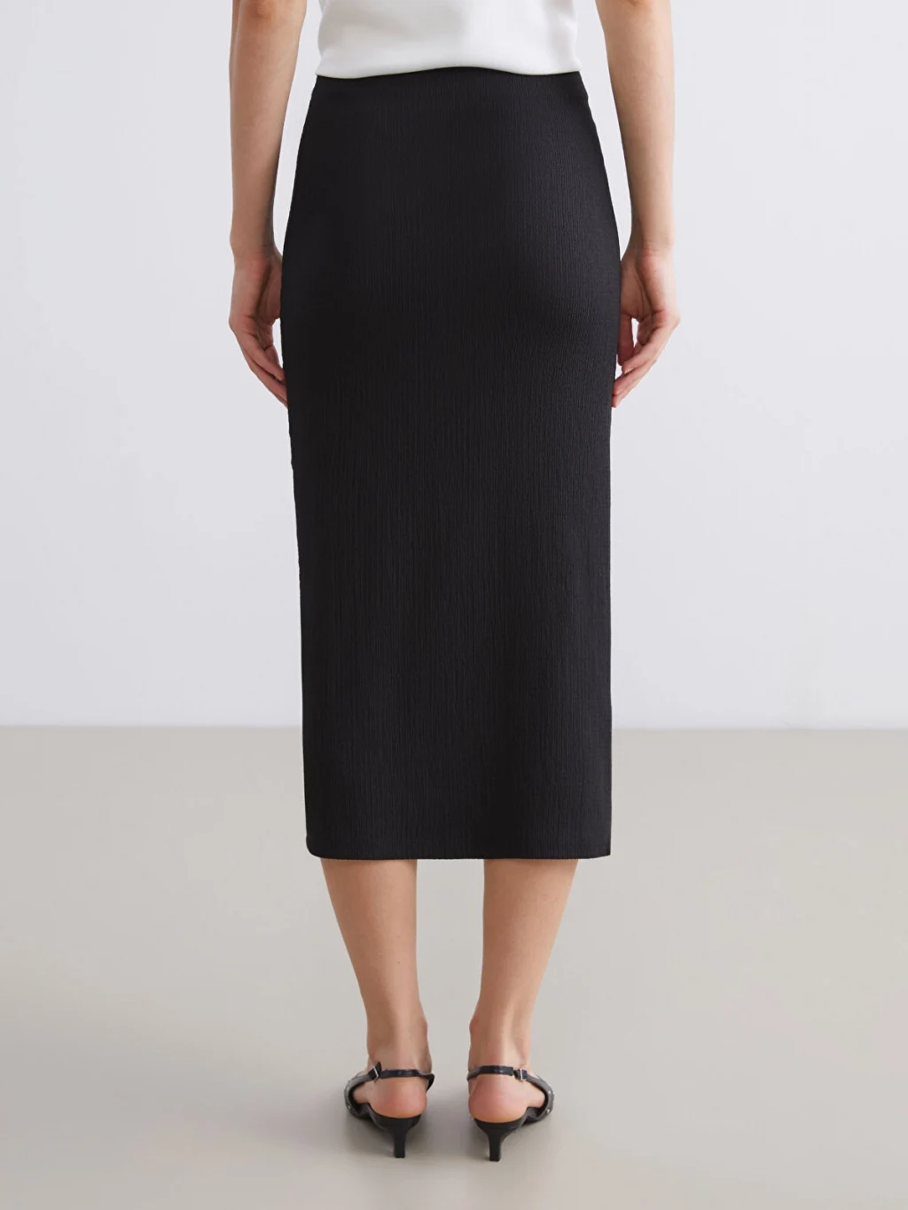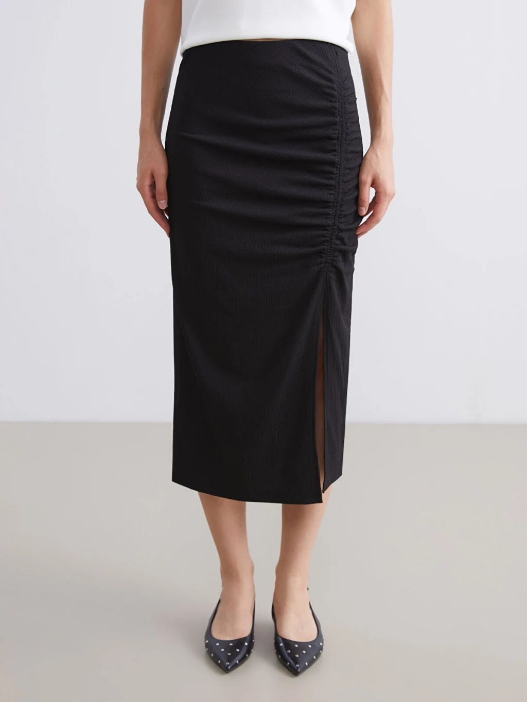 Beli lastikli dokulu kadın etek, raşel kumaştan üretilmiştir. Büzgülü ve yırtmaçlı tasarıma sahiptir.