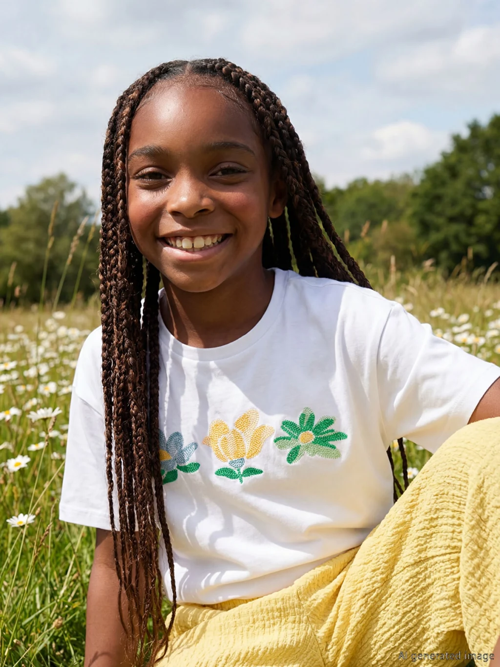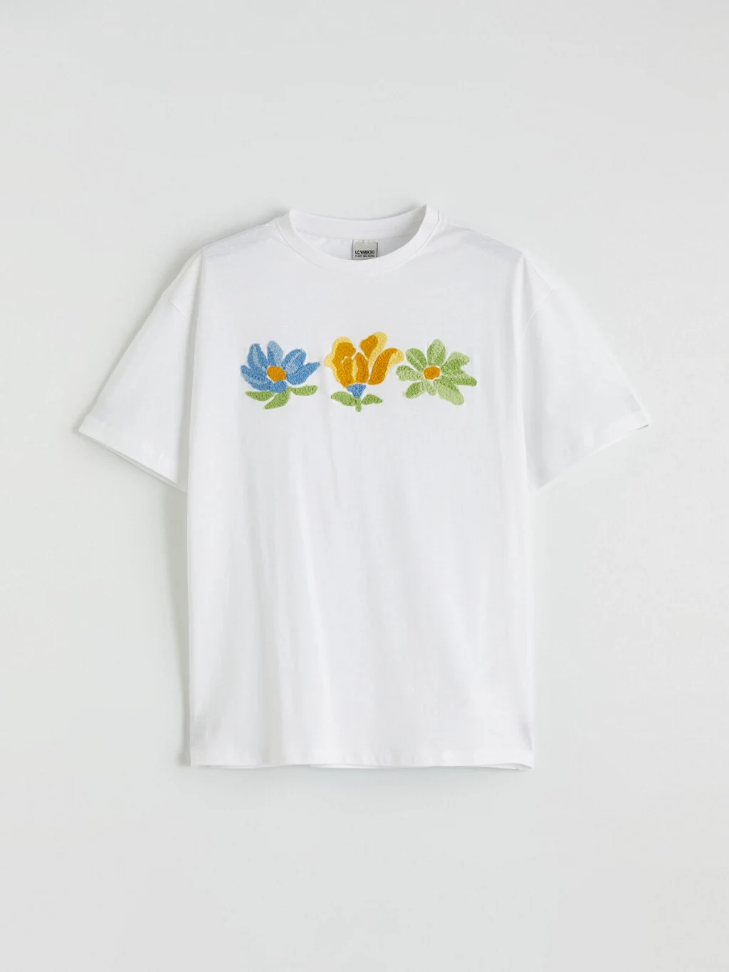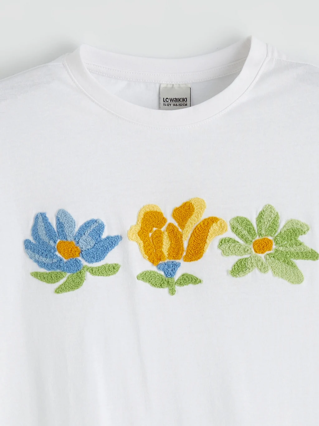 Bisiklet yaka ve kısa kollu, önü çiçek nakışlı kız çocuk tişört, %100 pamuk penye kumaştan üretilmiştir.