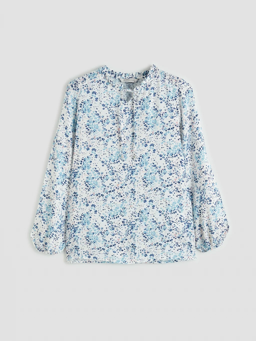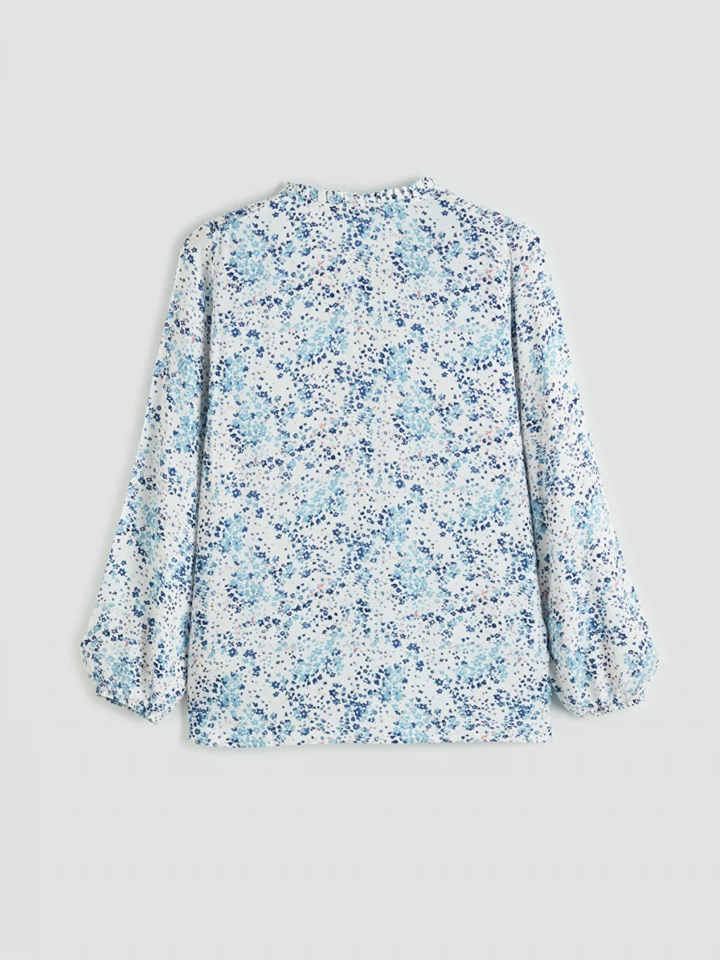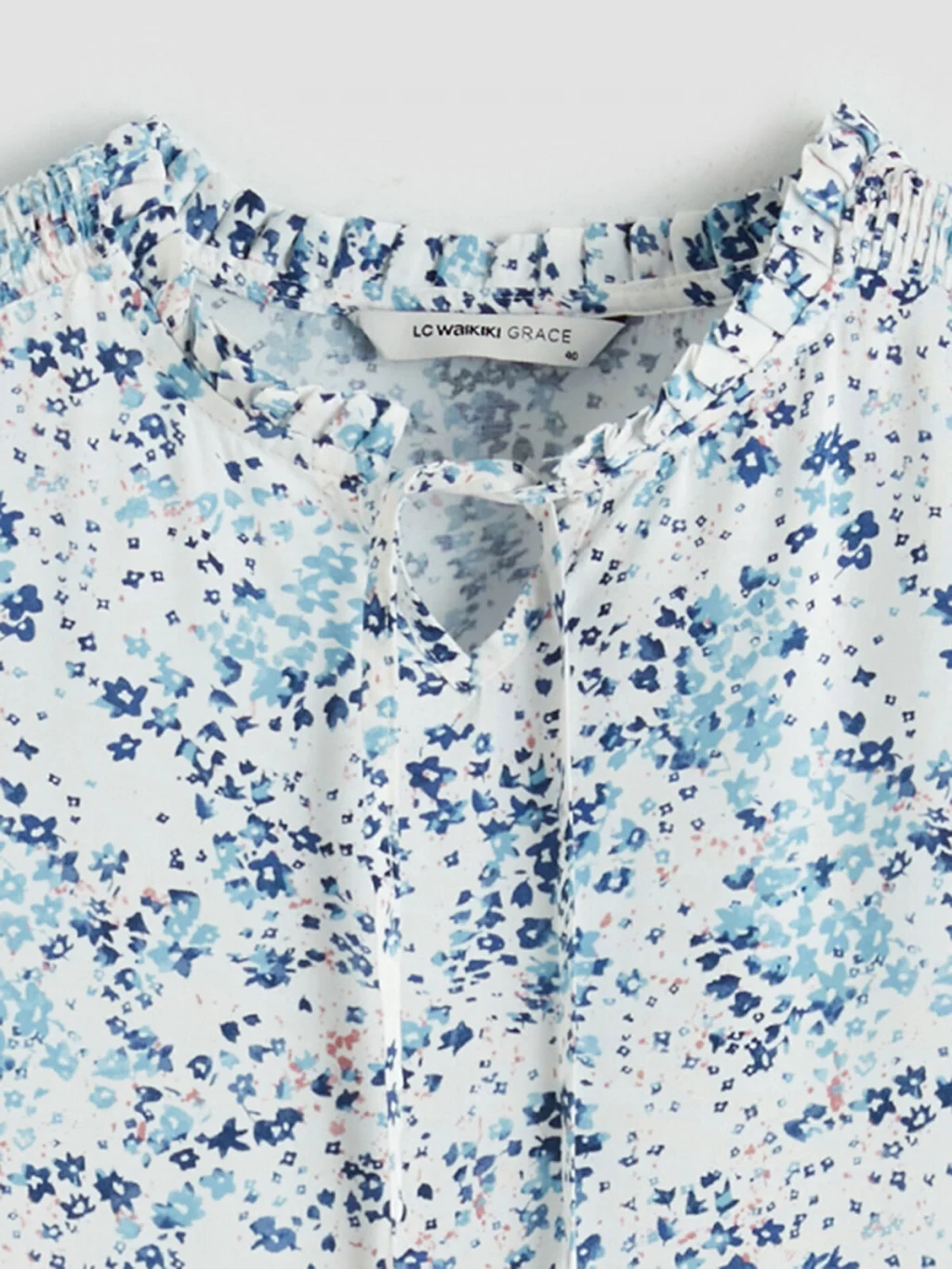 Bağlamalı yakası fırfır detaylı kadın bluz, uzun kolludur ve kol uçları lastiklidir. V yaka kesimlidir ve baştan sona desenlidir.