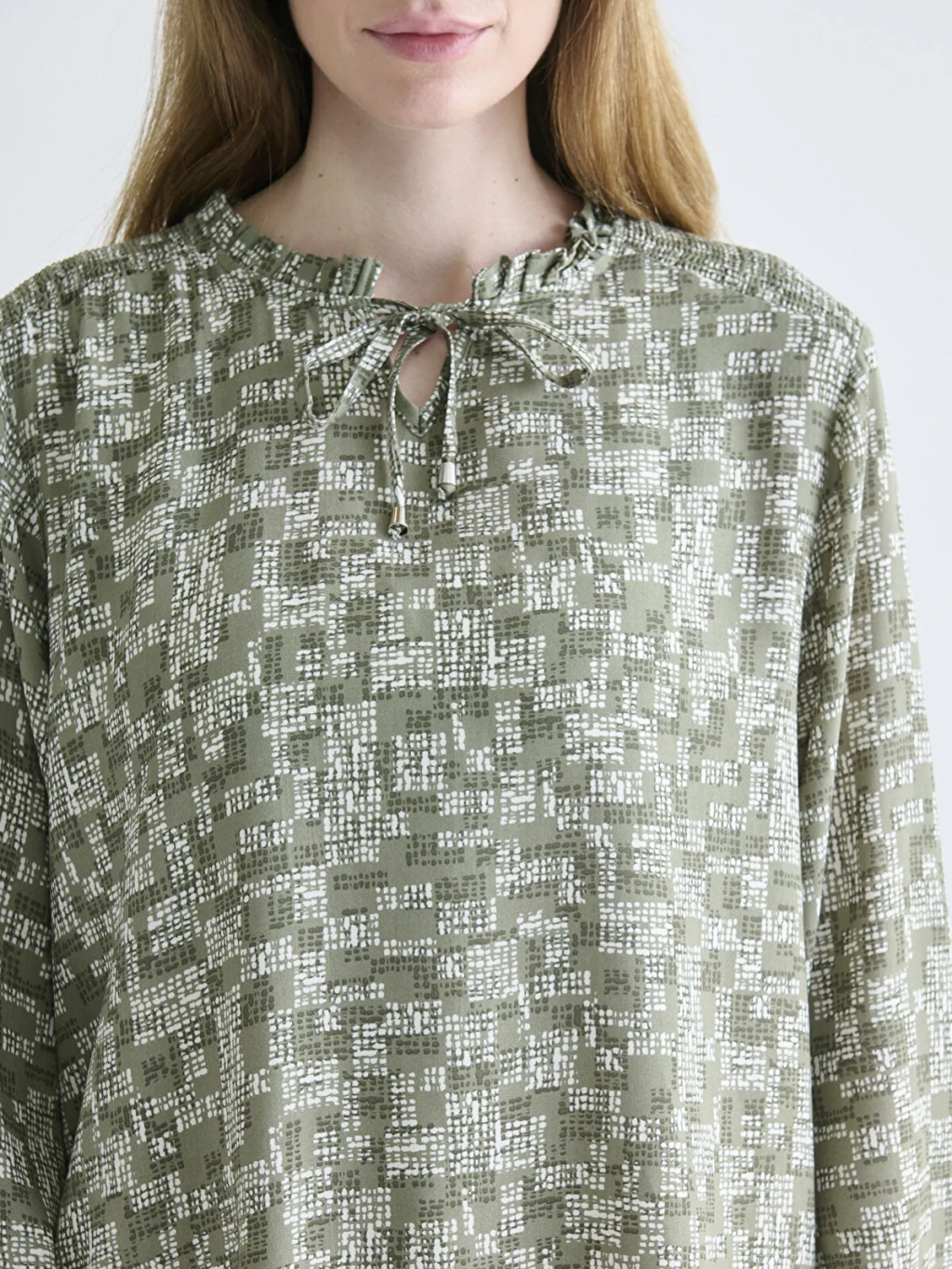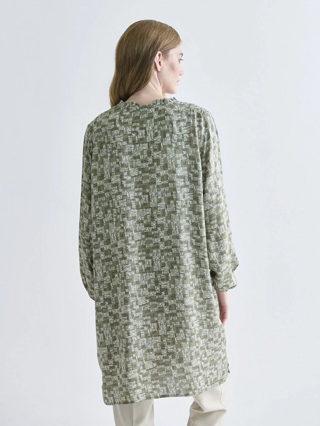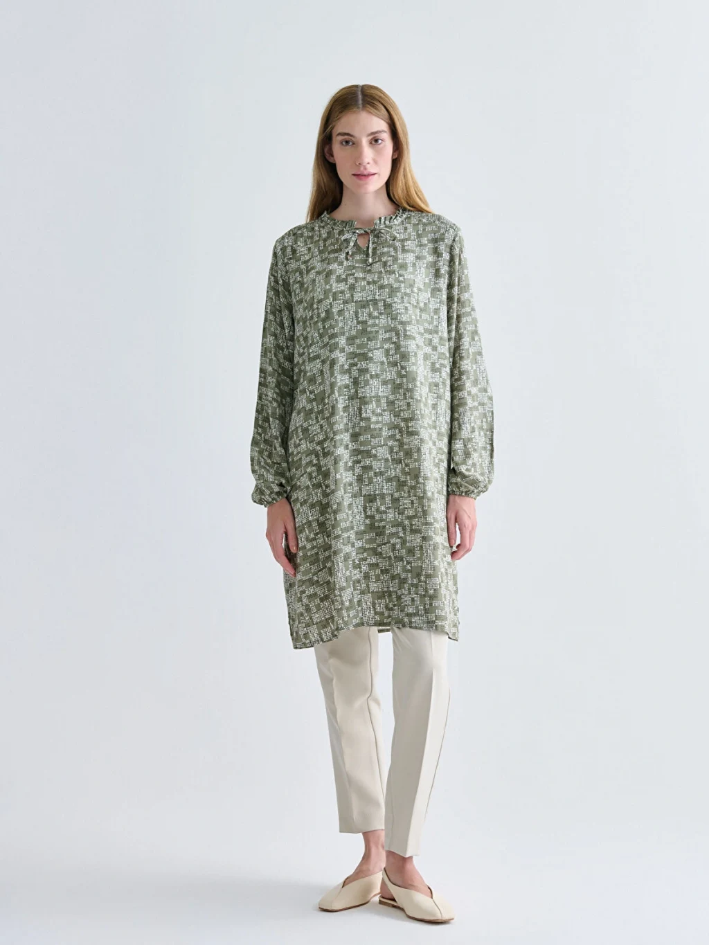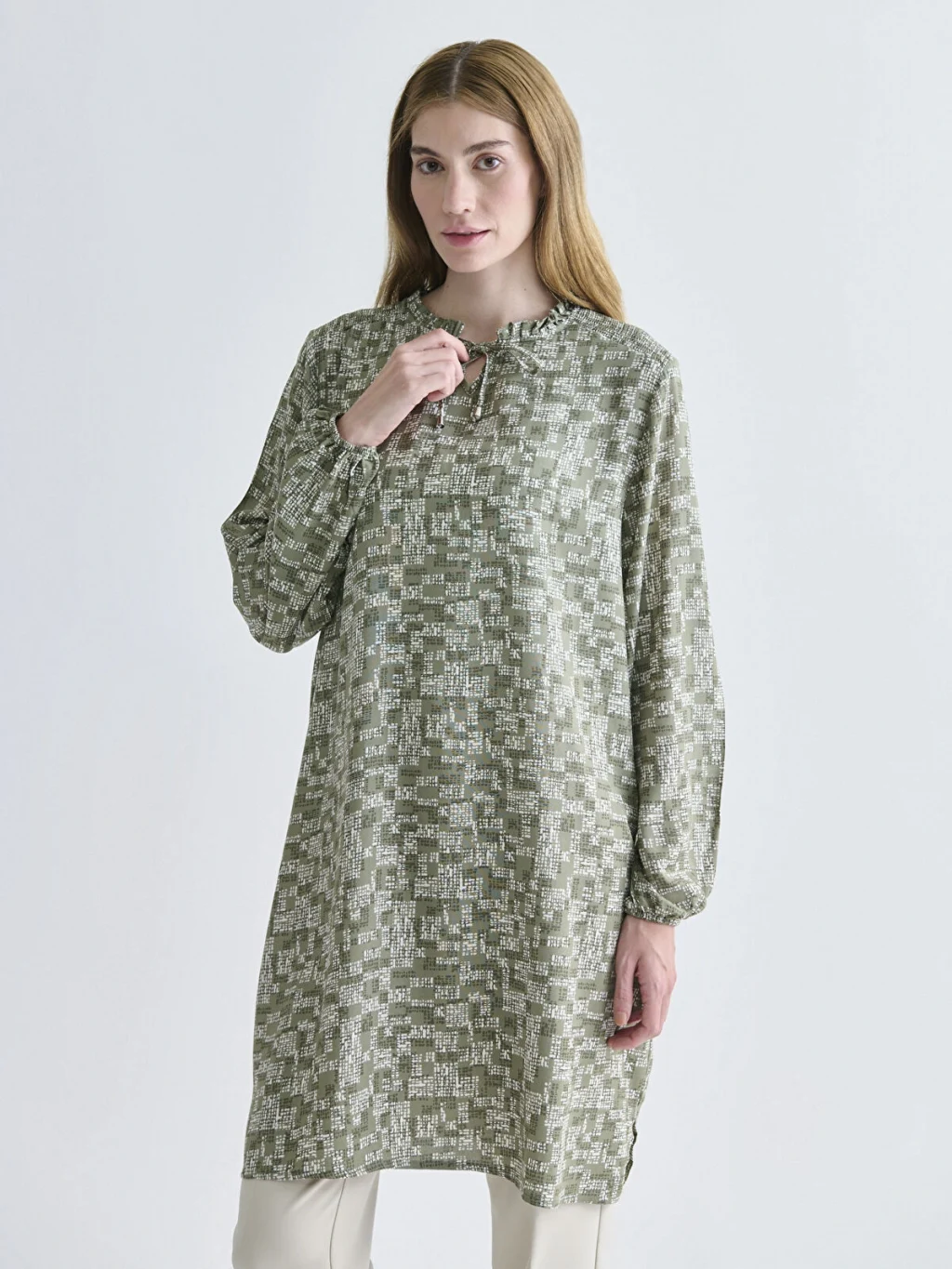 Desenli kadın tunik, fırfırlı ve bağlama detaylı yaka tasarıma sahiptir. Uzun kollu modelin kol uçları lastiklidir ve etek ucu yanları yırtmaçlıdır.