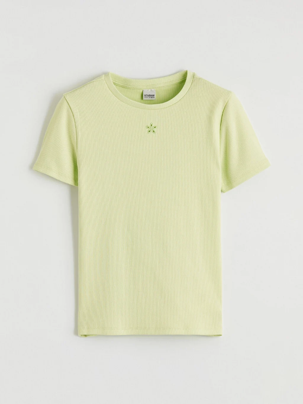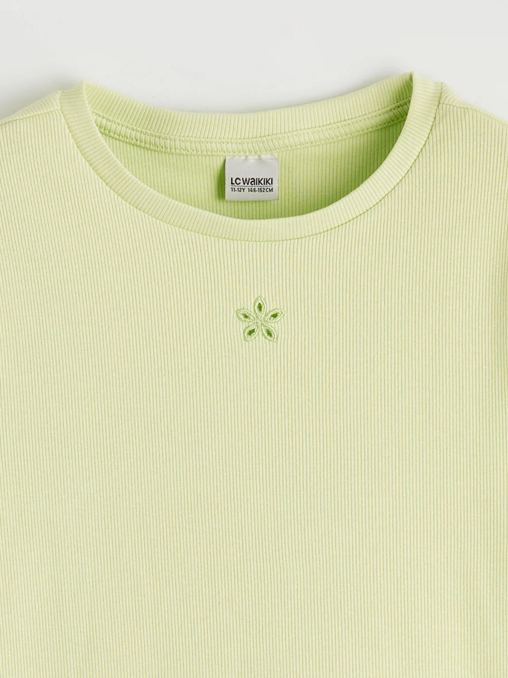 Bisiklet yaka ve kısa kollu kız çocuk tişört, kaşkorse kumaştan üretilmiştir ve göğüs kısmında nakış detayı bulunmaktadır.