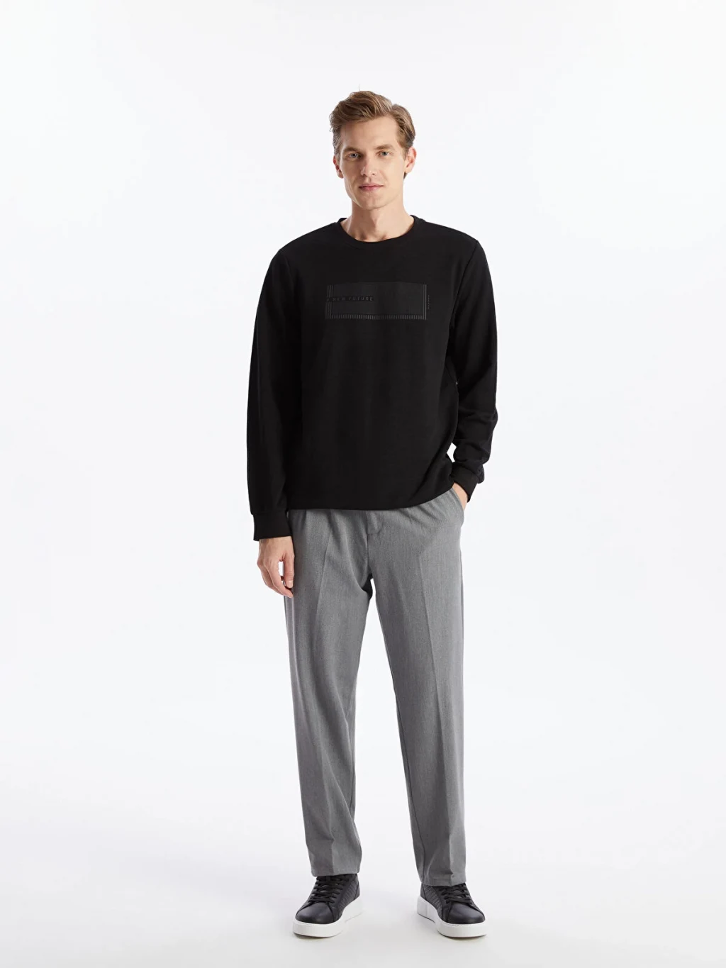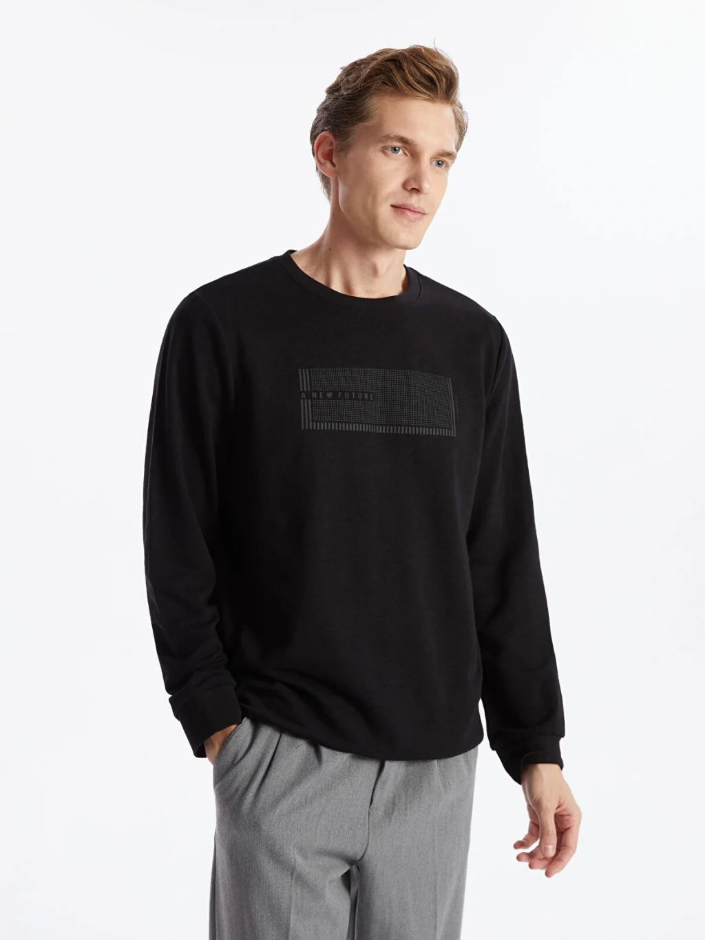 Bisiklet yaka, uzun kollu erkek sweatshirt, 3 iplik kumaştan üretilmiştir. Kol uçları ve alt kısmı ribanalıdır ve önü baskı detaylıdır.