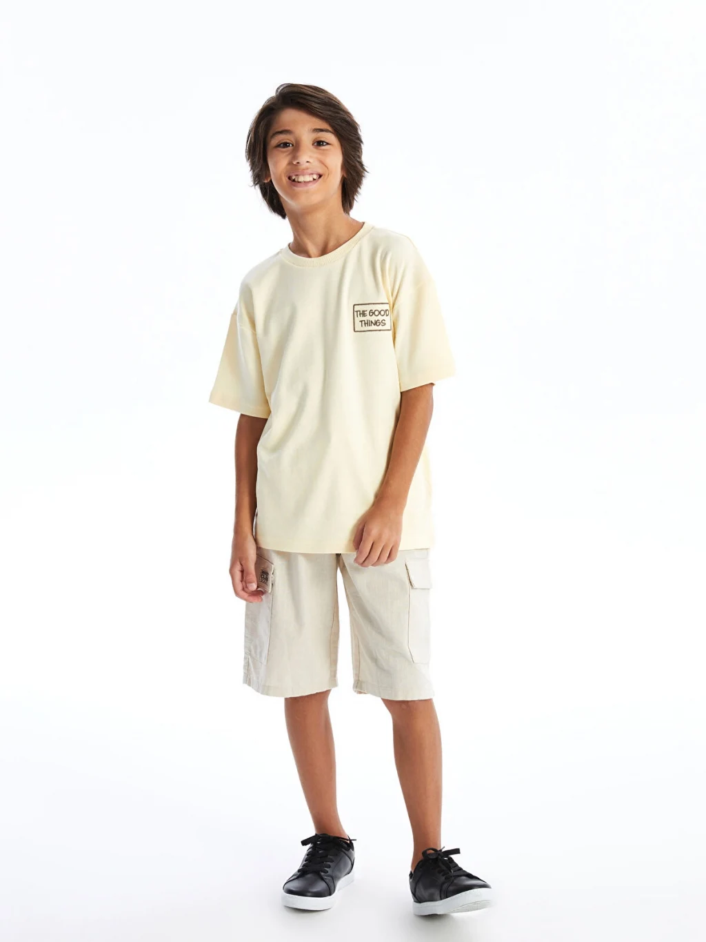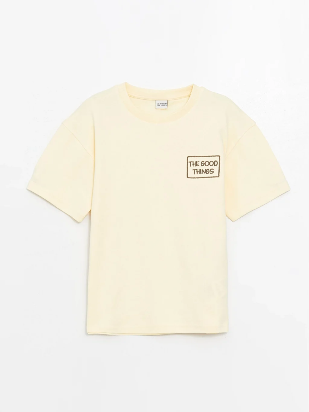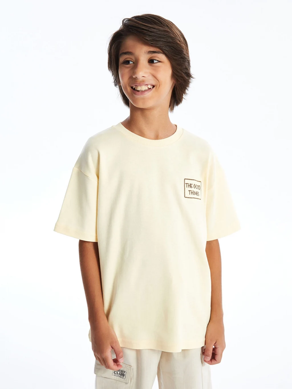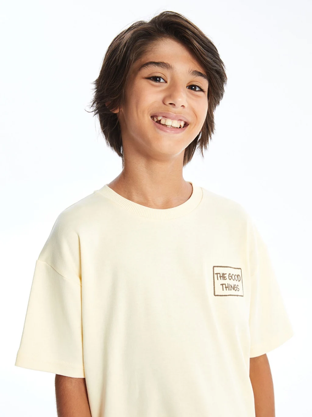 Rahat kalıplı erkek çocuk tişört, %100 pamuklu penye kumaştan üretilmiştir. Bisiklet yakalı, kısa kollu ve önü baskılıdır.
