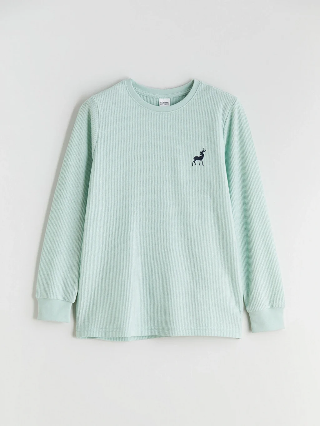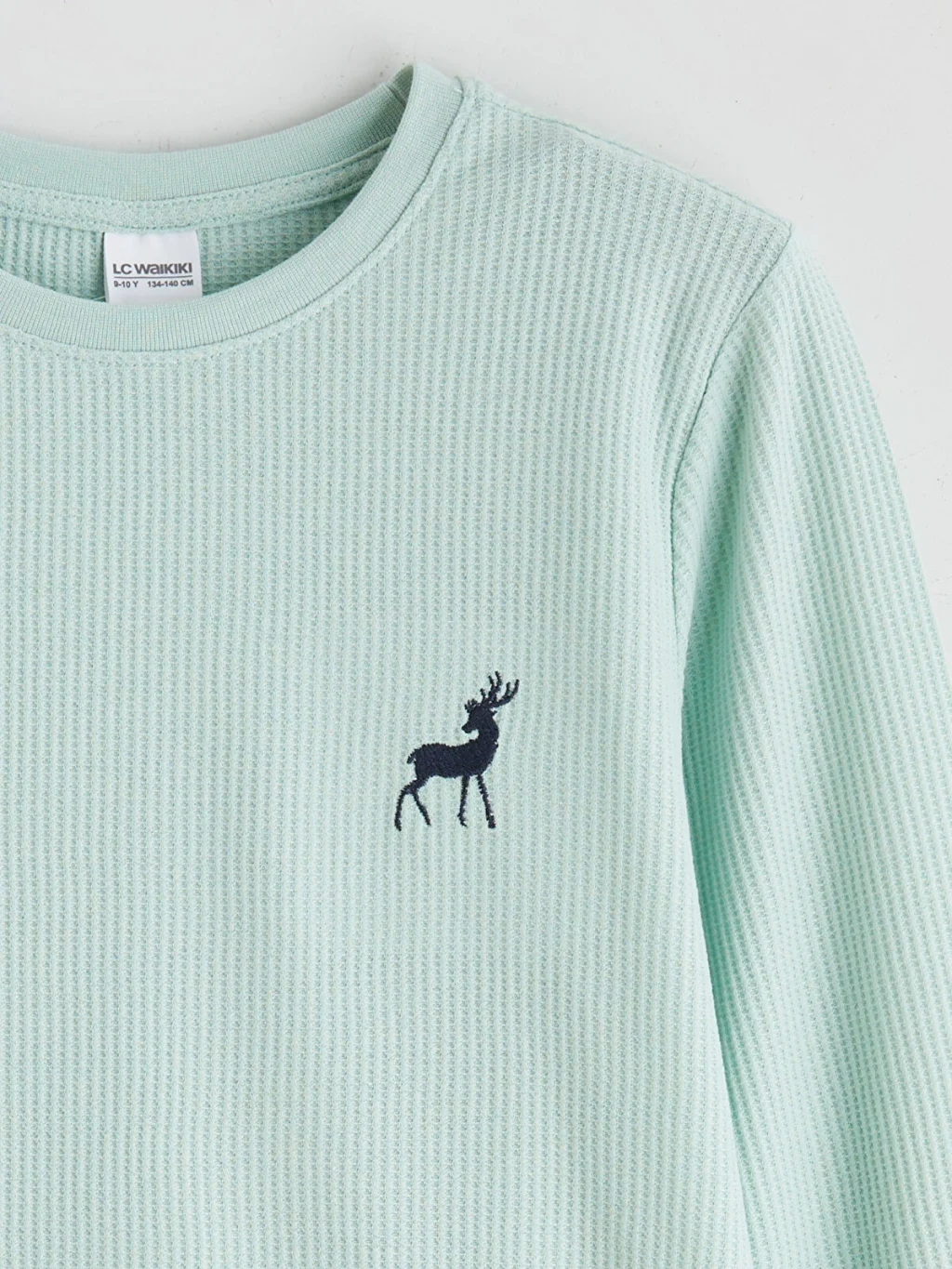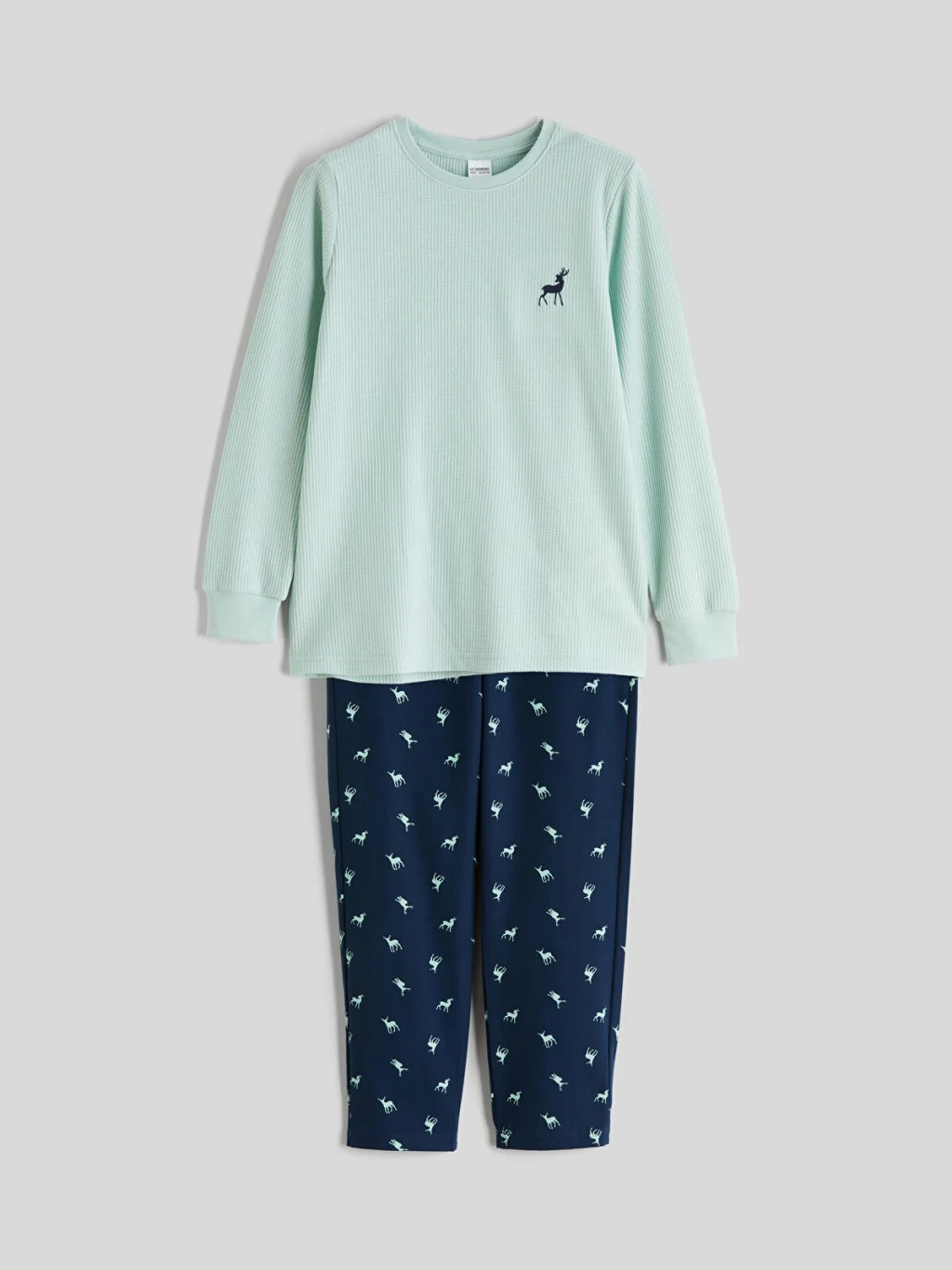 %100 pamuk waffle kumaştan üretilen erkek çocuk pijama takımı, bisiklet yaka, uzun kollu üst ve desenli alt parçadan oluşmaktadır.